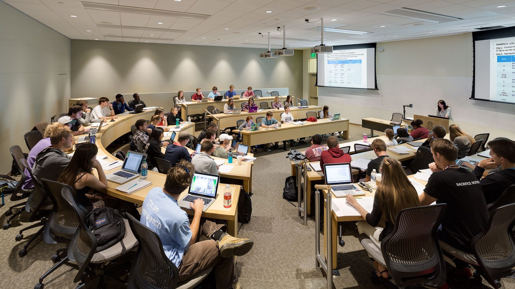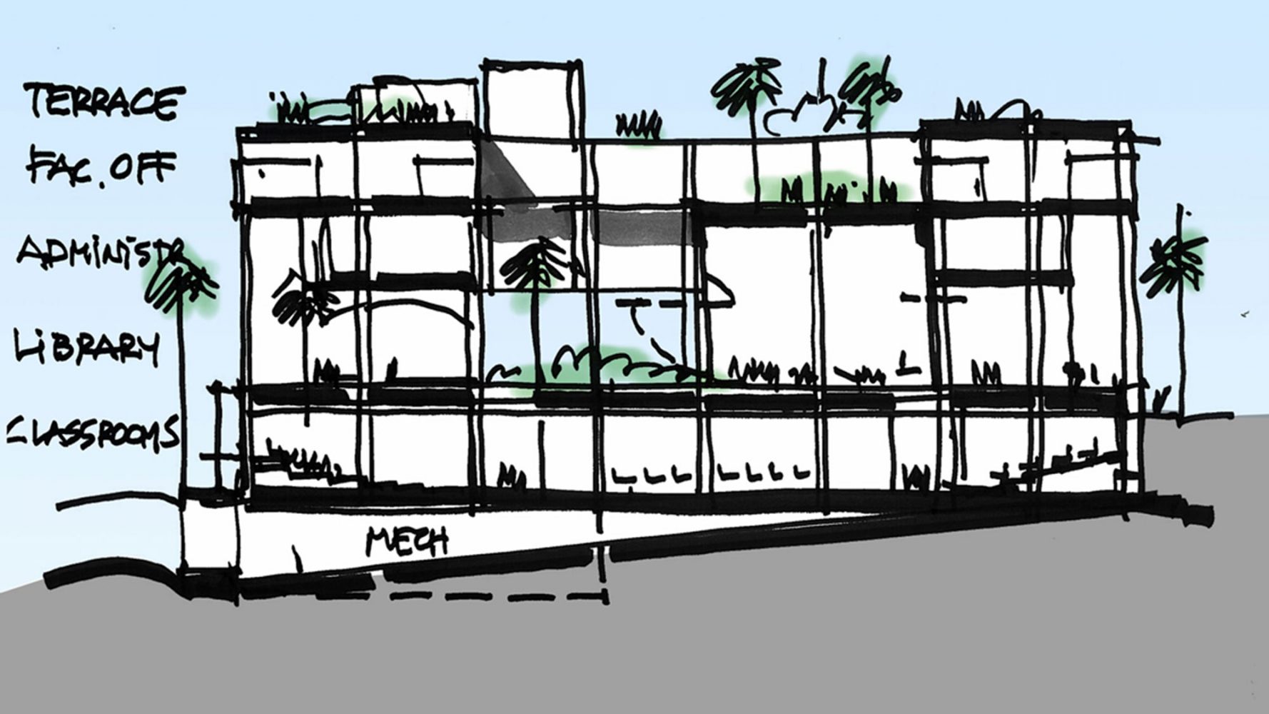 El programa del edificio estimula el aprendizaje mediante los métodos tecnológicos más modernos, como una sala de operaciones financieras con servicios de información instantánea de cotizaciones de bolsa y aulas equipadas con tecnología de telepresencia. Una cubierta verde, junto con el patio de palmas y las terrazas, promueven la interacción y la colaboración entre profesores, alumnos y miembros de la comunidad.