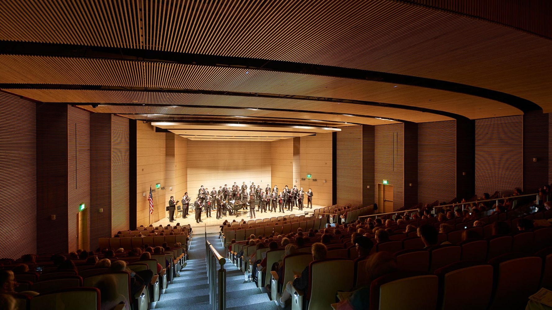 El diseño del edificio aprovecha las marcadas pendientes del terreno, con vistas magníficas del río Congaree desde los pisos superiores, y alberga en el plinto de la base los auditorios, aulas y otros espacios que exigen una mínima cantidad de luz natural. Los niveles superiores envuelven el patio con cada planta que se extiende según las necesidades programáticas y ahorra energía gracias al sombreado automático pasivo de los pisos inferiores. Otros elementos proporcionan sombra a los pisos superiores. El auditorio, con capacidad para 500 personas, se ha diseñado para las presentaciones de la Escuela de música, así como para las sesiones plenarias y grandes reuniones universitarias, además de las conferencias de la escuela de negocios.