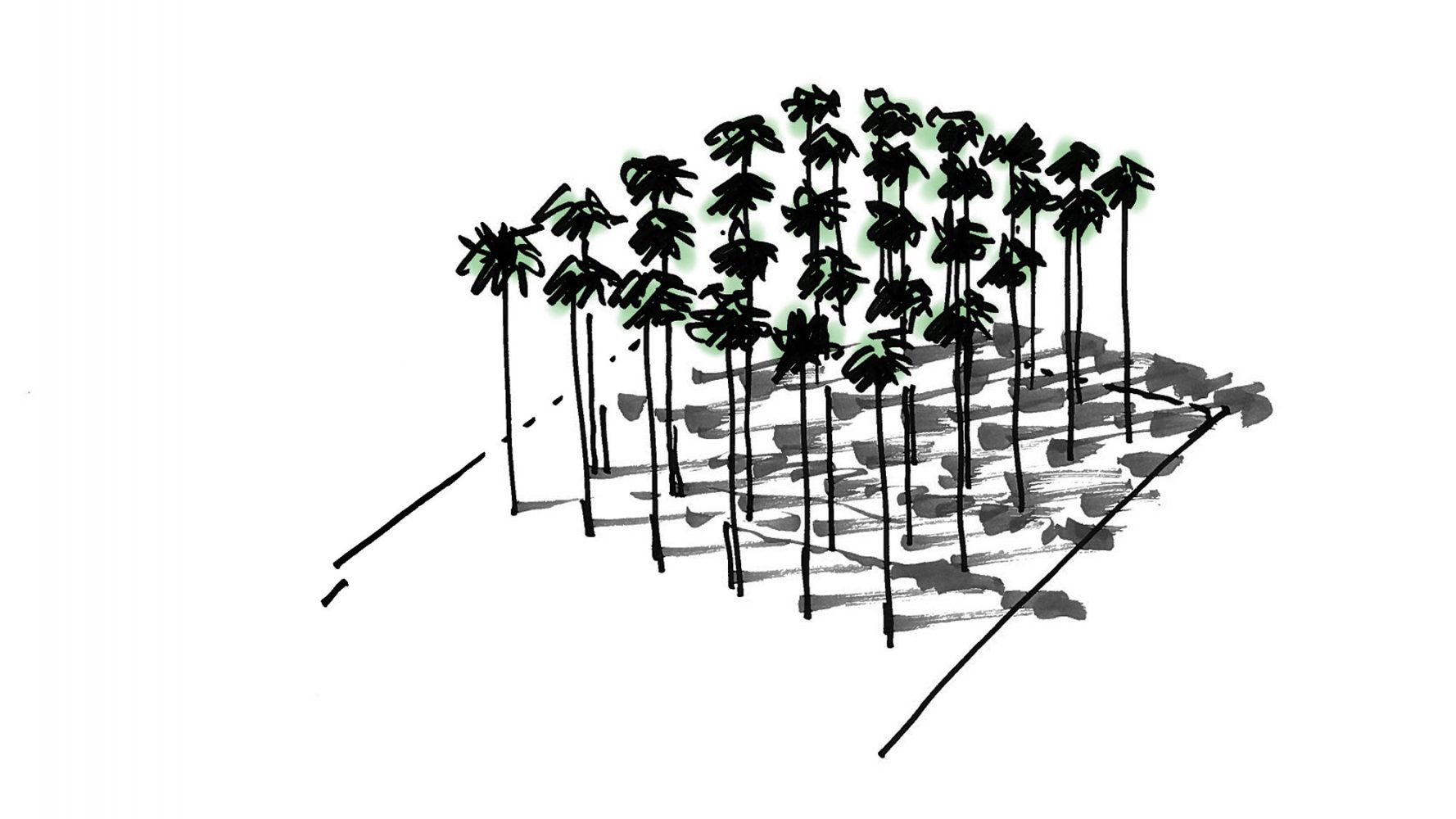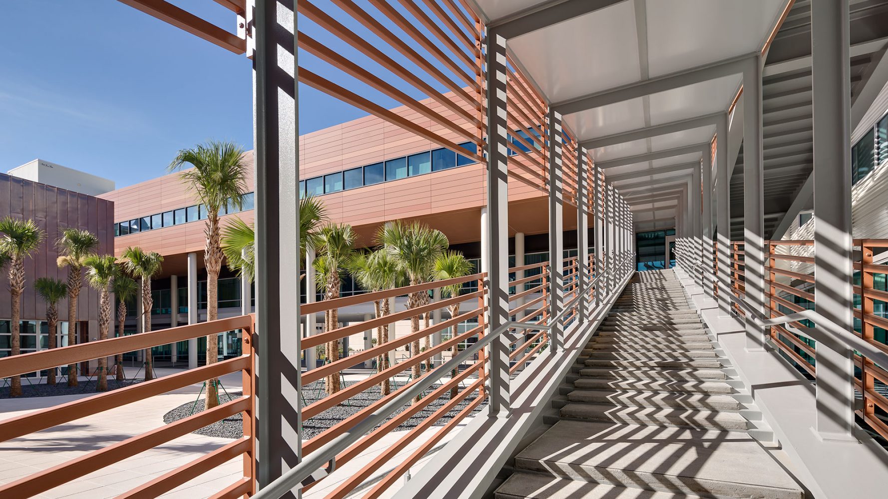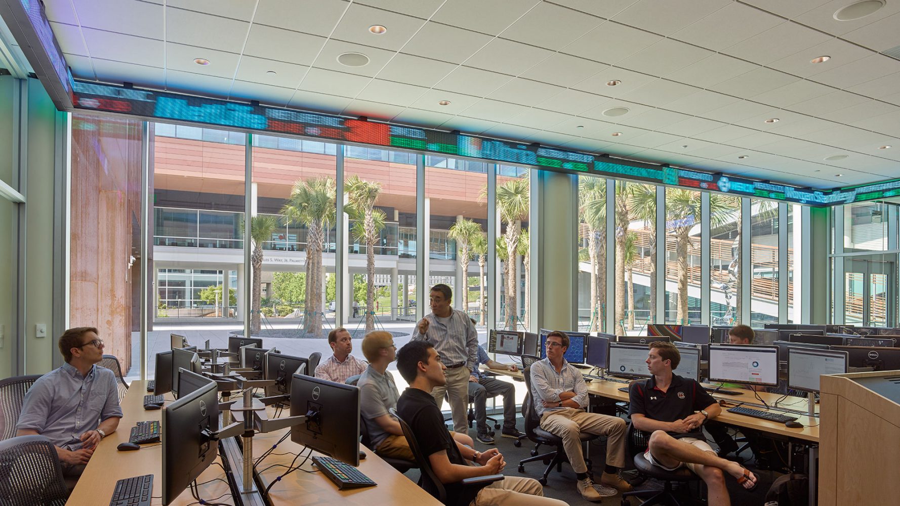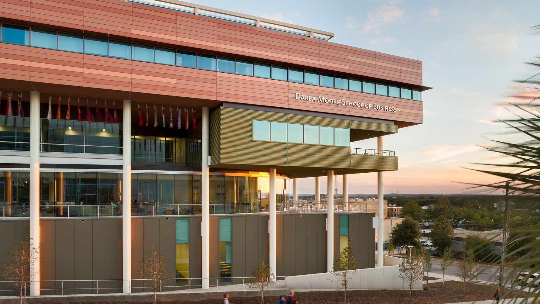 El edificio con certificación LEED Platinum aprovecha las marcadas pendientes del terreno para ofrecer vistas del río Congaree mientras la escuela de negocios Darla Moore, con su sistema de sombreado automático, se erige sobre el terreno inclinado con un patio central lleno de los árboles característicos del estado de Carolina del Sur: la palma de abanico.