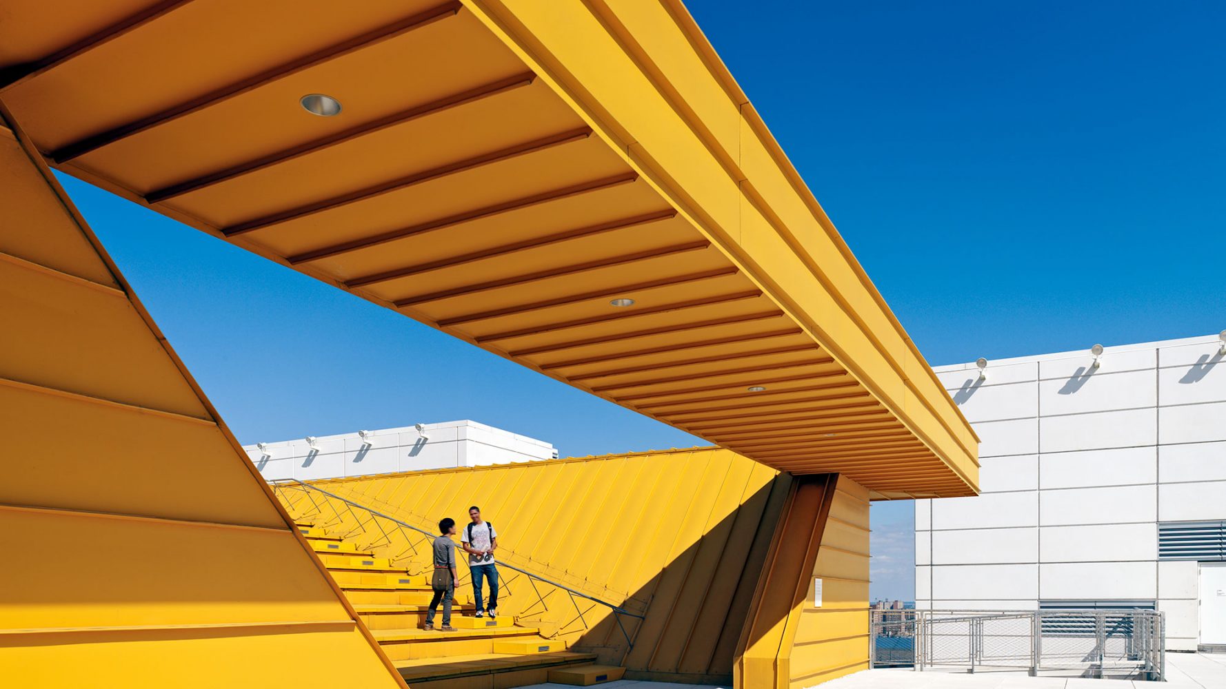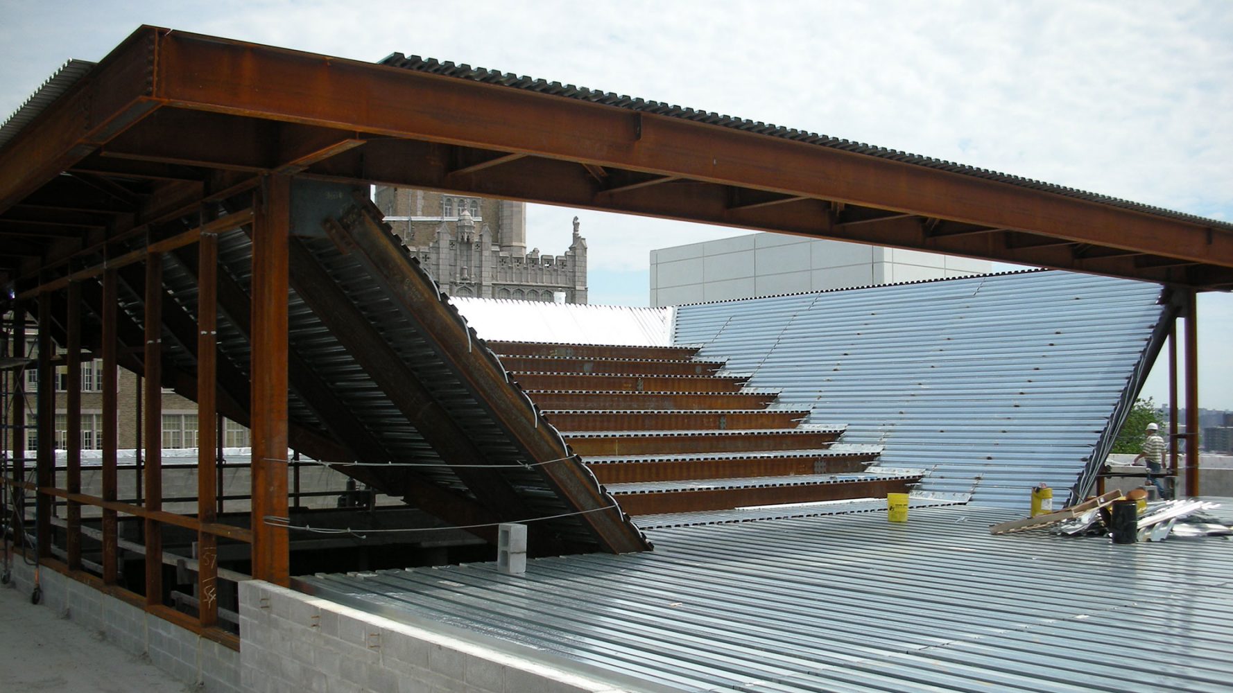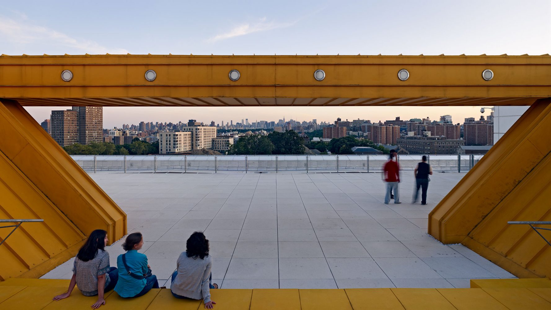 外立面覆盖的是开口装有铝合金遮阳百叶的深的架状预制混凝土。在东西立面垂直方向放置,在南立面水平放置,百叶窗实现了向外景观需求和最大遮阳的平衡,以减少室内热量的吸收。在屋顶,露天剧场出挑于中庭之上,拥有三面全高的天窗,让自然光进入大楼。露天剧场提供了在宜人天气时额外的教学和其他功能空间,也提供了一览无余的市中心曼哈顿天际线景观。