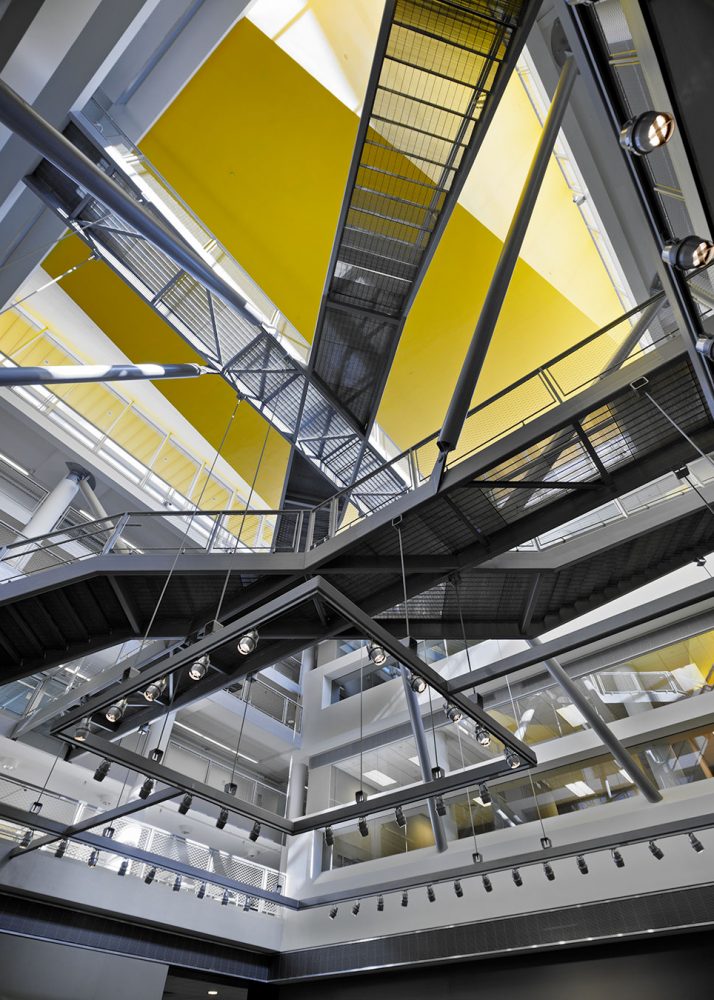 通过把工作室和评图空间布置在一个由一系列人行天桥隔断的带天光的中庭周围,现有的五层高现代玻璃块构成的建筑重新被改造。