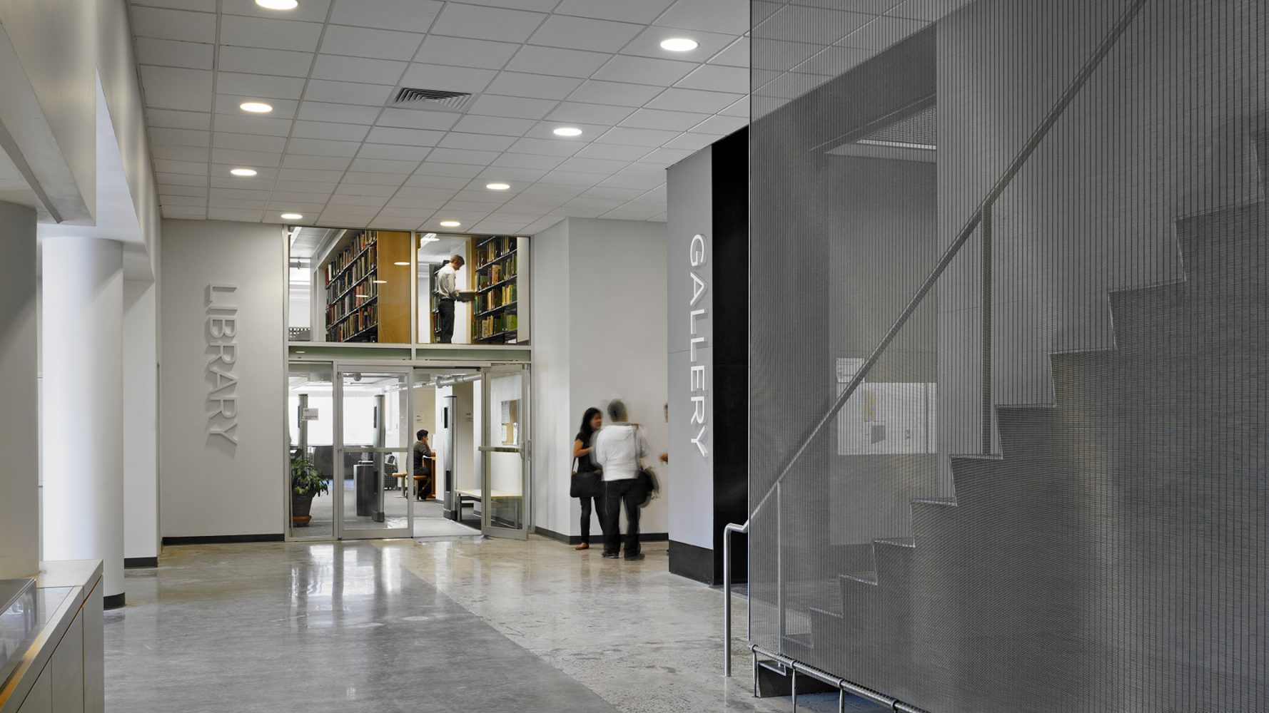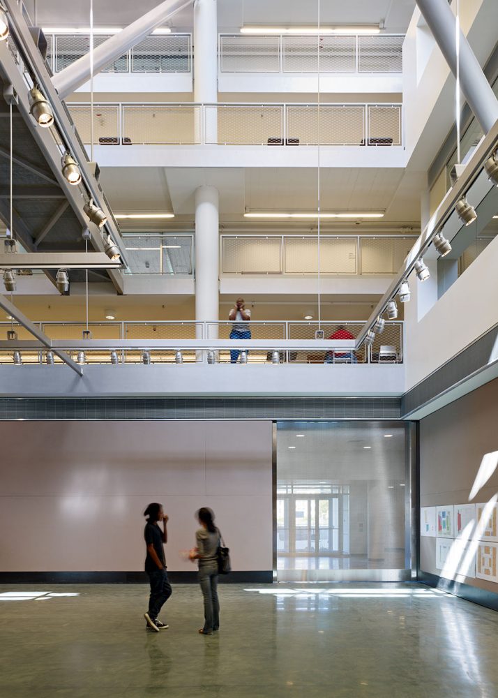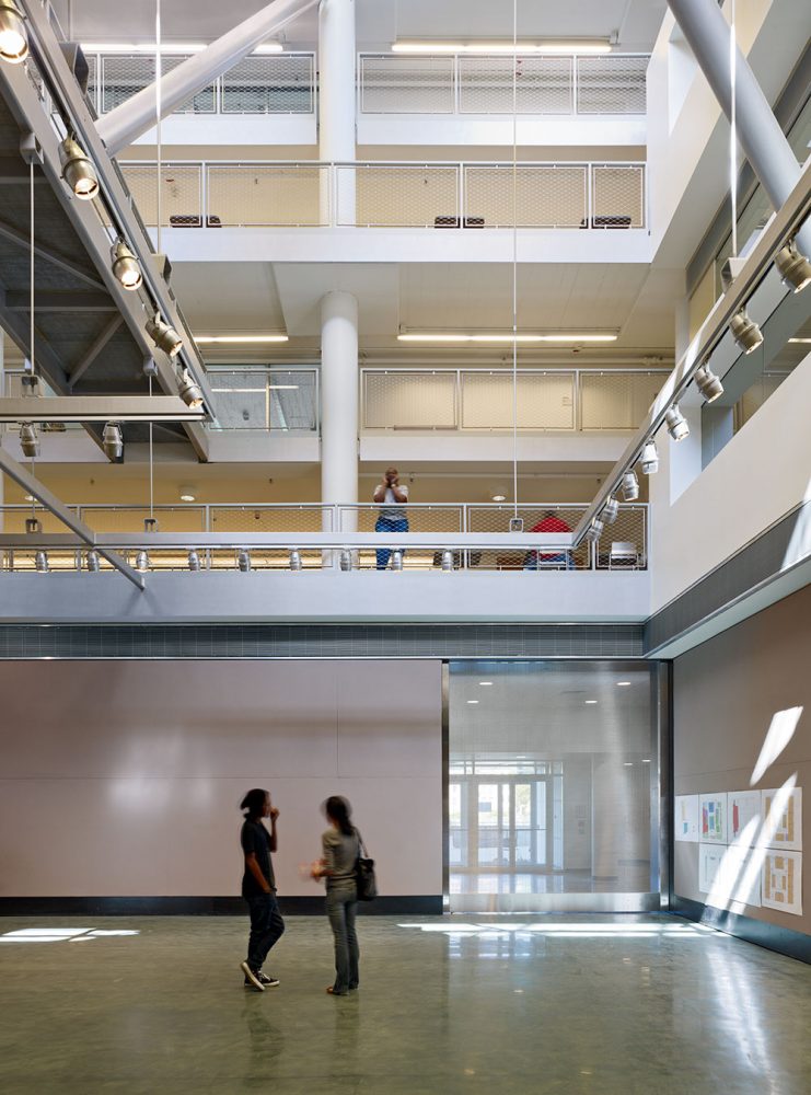 局部夹层被插入到高于工作室楼面的位置,给教师办公室提供空间。这些办公室可以看到开放式的设计工作室;阳光穿过室内的玻璃到达沿着建筑物轮廓的双层空间,给与工作室空间最多的阳光。在工作室这层的走廊很宽,双层高,可以成为放松和社交的非正式休息区,也可称为工作室评图的空间。较窄的阳台俯瞰休息室,并提供办公层的交通。