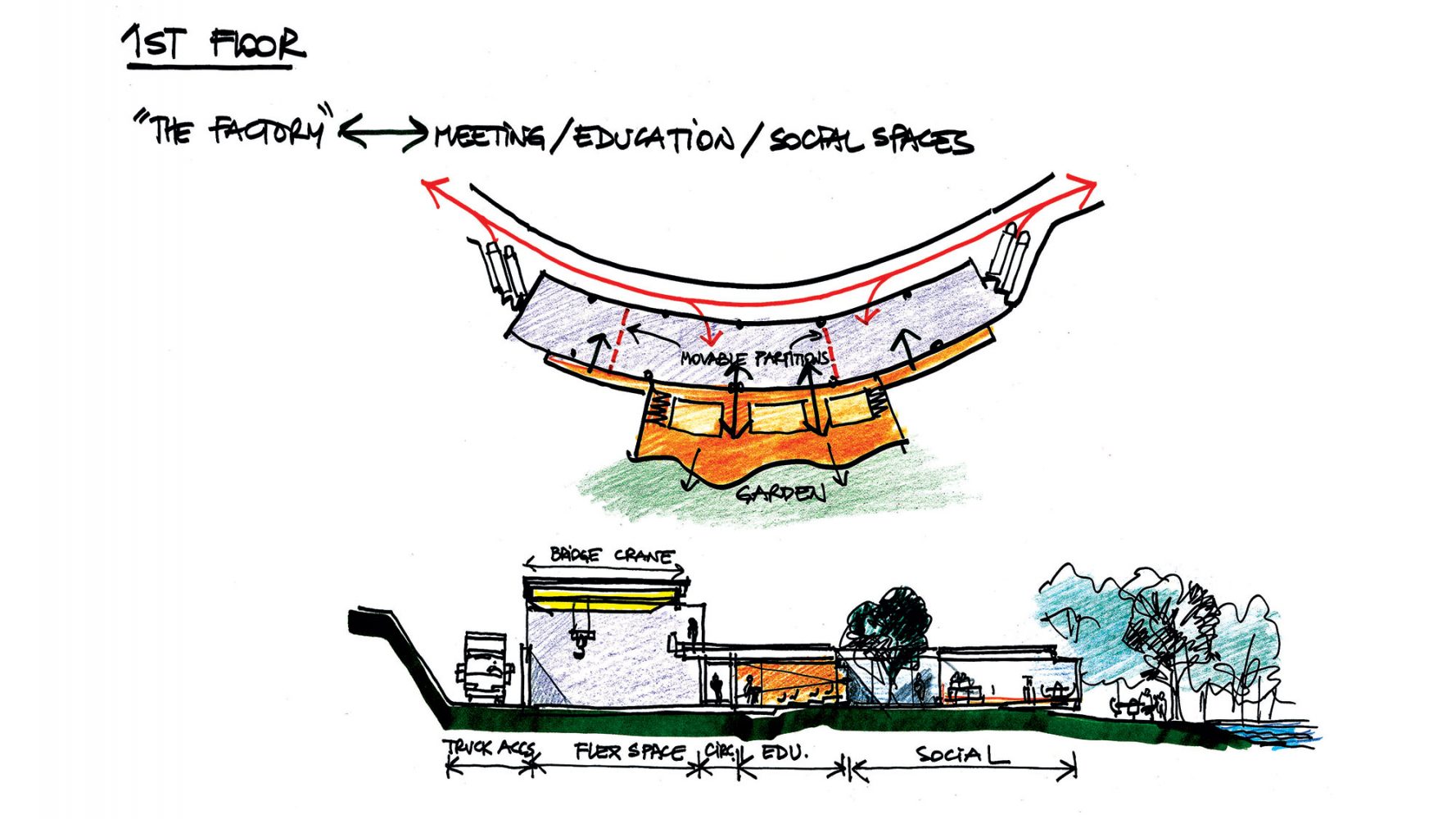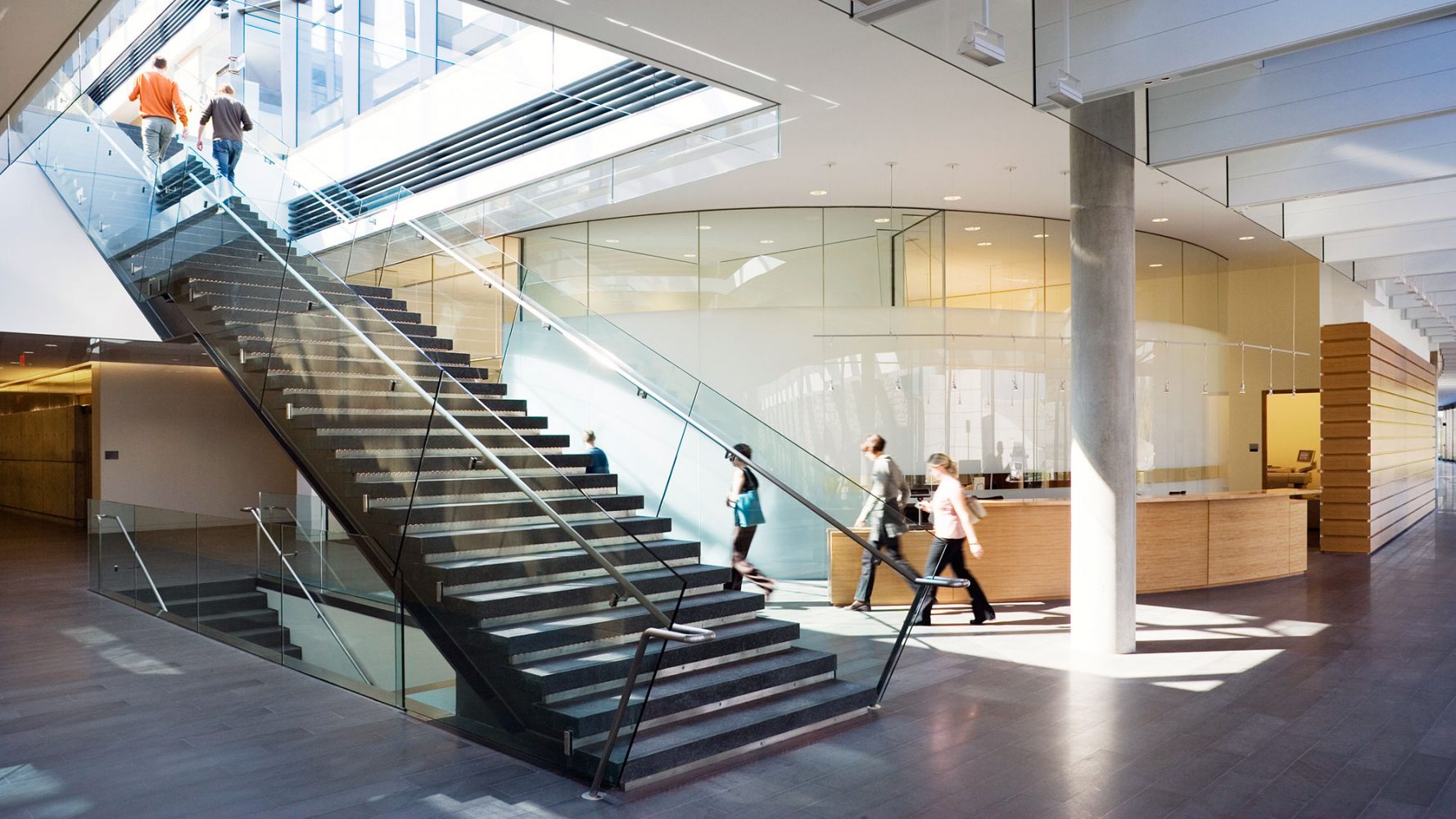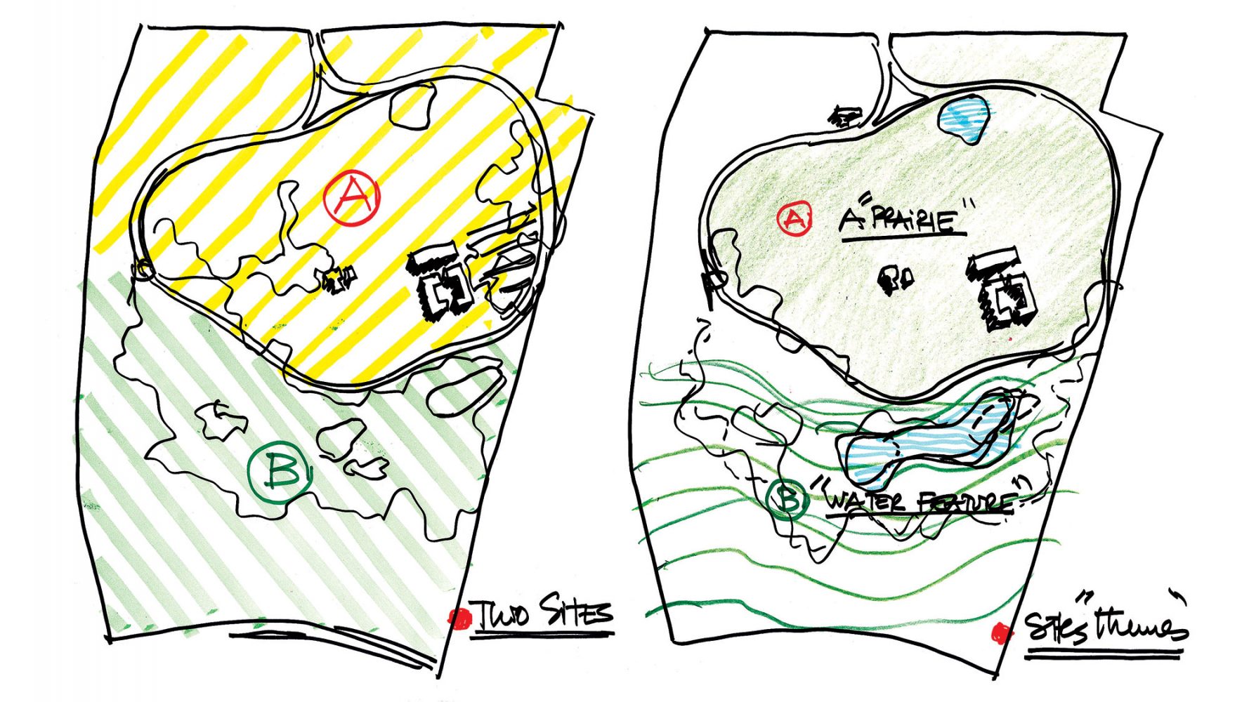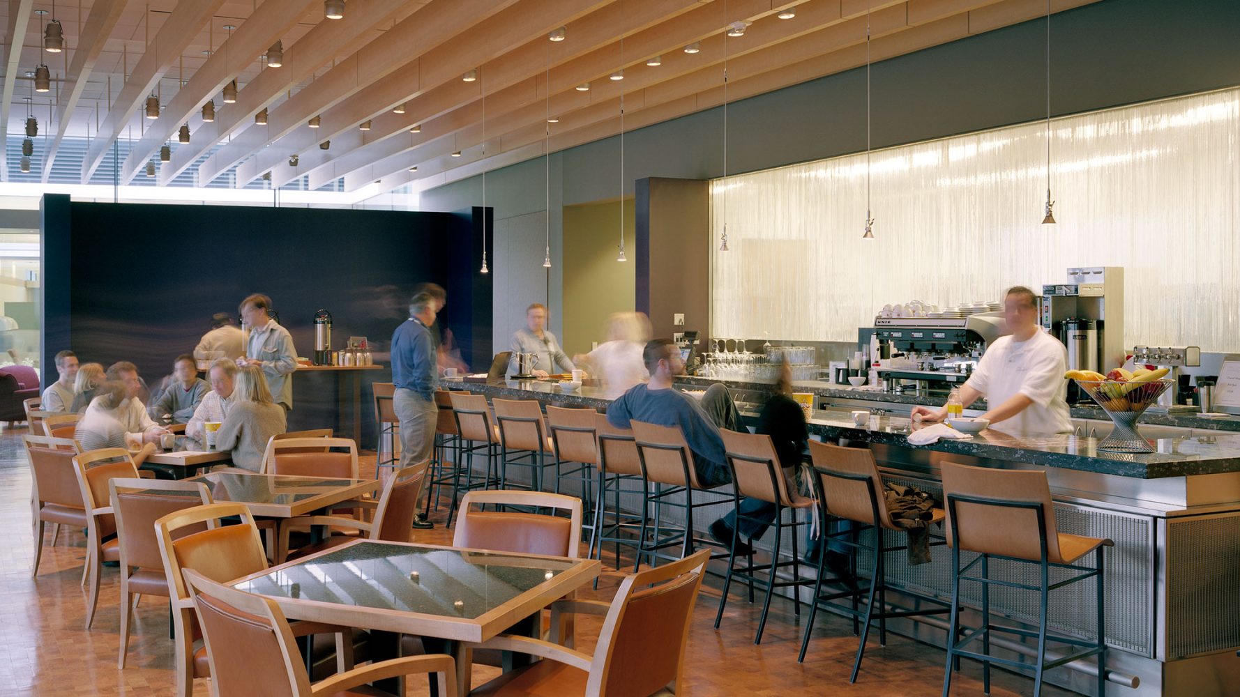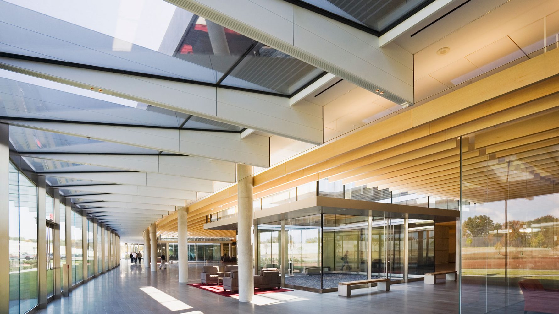 The Landscape Building areas that are concealed from above are revealed from below. Beneath a 16,723-square-meter (180,000-square-foot) green roof, the second largest in the United States, sown with indigenous vegetation, the undulating building levels contain labs, communal spaces, meeting rooms, offices, and support areas. The interior retains sightlines of the exterior plain and benefits from ample daylight exposure, despite lying partially underground.