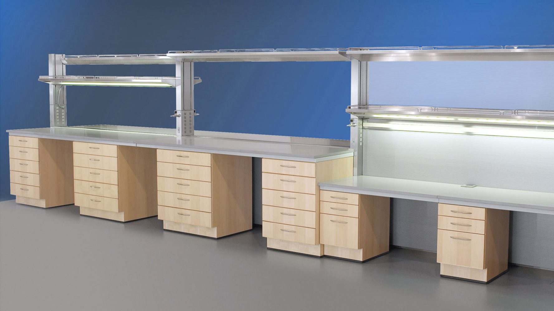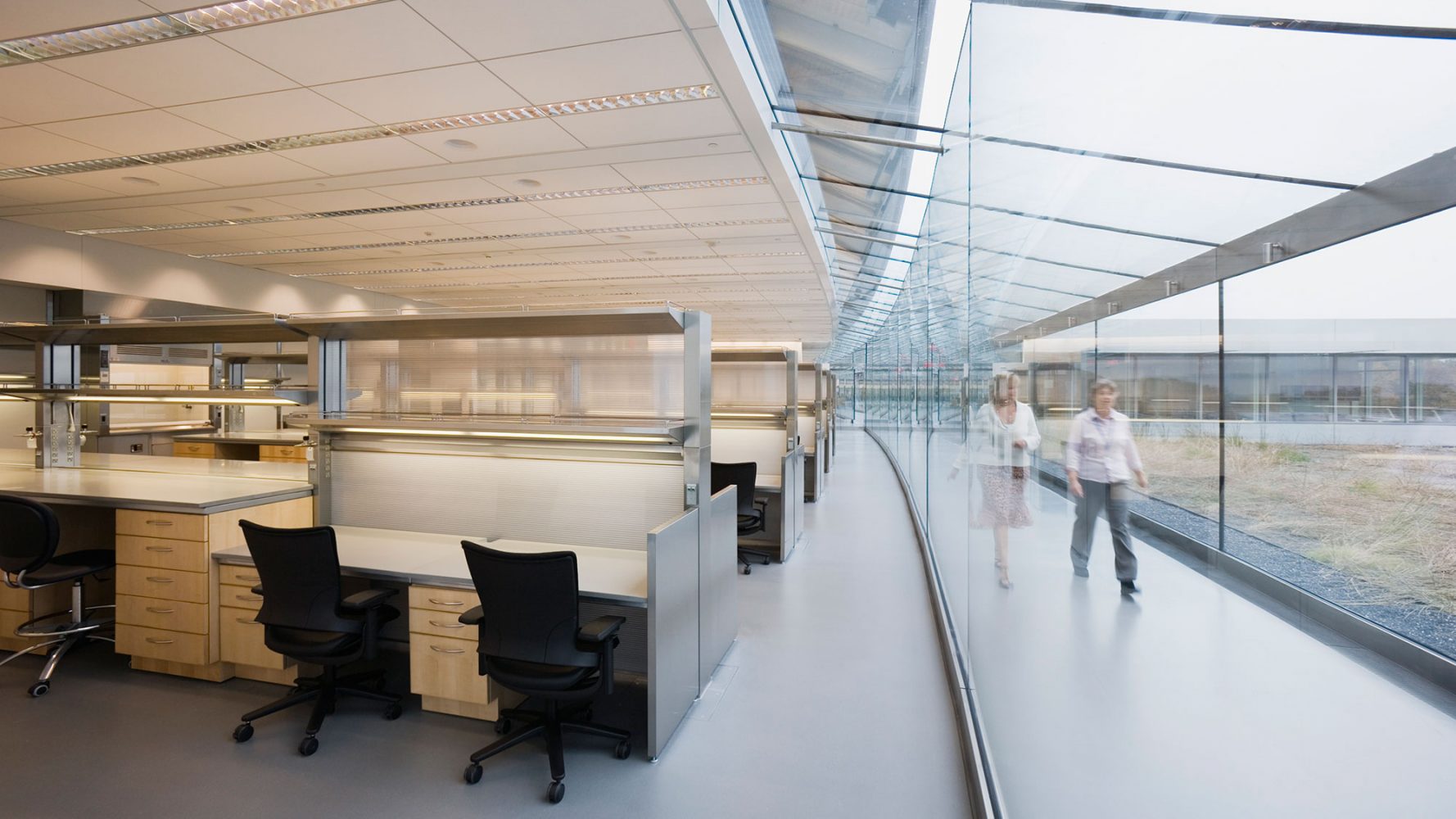 The lab achieves a high level of flexibility. Without contractor assistance, existing elements can be reconfigured, completely removed, or replaced with new ones. A floor grid encases data, electrical, and gas systems, supplying interchangeable connections among furnishings and lab benches.
