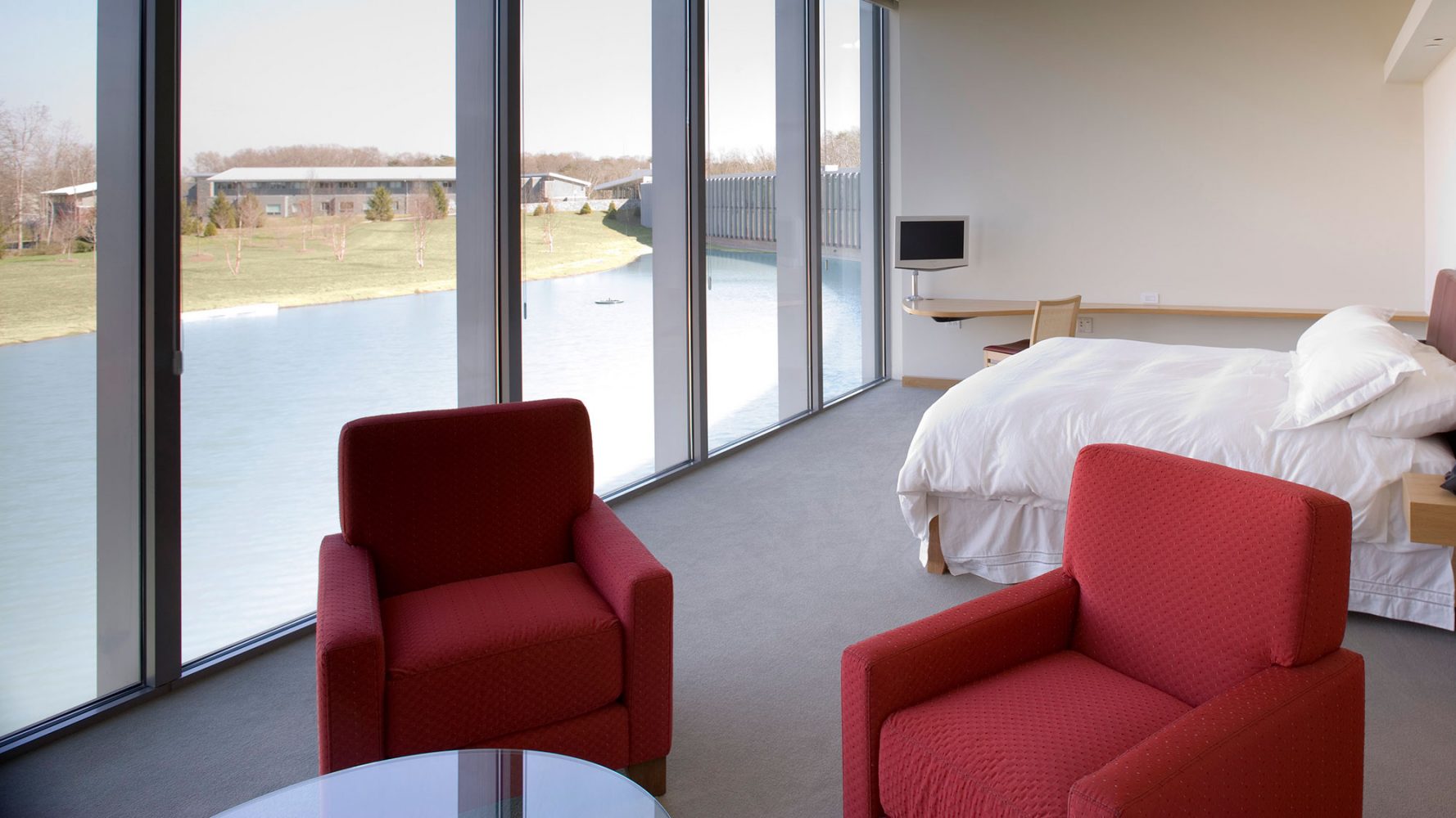 The labs and conference center share a common courtyard with conference housing. Visitors stay in a 96-room hotel, enjoying lake views. A residential village lodges researchers and their families in comfortable accommodations.