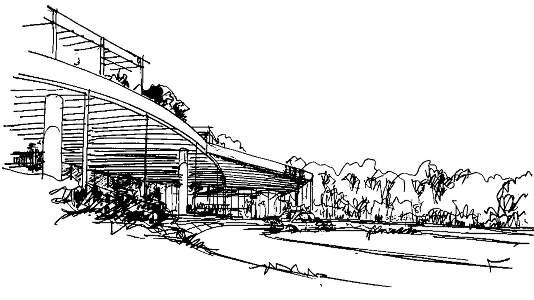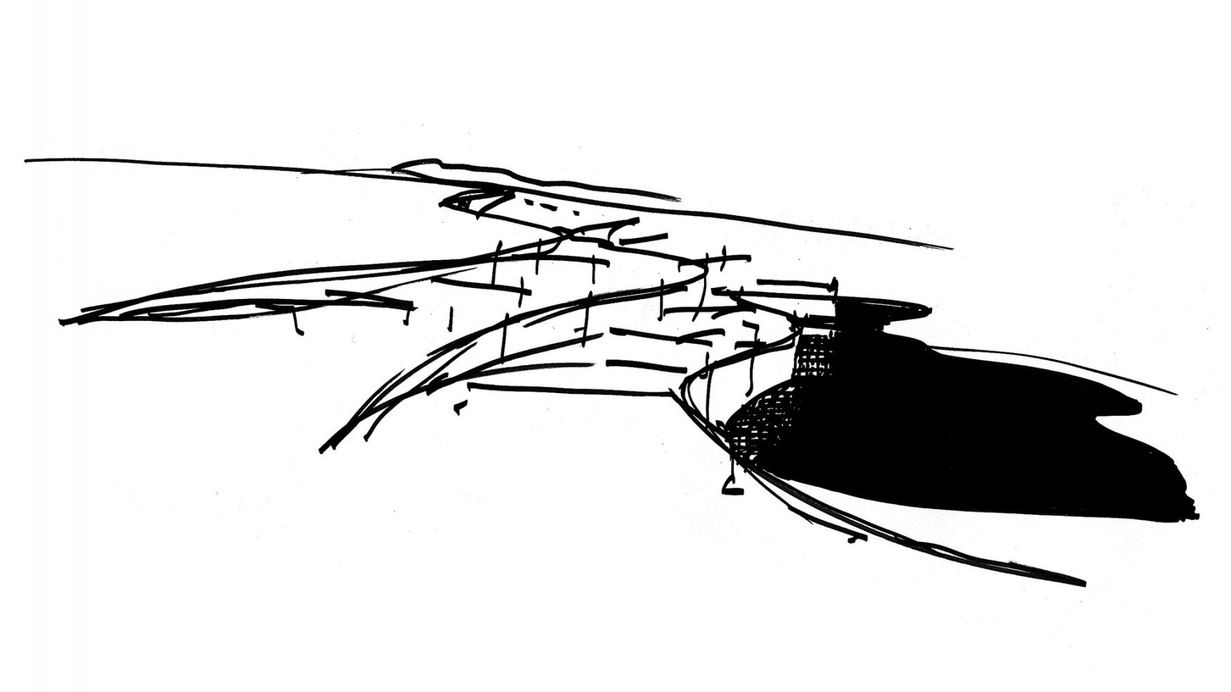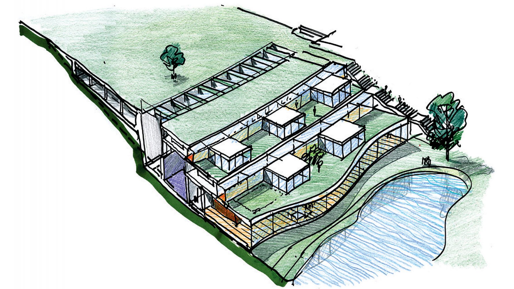 HHMI’s Janelia Research Campus sits on 689 acres (279 hectares) bounded by forest on two sides, within a sloping hillside offering generous views of the Potomac River and the verdant Maryland fields beyond. Set into this tranquil panorama, the 305-meter-long (1,000-foot-long) Landscape Building, named in reference to its near concealment in the terrain, emerges from the topography in a series of three descending planted terraces. Conference housing and residential village areas lie to its northeast.