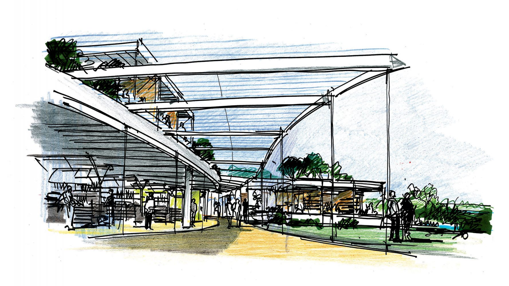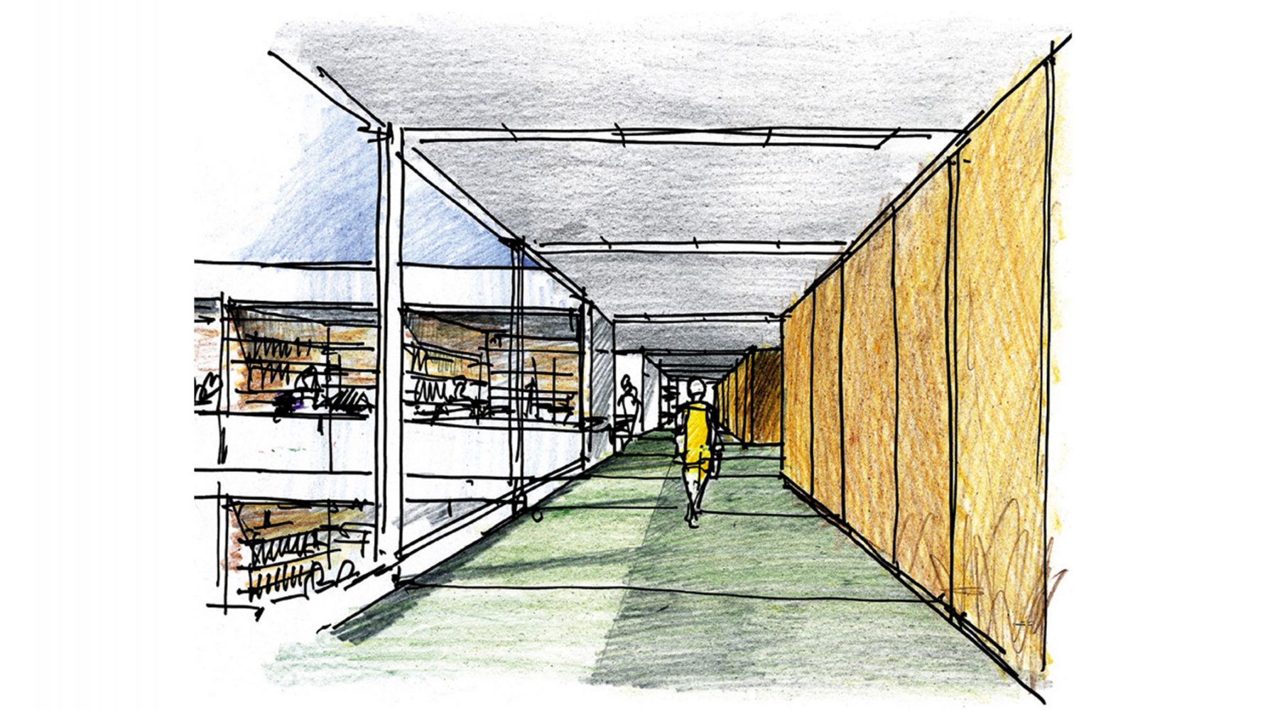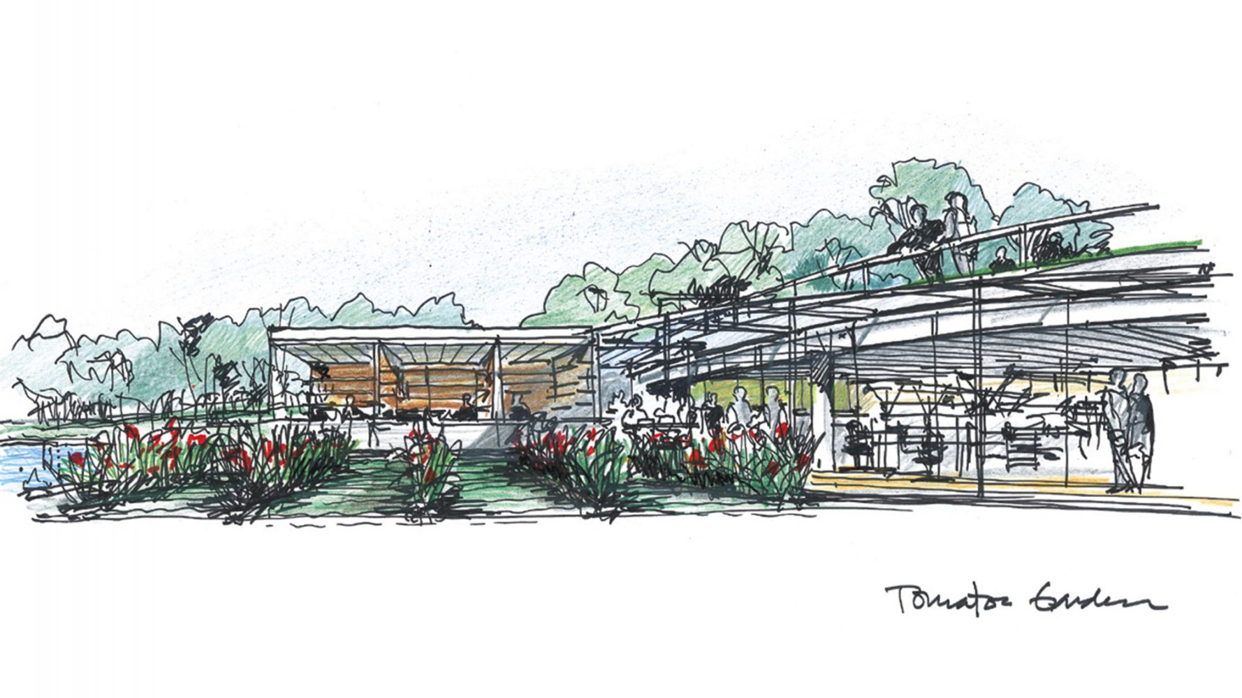 HHMI’s Janelia Research Campus sits on 689 acres (279 hectares) bounded by forest on two sides, within a sloping hillside offering generous views of the Potomac River and the verdant Maryland fields beyond. Set into this tranquil panorama, the 305-meter-long (1,000-foot-long) Landscape Building, named in reference to its near concealment in the terrain, emerges from the topography in a series of three descending planted terraces. Conference housing and residential village areas lie to its northeast.