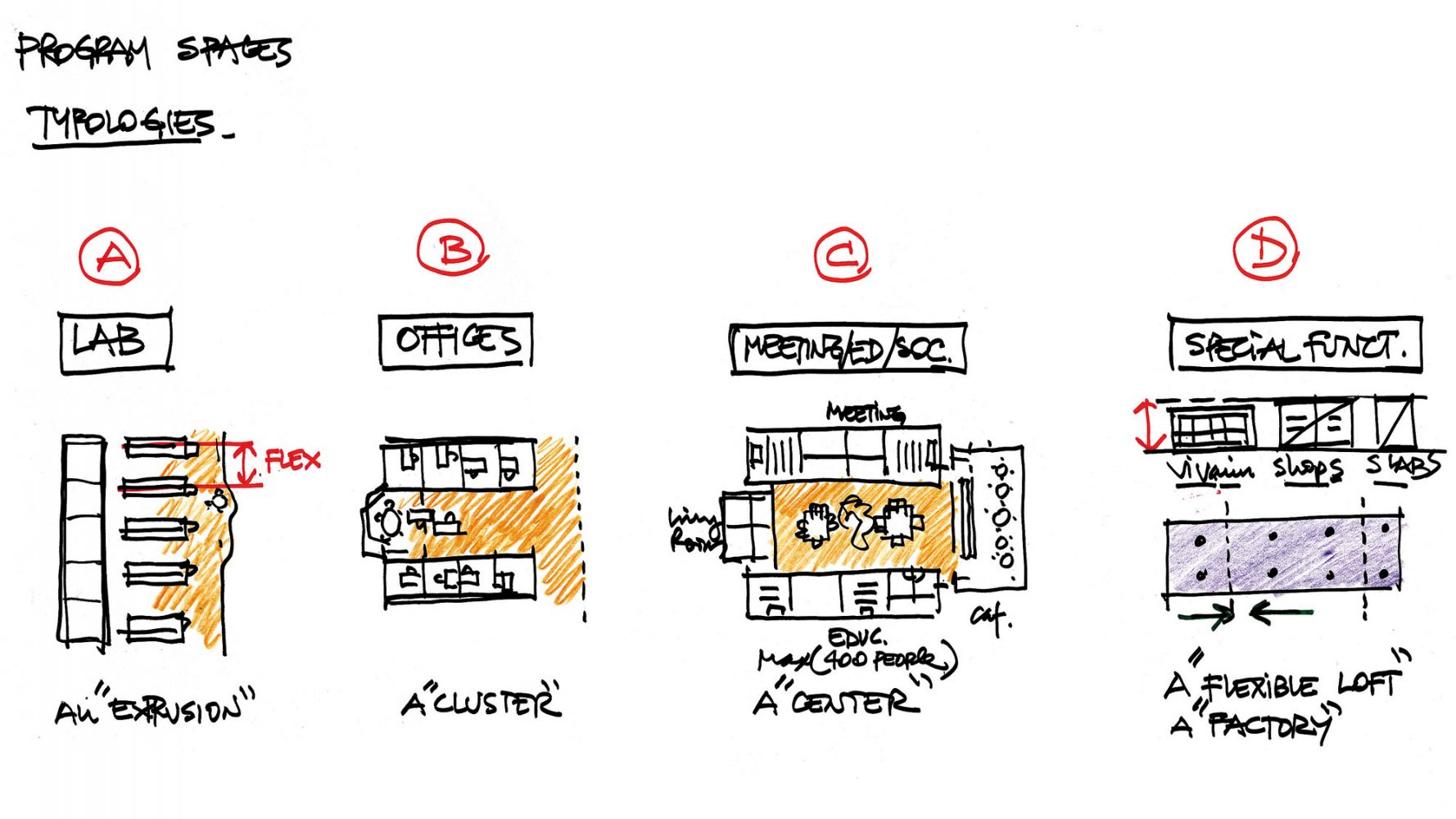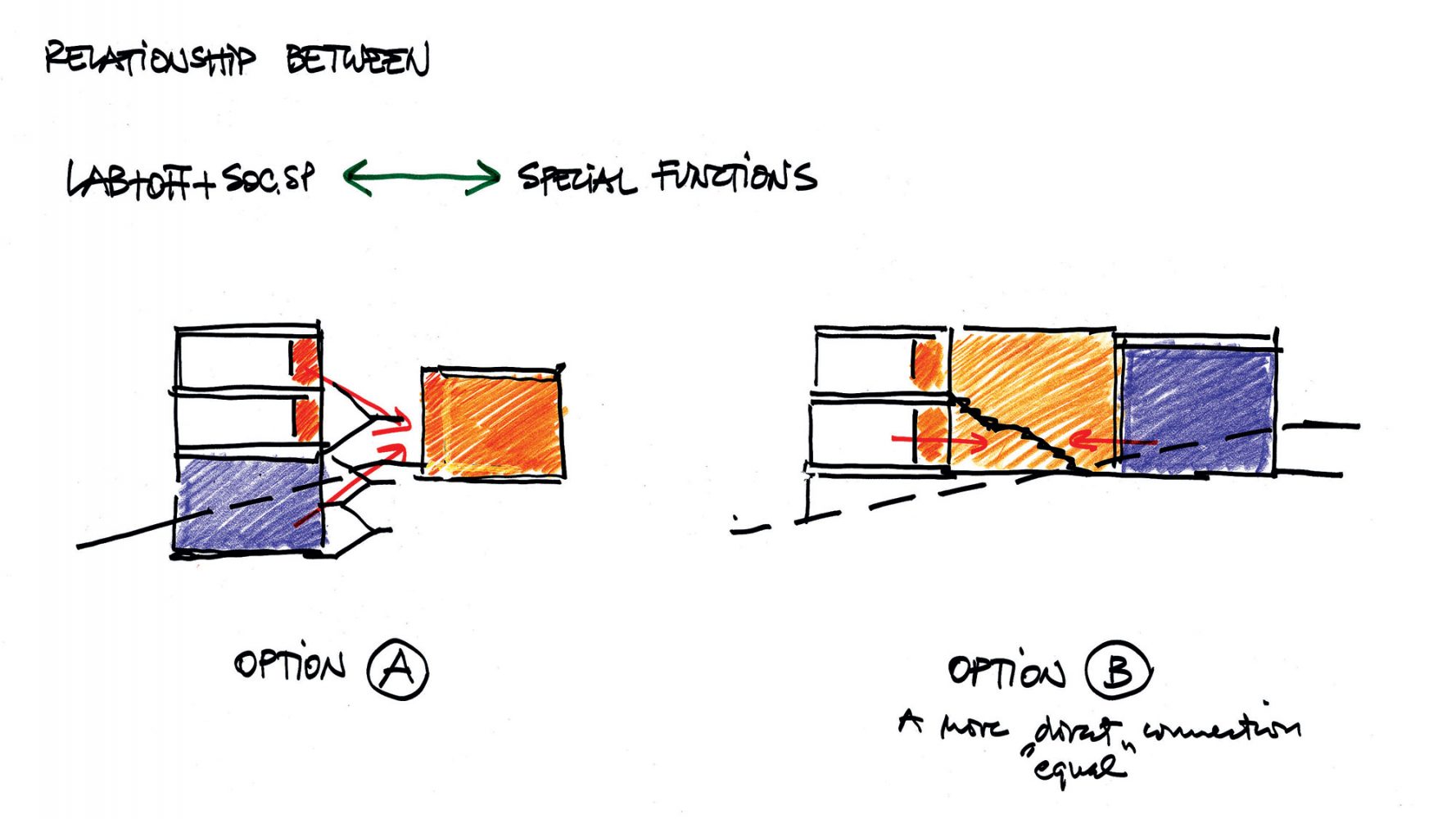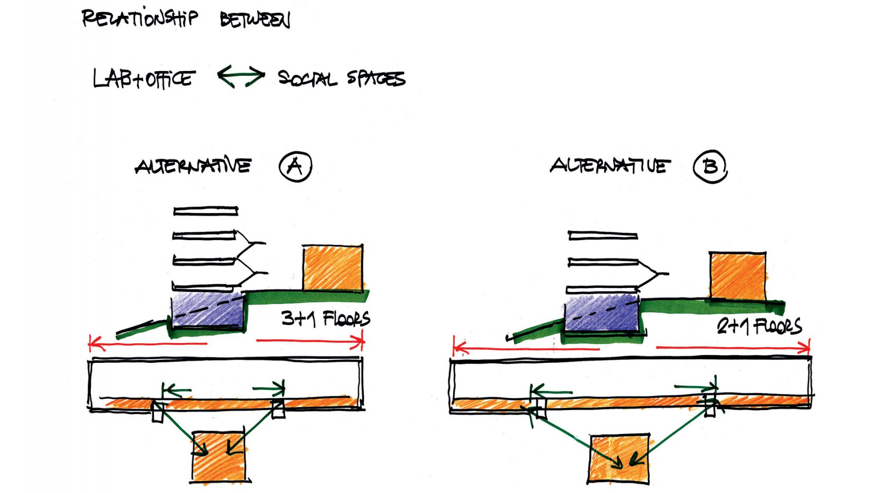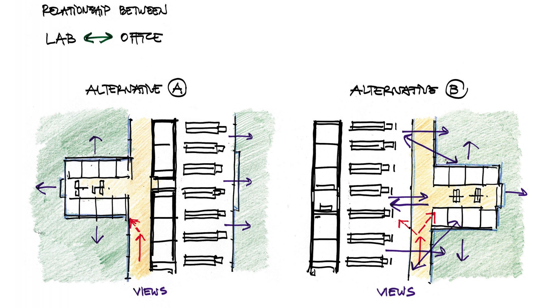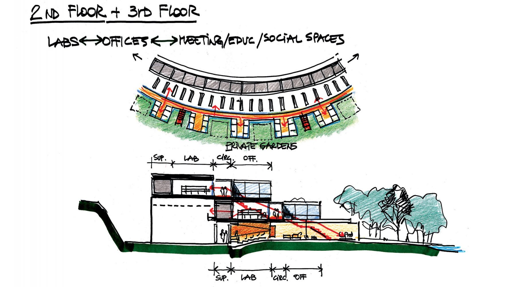 The building’s curving plan lends variety to its longitudinal distribution. Mechanical rooms, service corridors, support spaces, and lab benches run parallel in an extrusion punctuated by alternating office/conference room clusters and open terraces. The office cluster/open terrace rhythm promotes collegial interaction and provides opportunities for identifying individuals along the building, thus furthering one of HHMI’s stated aims.