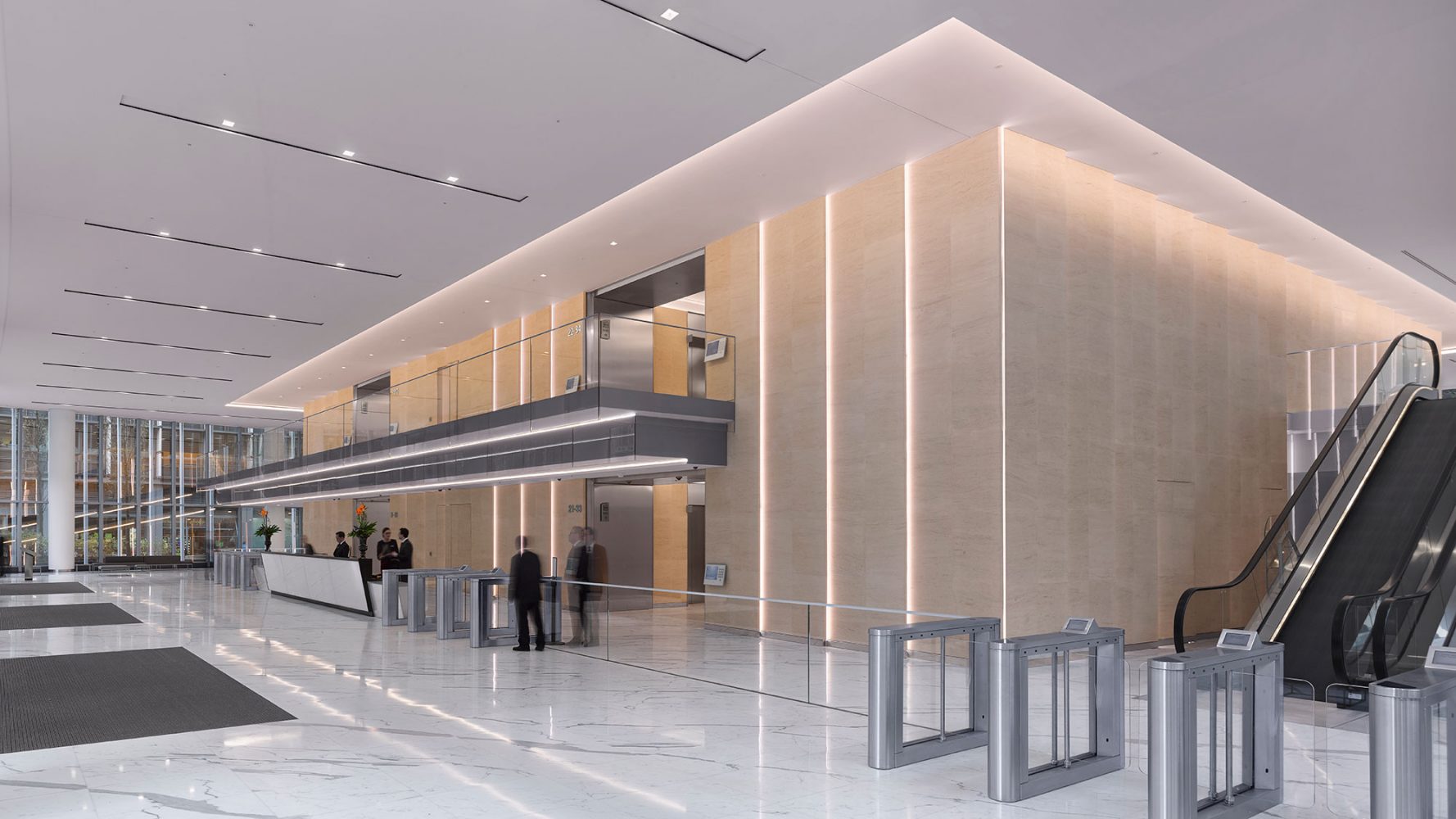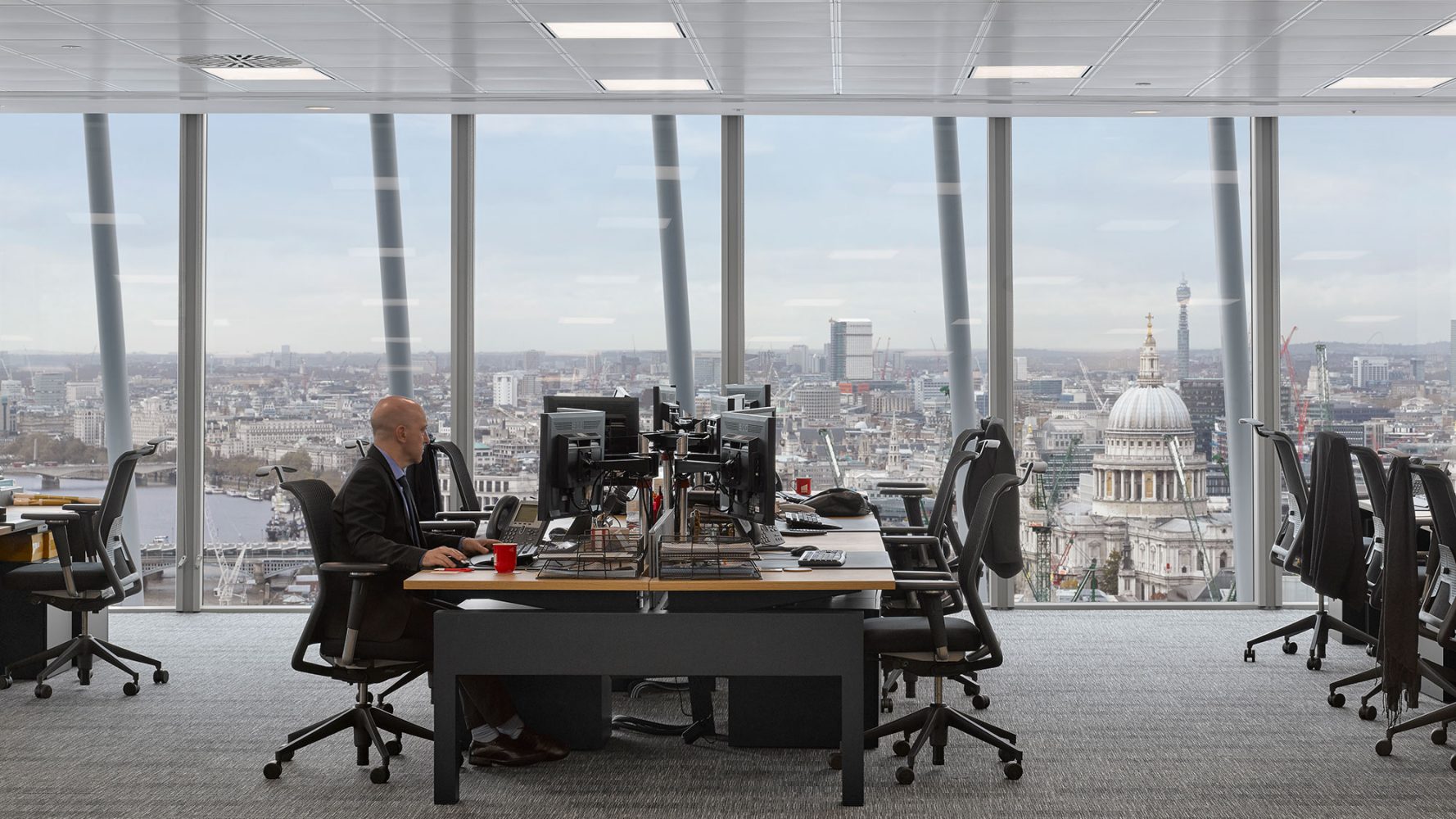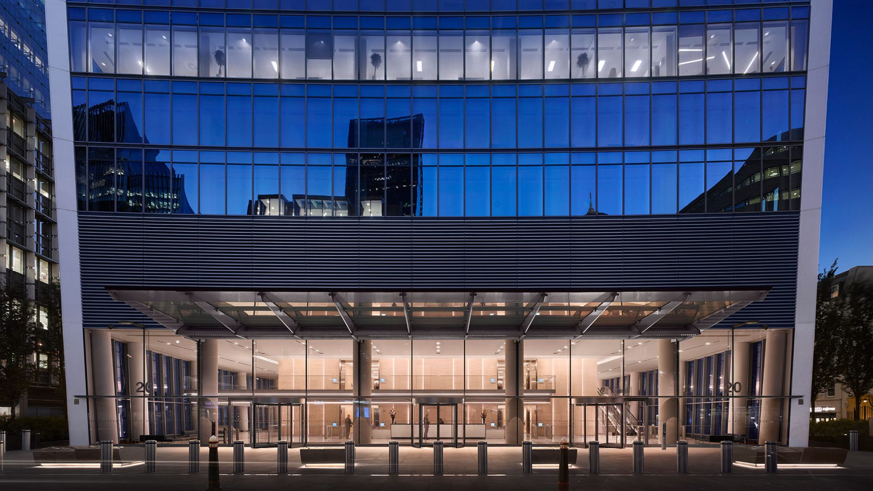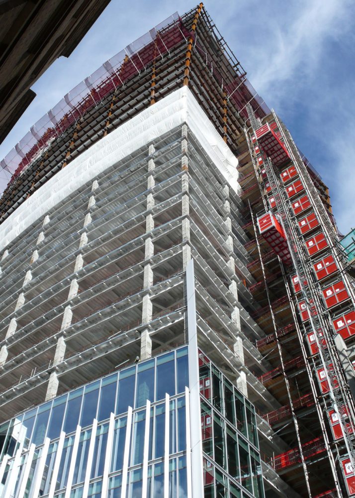 Las lamas verticales de la fachada brindan sombra a los lados este y oeste y siguen la forma de abanico y las curvas orgánicas del edificio a medida que se abren y envuelven la cubierta y el Sky Garden. Los lados norte y sur están completamente acristalados para maximizar las vistas, mientras que el muro cortina de los pisos superiores de la fachada norte se extiende hasta las lamas que se arquean sobre el techo, proporcionando un enorme ventanal que abarca toda la altura del Sky Garden.