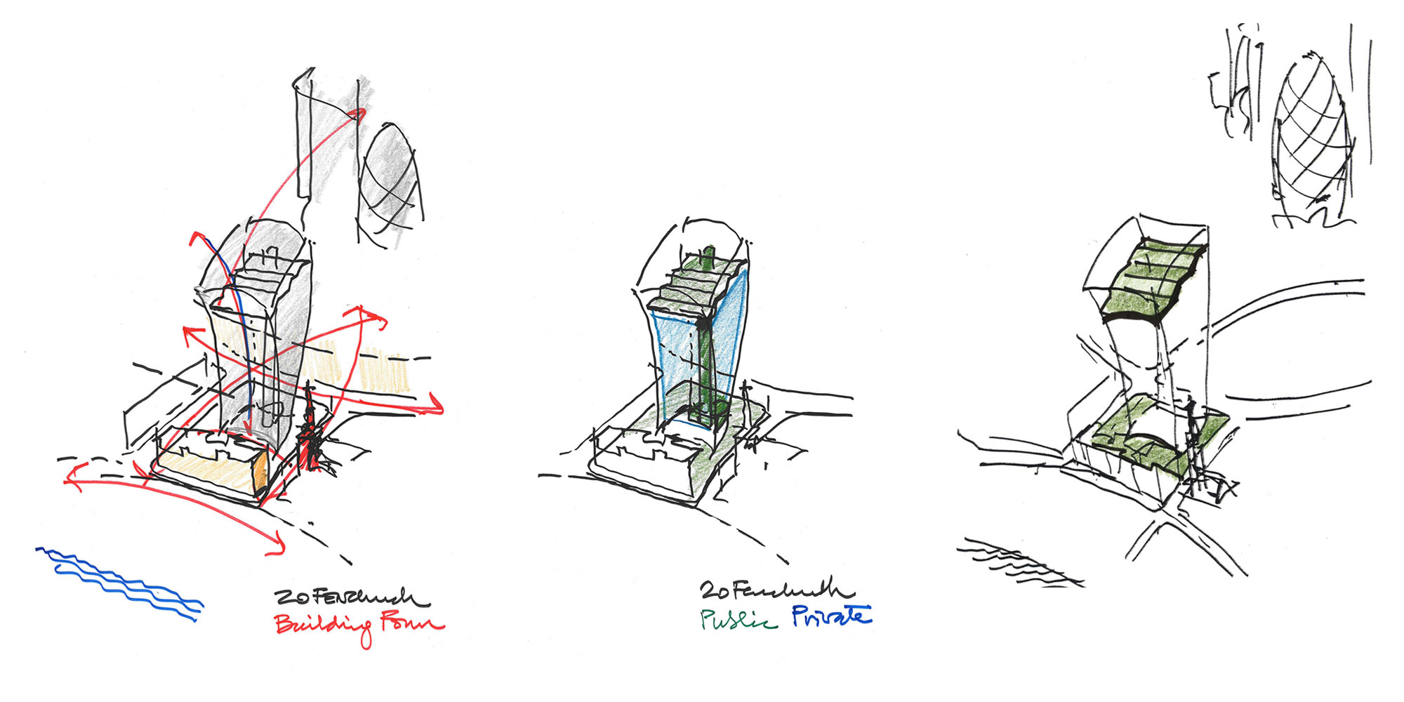 La edificación ocupa la mayor parte de la cuadra casi rectangular que delimita con las calles Fenchurch Street al norte, Eastcheap Street al sur, Rood Lane al este y Philpot Lane al oeste. Se exploraron varias alternativas durante el diseño del concepto siguiendo dos principios: mantener el perfil descendente formado por las alturas del complejo Eastern Cluster e invertir la distribución tradicional del volumen de un edificio. En la planta baja, la delgada base de la torre permitió crear plazas ajardinadas y senderos peatonales en sus inmediaciones, incluido un pequeño parque público que conecta las calles Rood Lane y Philpot Lane, una considerable contribución al tejido urbano de la City de Londres. Un edificio anexo de cinco pisos situado al sur de la torre alberga espacios comerciales y da vida a las áreas públicas. El generoso y accesible espacio público del proyecto se ha convertido en un punto de referencia para futuros proyectos.