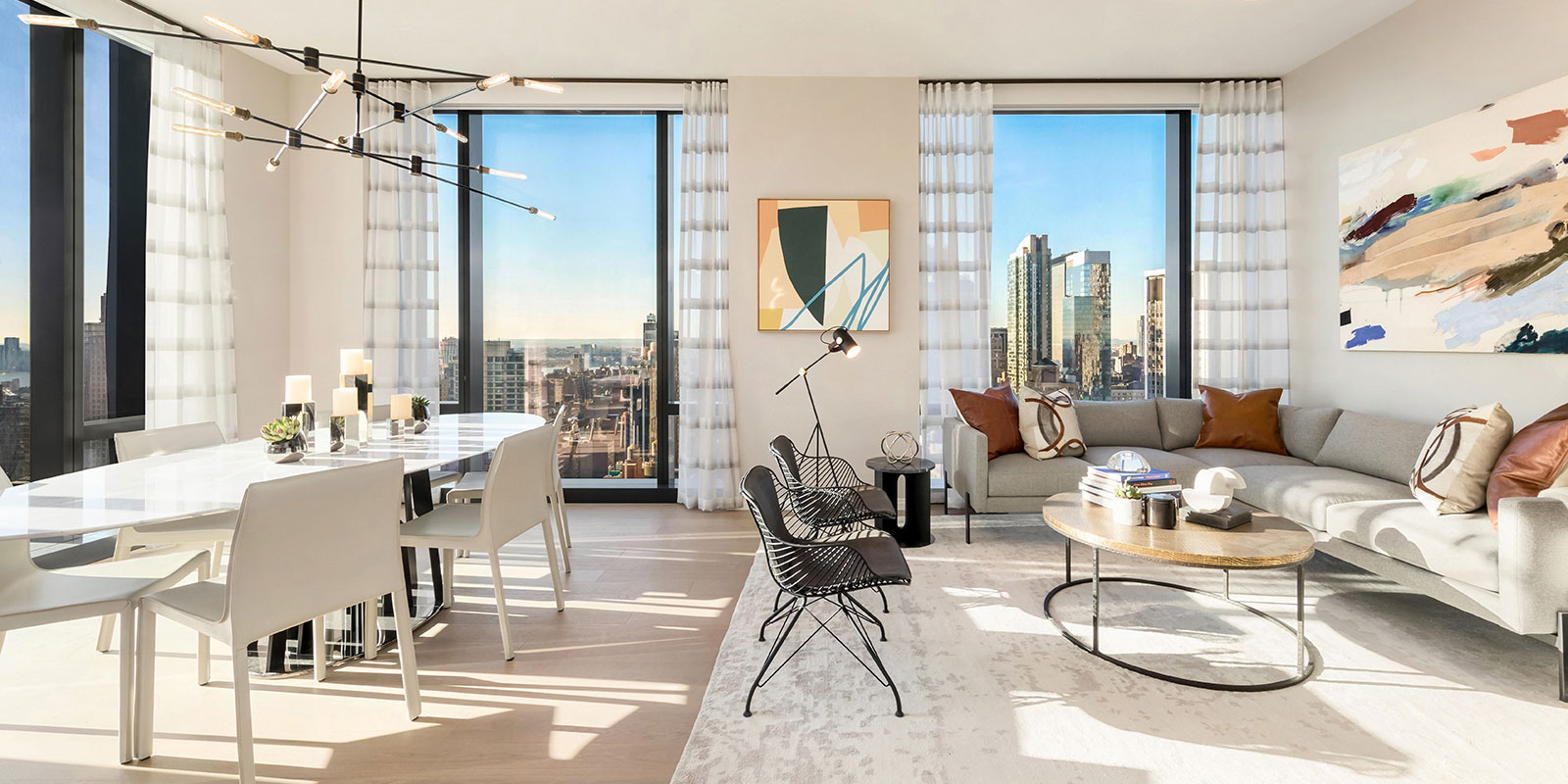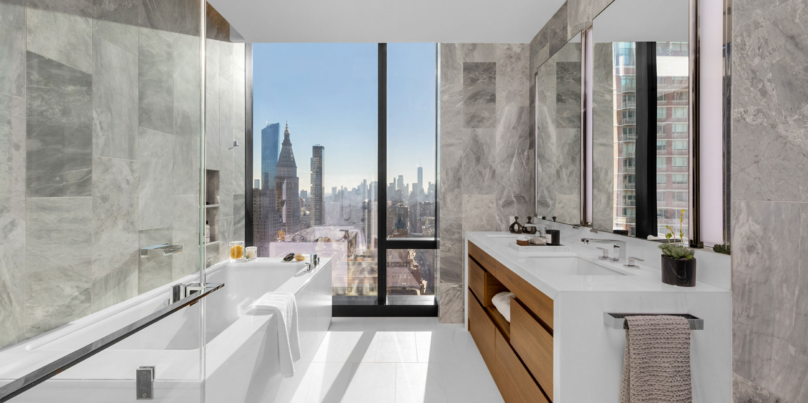 The tower’s modern architecture pays homage to nearby New York City signature towers, such as the Empire State Building, and other high rises from the late 1930s and early 1940s, respecting their verticality without imitating their interiors. Many natural stone and wood materials were incorporated into the interior design, such as marble, travertine, walnut, and oak, for the kitchen cabinets, countertops, and flooring.