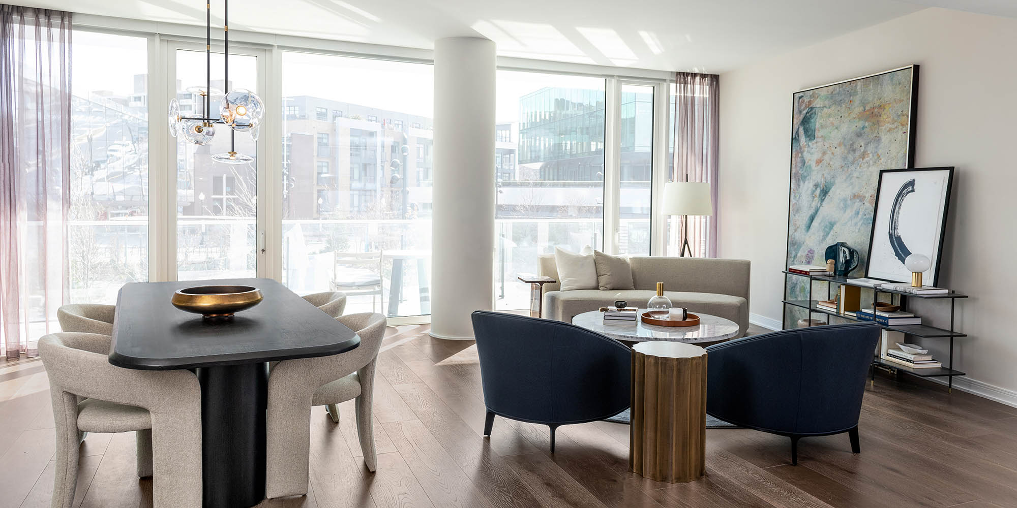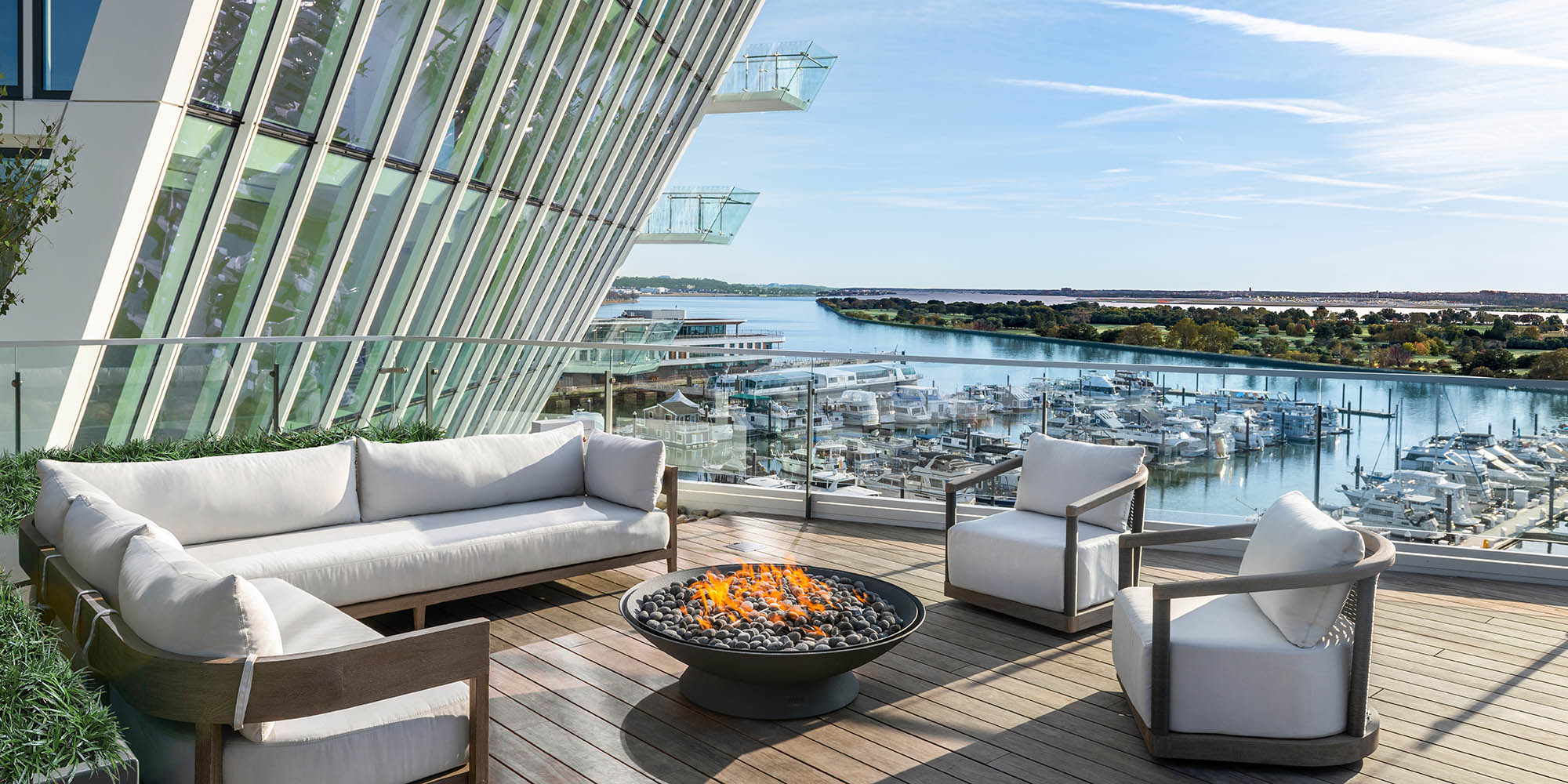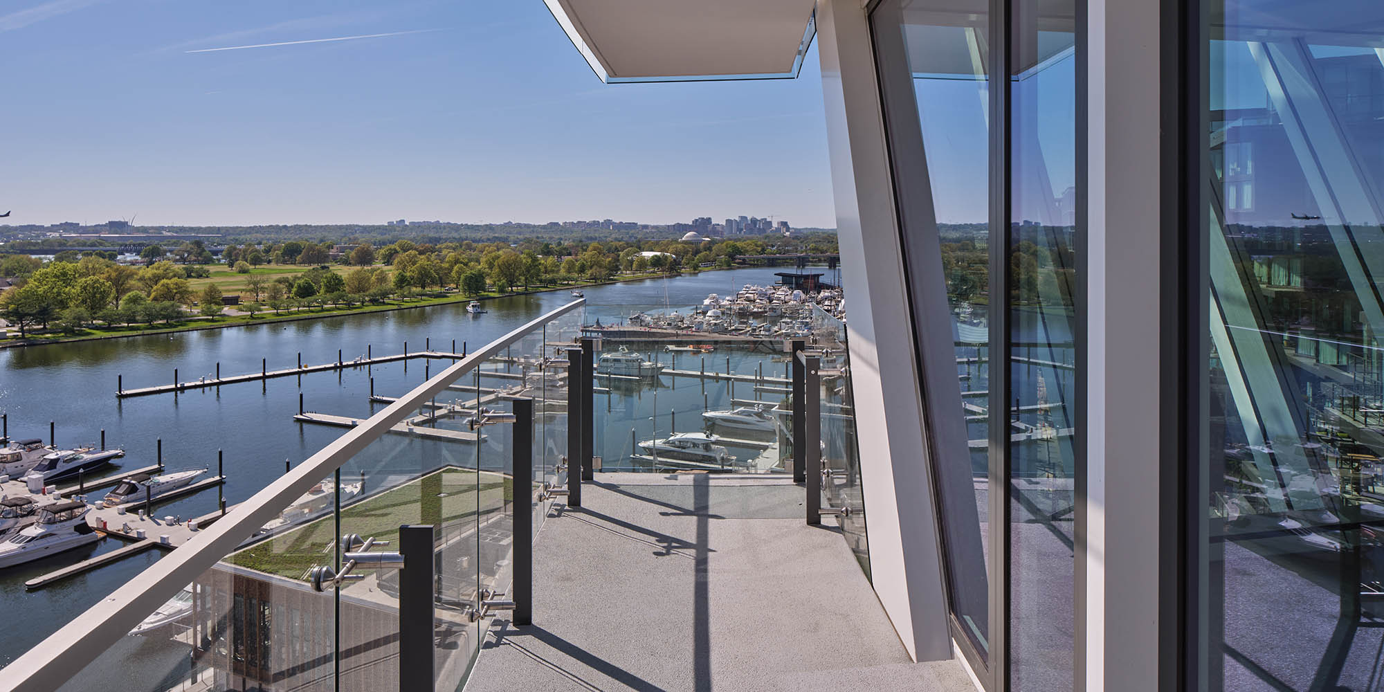 The building form positively impacts units on the interior. The stepped façade along the east and west elevations creates a unified building expression and allows maximum flexibility of interior unit layouts. In addition, a curved-glass guardrail system along continuous balconies facilitates unobstructed views out of the unit. The largest residences are situated along the north and south ends of the tower, with their dramatically sloped glazing and views of the Potomac river, Washington Monument, and Jefferson Memorial.