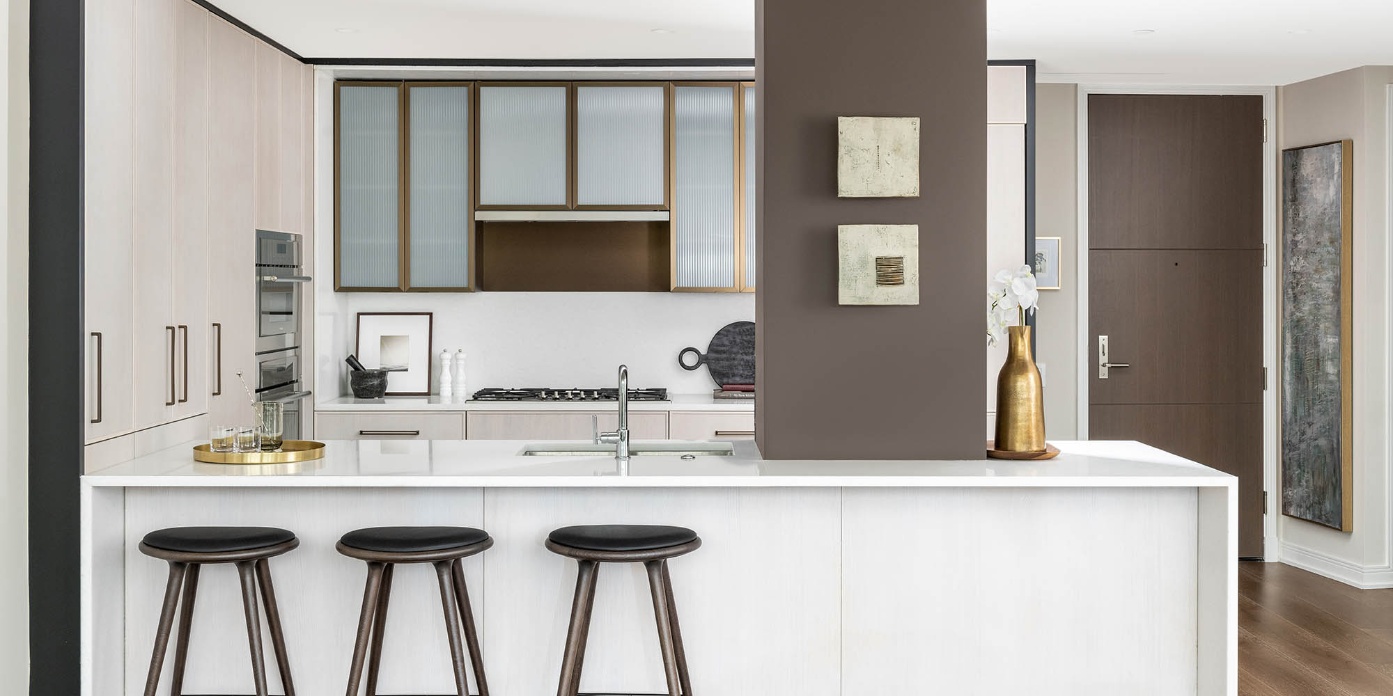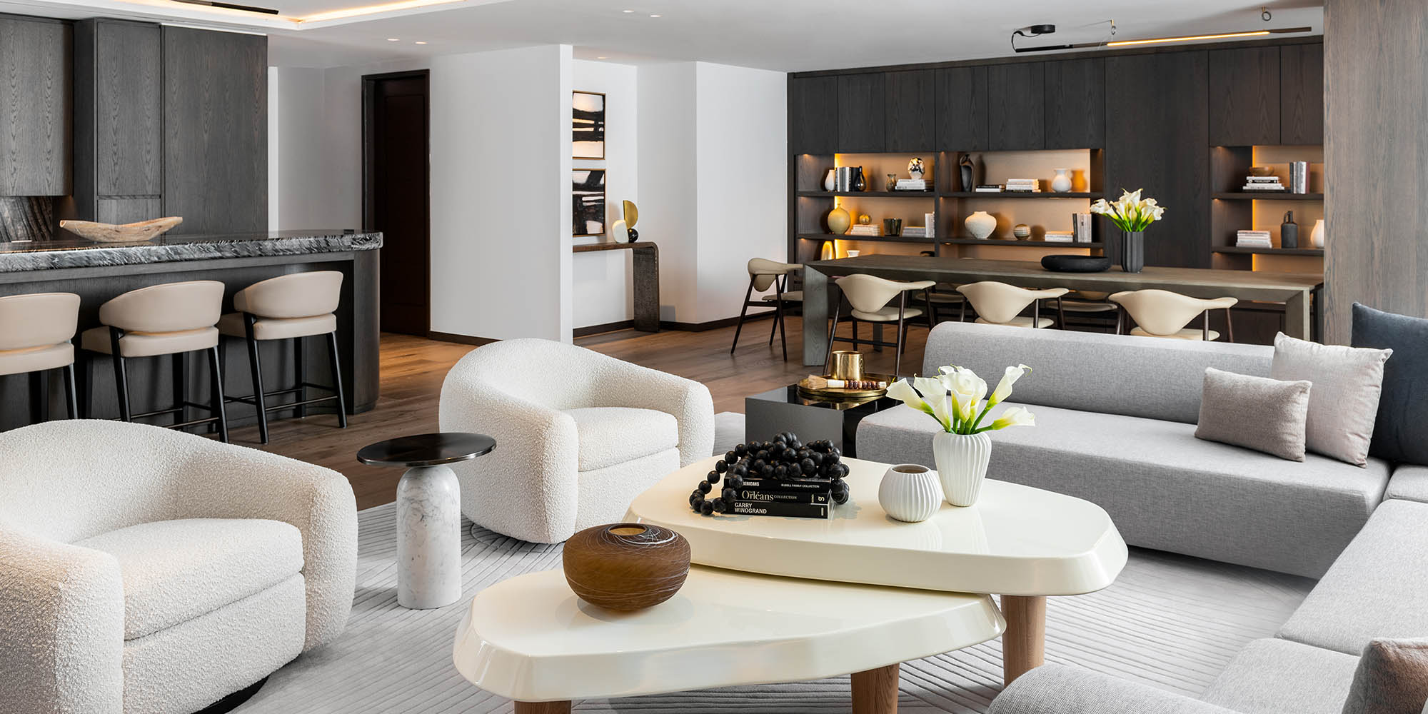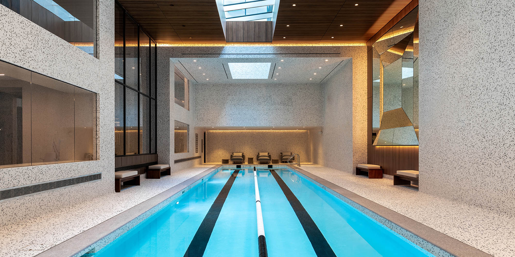 The building form positively impacts units on the interior. The stepped façade along the east and west elevations creates a unified building expression and allows maximum flexibility of interior unit layouts. In addition, a curved-glass guardrail system along continuous balconies facilitates unobstructed views out of the unit. The largest residences are situated along the north and south ends of the tower, with their dramatically sloped glazing and views of the Potomac river, Washington Monument, and Jefferson Memorial.