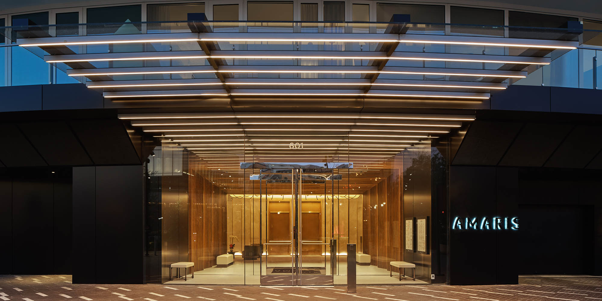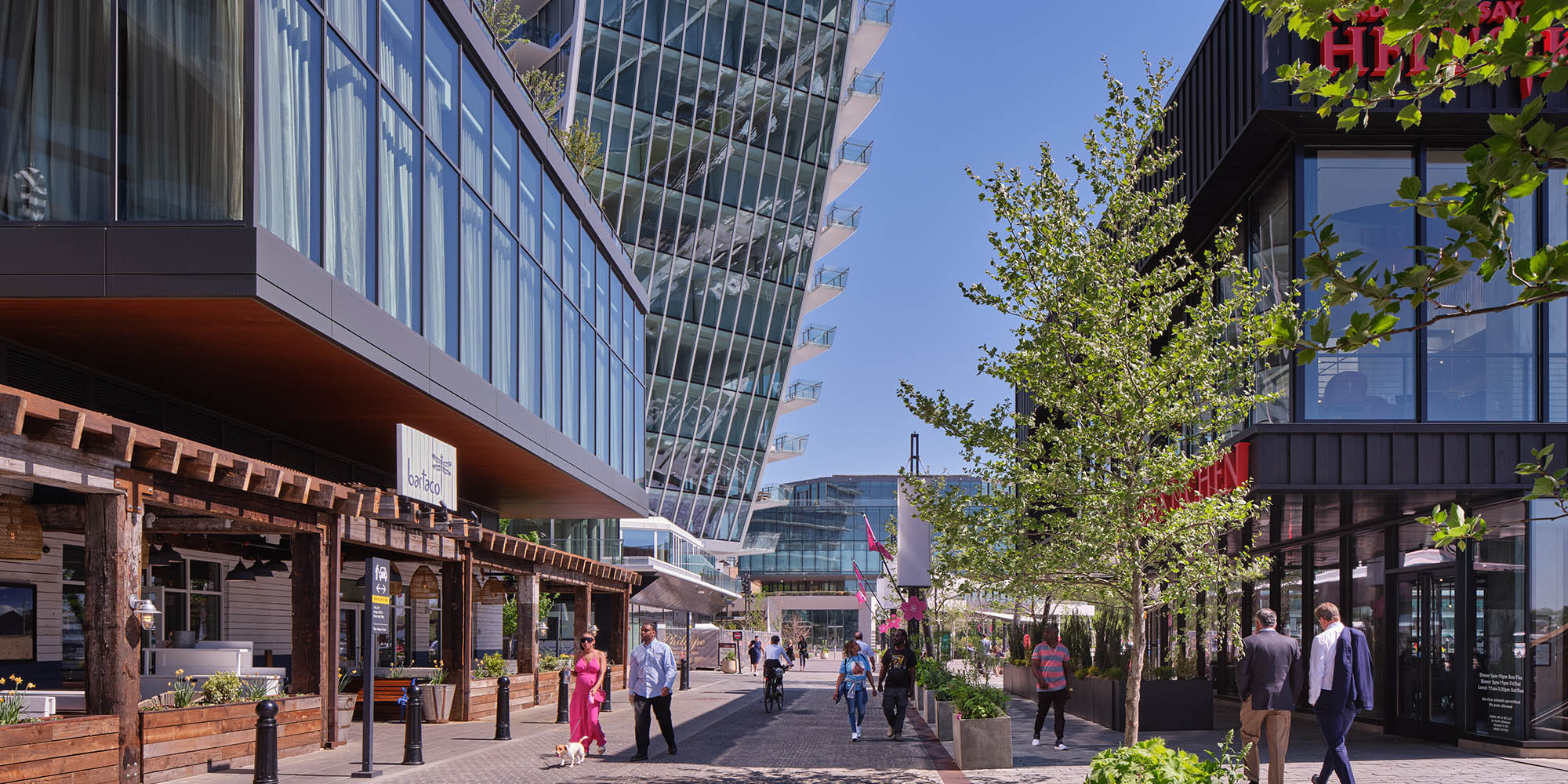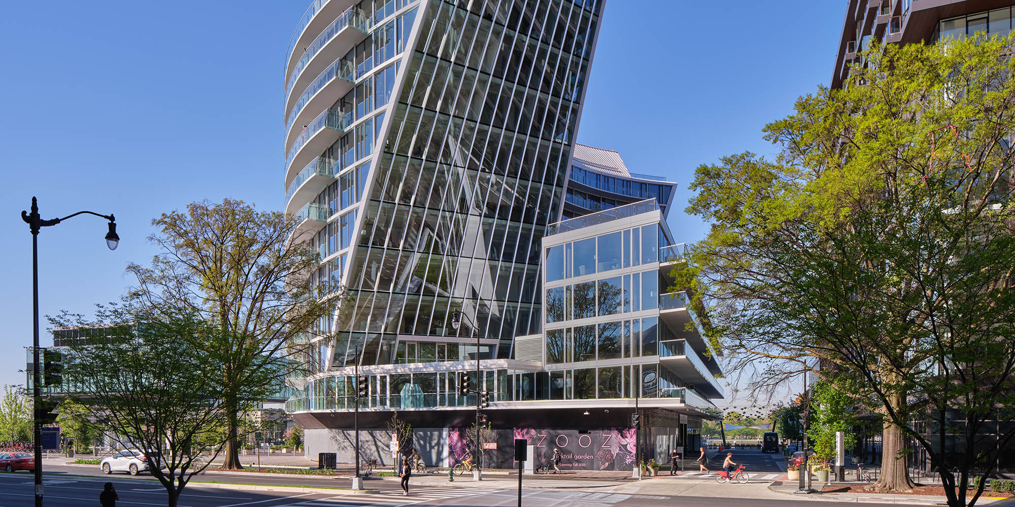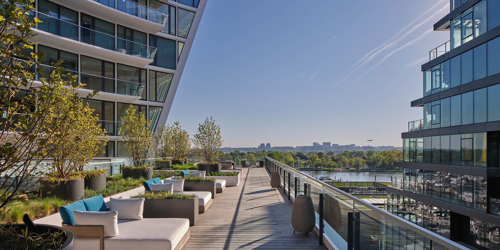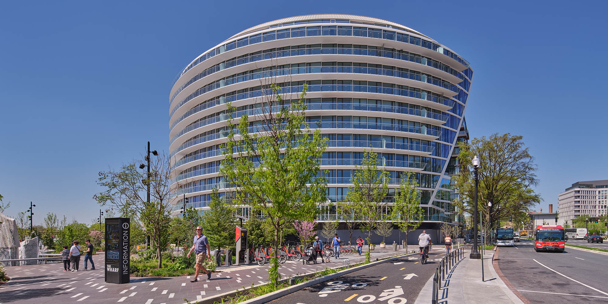 Forming a terminus to a row of buildings in The Wharf development of Washington D.C., the Amaris is a mixed-use residential building designed by Rafael Viñoly Architects with a unique form that maximizes views, allows daylight deep within each residential unit, and creates a recognizable and distinctive form along the Potomac River waterfront. The building overlooks the new M Street Landing Park, The Amaris’ new central public space.