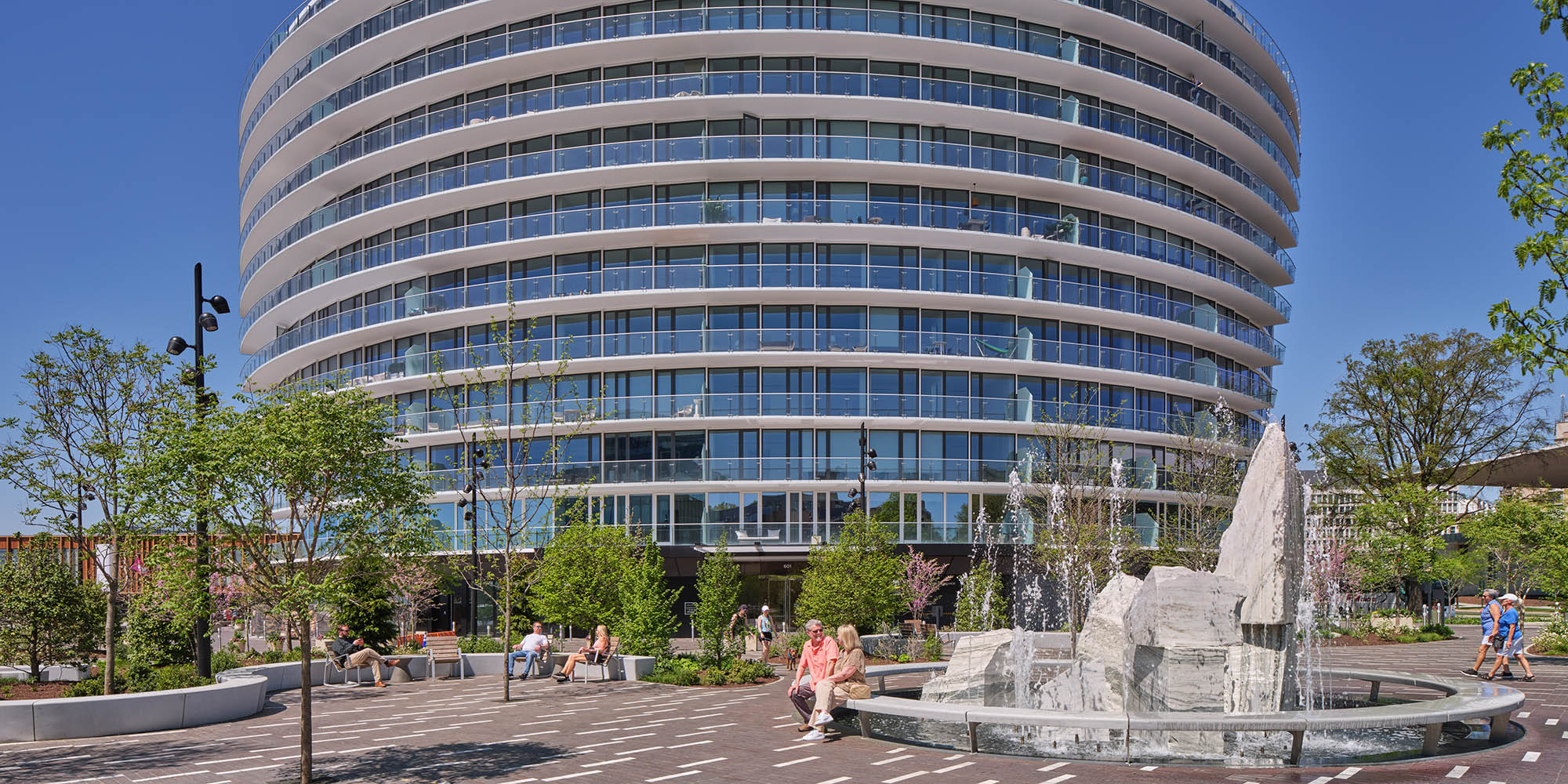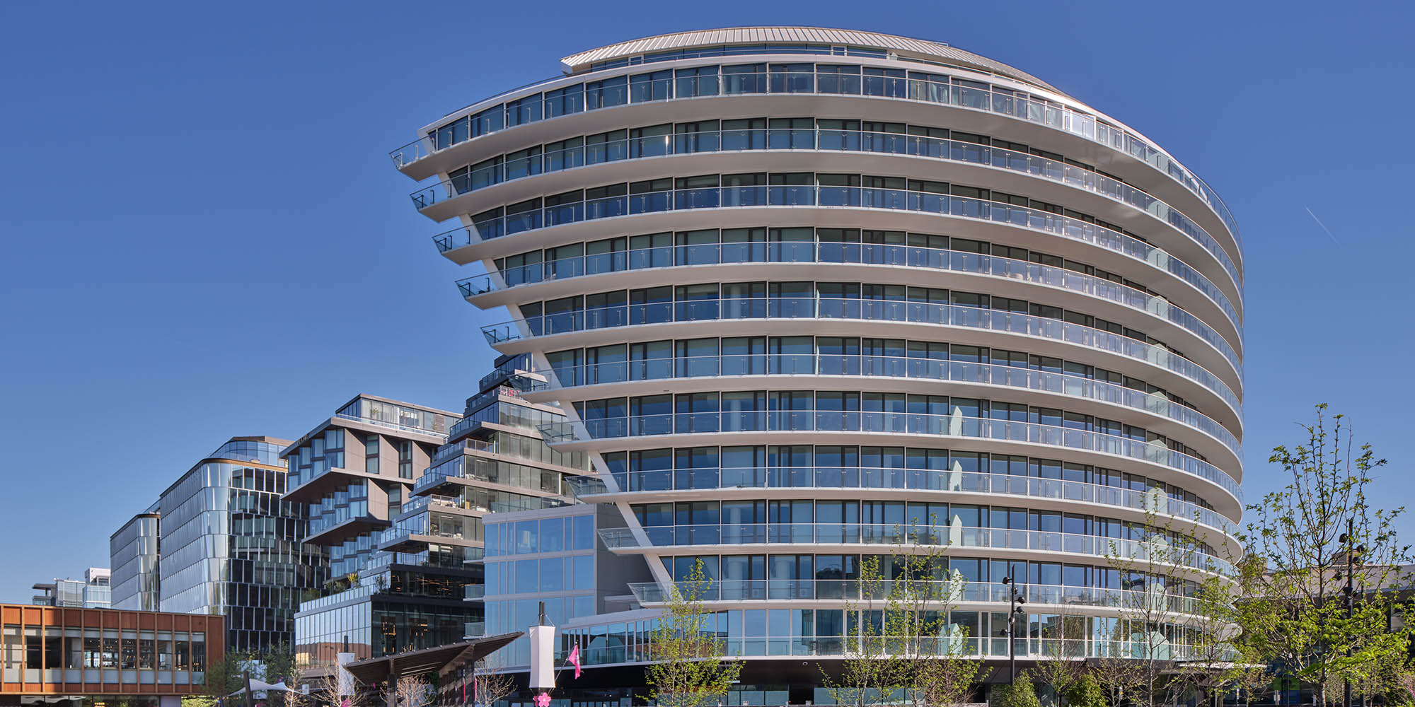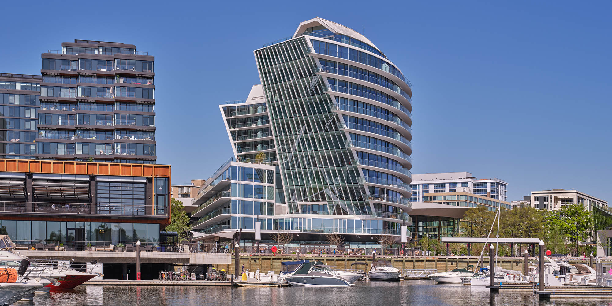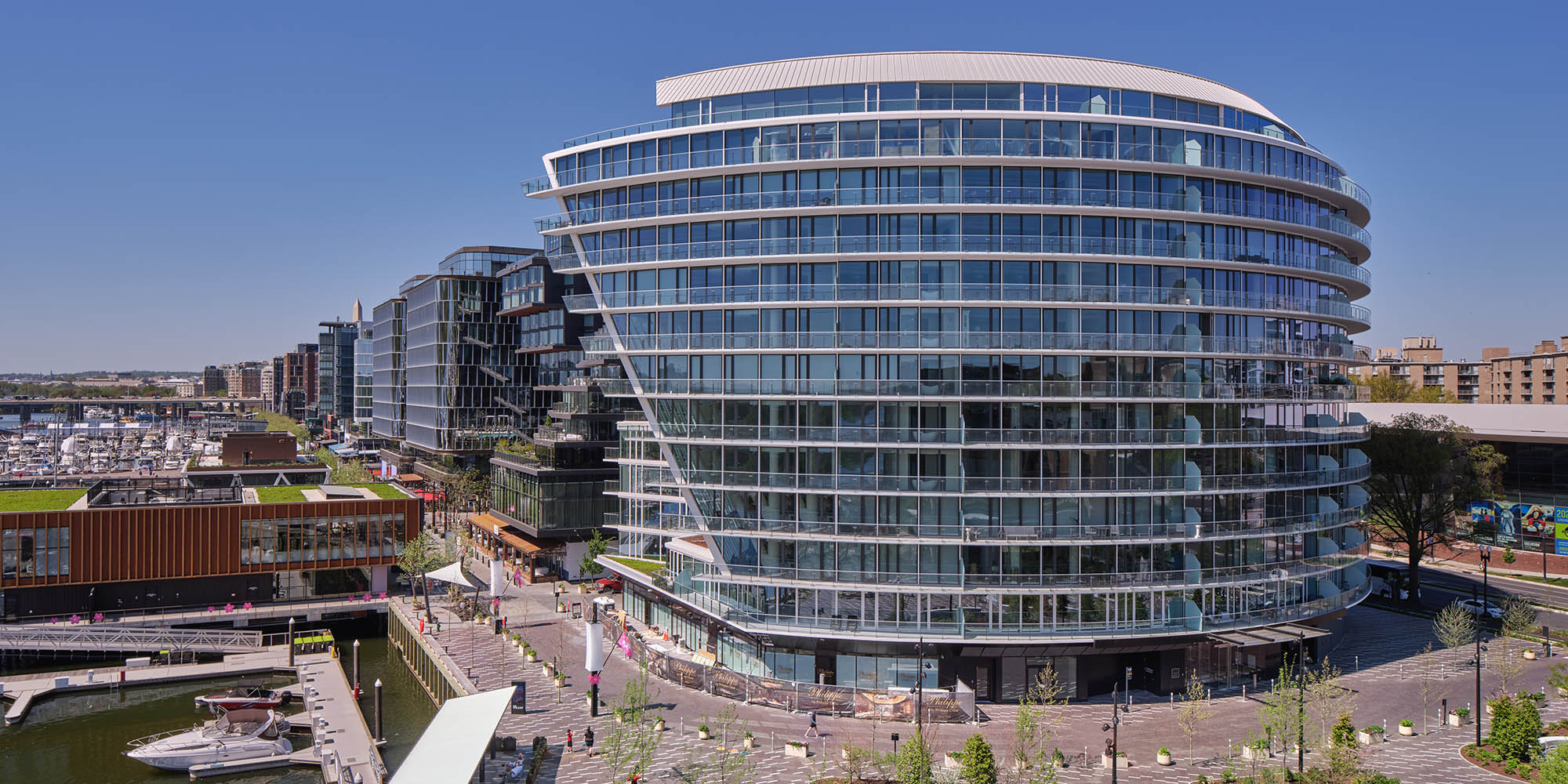 Mixed-use building with distinctive curvilinear building form that differentiates residential unit configurations and opens up public spaces along the Potomac River.