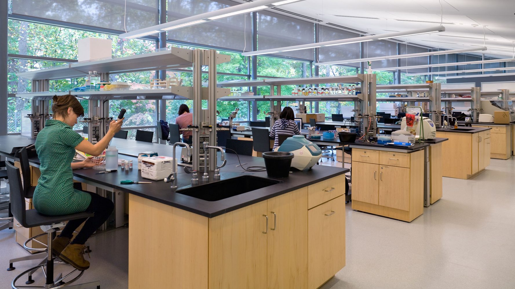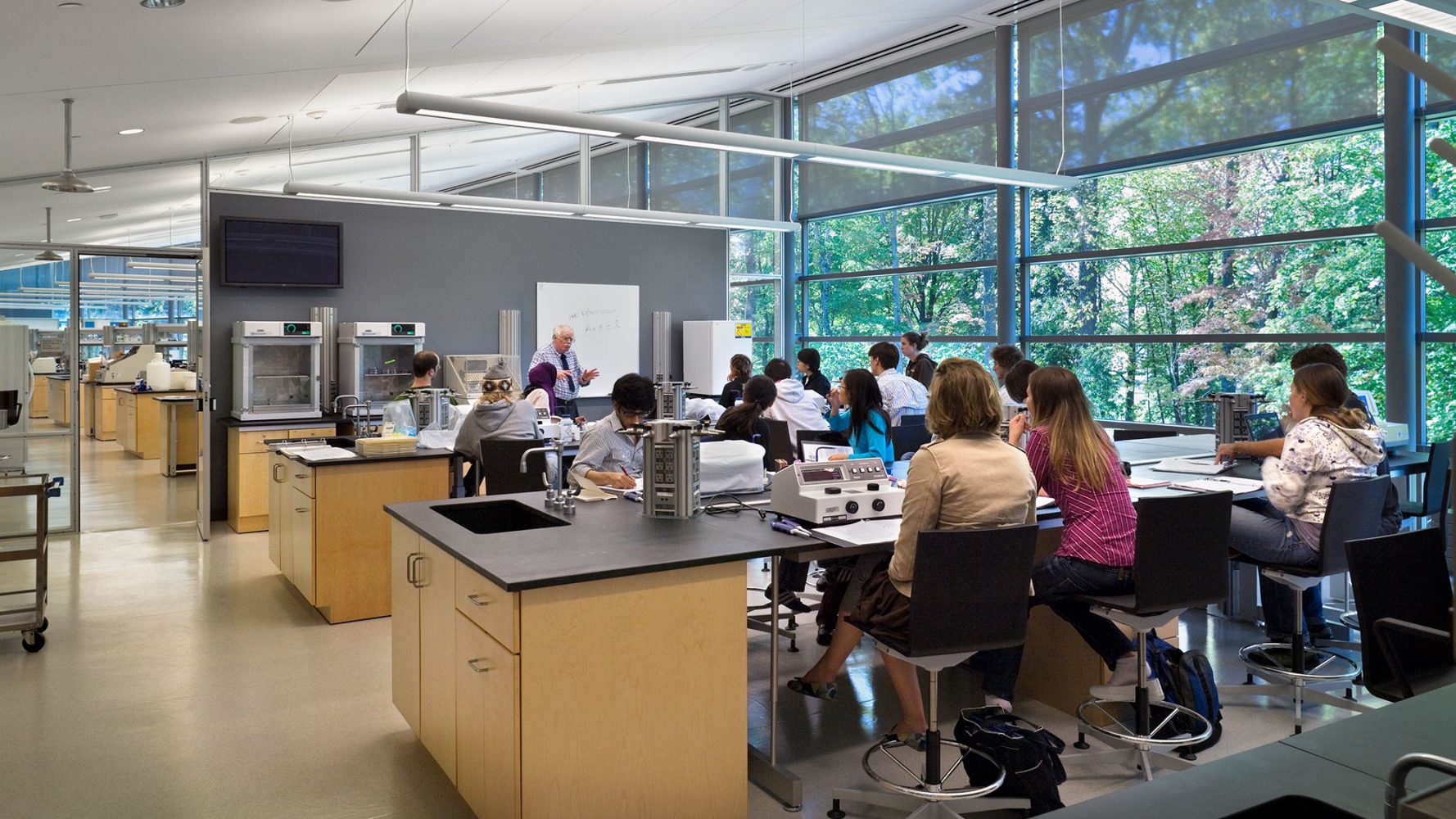 A building for practicing and teaching the sciences is built around a public atrium and flooded with dappled light and panoramic views of the surrounding forest.