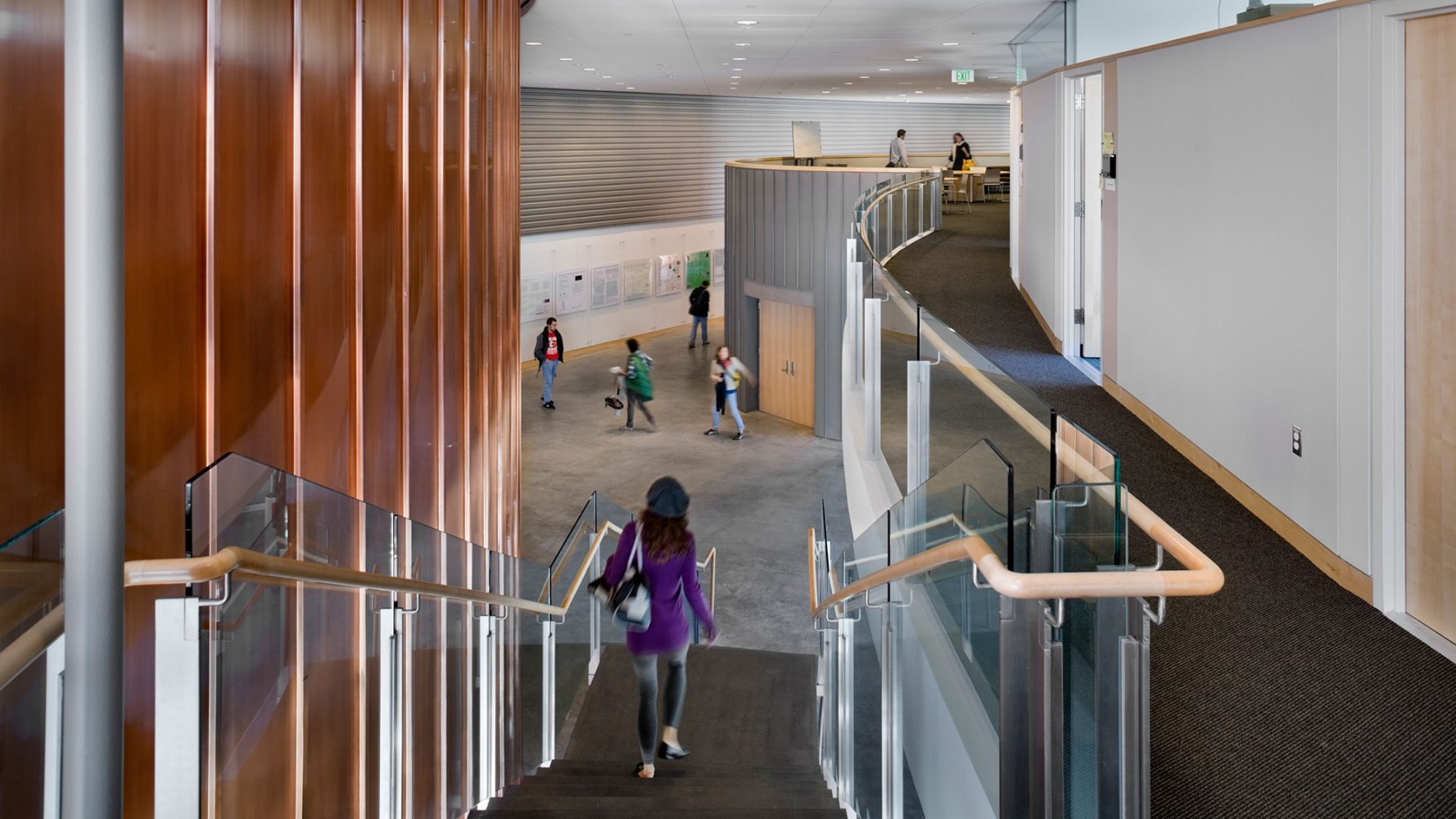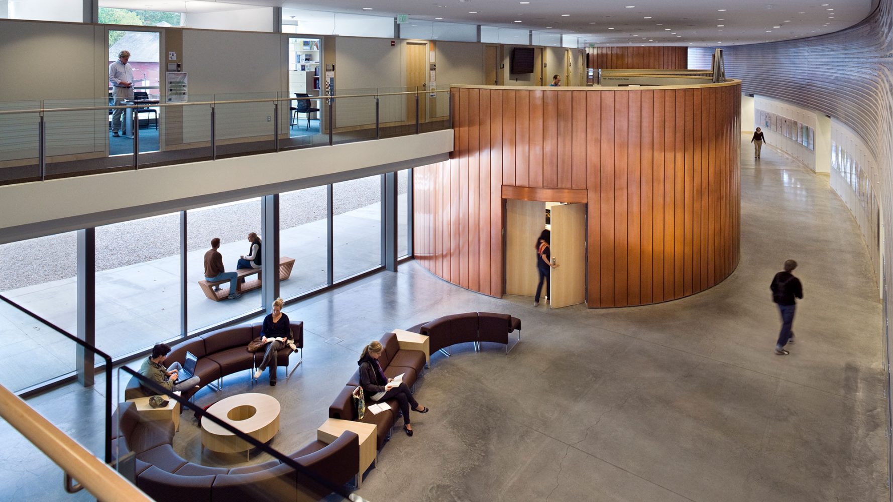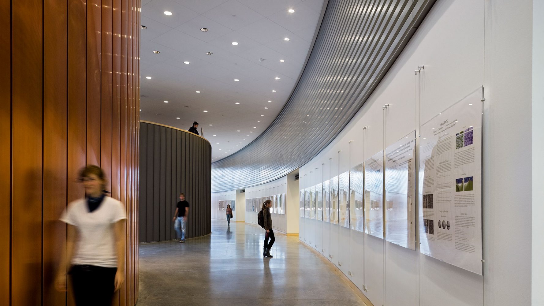 All of the laboratory spaces face a wooded area to the west through a full-height curtain wall system that stretches the length of the building. Within the lobby and overlooking the undulating landscape to the east, four freestanding pods clad in copper, stainless steel, and zinc contain an auditorium, two lecture rooms, and a seminar room, with public gathering areas situated between them. Faculty offices cantilever above the lobby on the second floor and are accessed via an open corridor that overlooks the lobby and expands to study terraces above the pods.