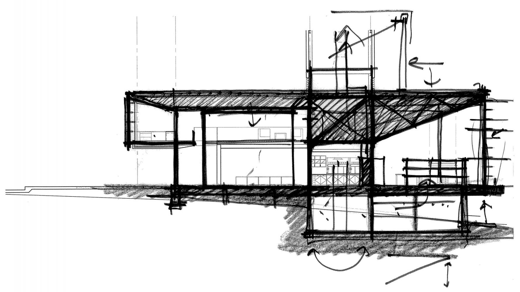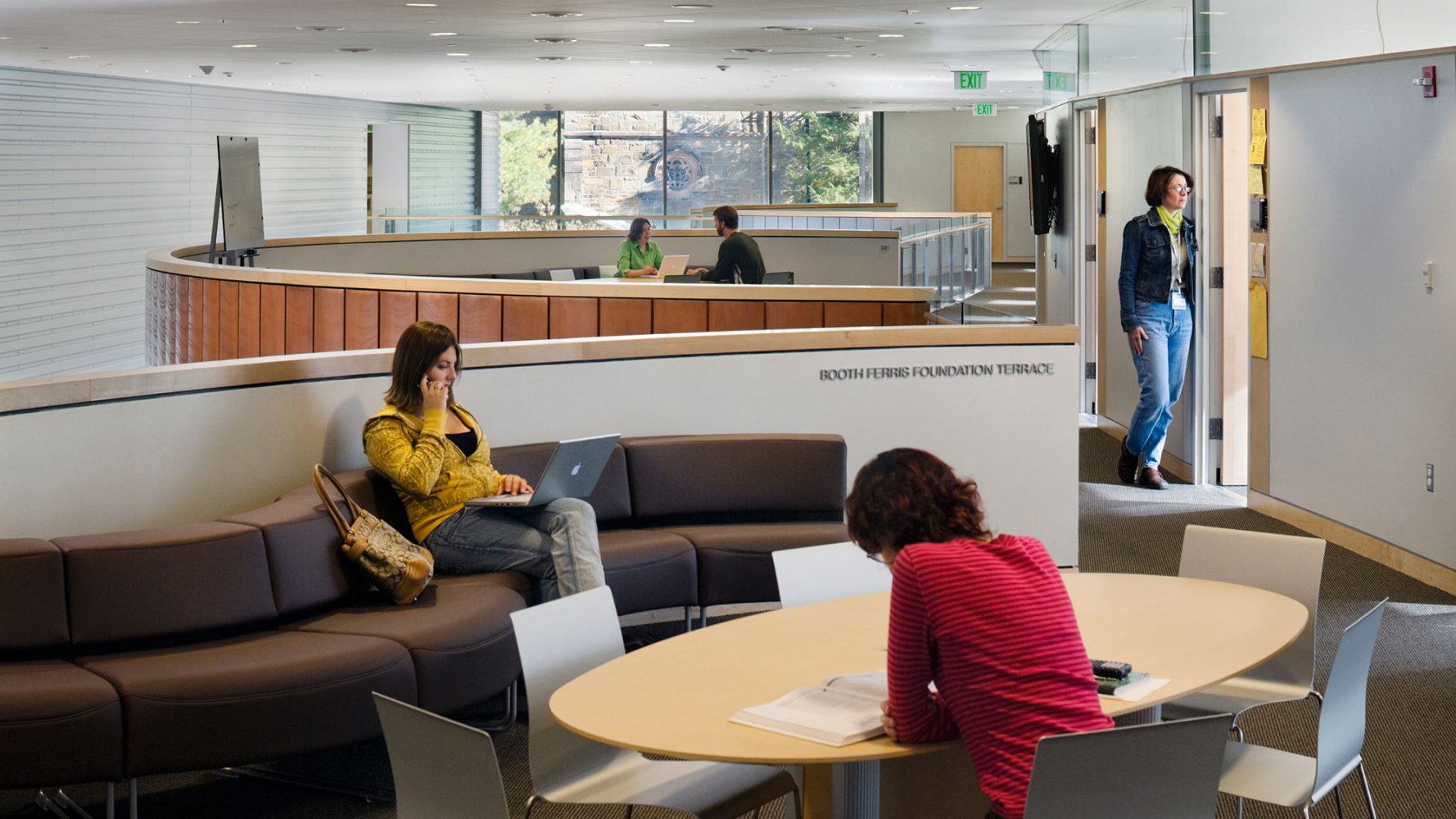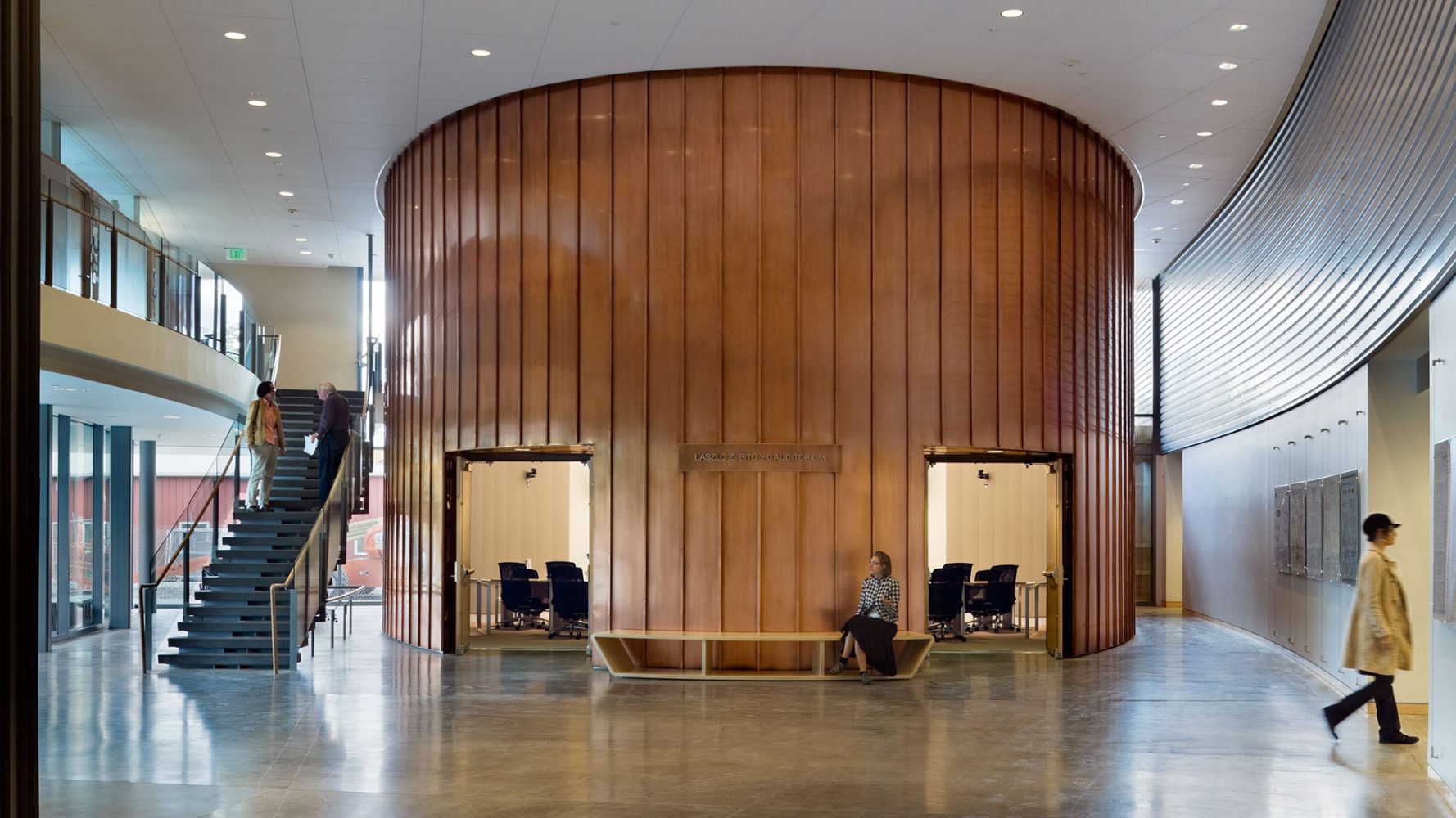 All of the laboratory spaces face a wooded area to the west through a full-height curtain wall system that stretches the length of the building. Within the lobby and overlooking the undulating landscape to the east, four freestanding pods clad in copper, stainless steel, and zinc contain an auditorium, two lecture rooms, and a seminar room, with public gathering areas situated between them. Faculty offices cantilever above the lobby on the second floor and are accessed via an open corridor that overlooks the lobby and expands to study terraces above the pods.