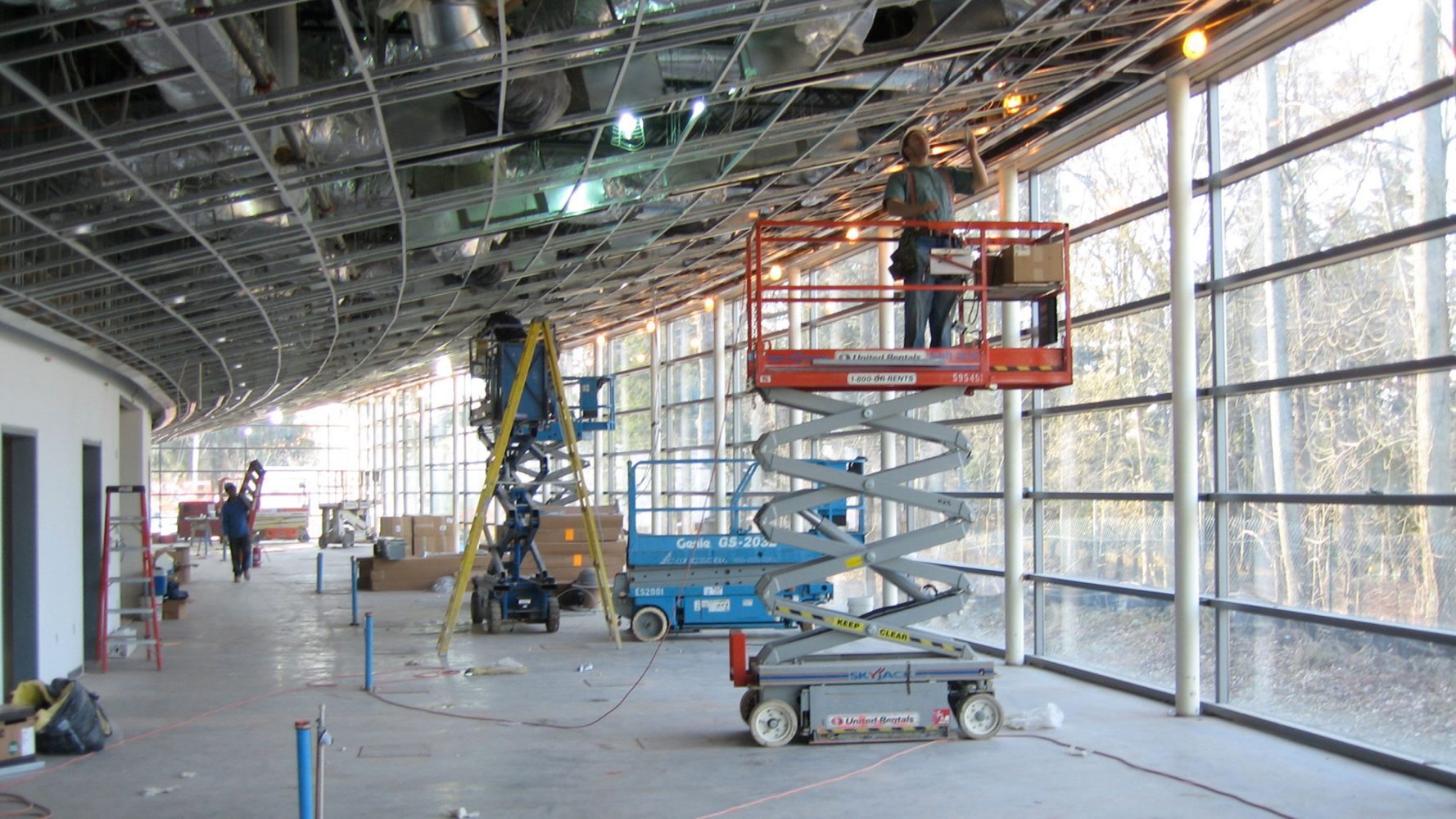 The Center’s design incorporates glass exterior walls, a large atrium, and an open-floor plan featuring flexible, multidisciplinary spaces for teaching, research, and discussion. The building is organized around a central spine that contains vertical circulation, support spaces, and MEP distribution services, negotiating between the teaching and research laboratories to the west and public spaces to the east. Vestibules pass through the spine from the lobby to access the laboratories, which were designed to be large and open interactive spaces shared by students and faculty. The laboratories are equipped with moveable benches and a customized bollard system that provide flexible distribution of the infrastructure utilities necessary for advanced scientific study and research. Such flexibility allows for easy reconfiguration to accommodate new initiatives.