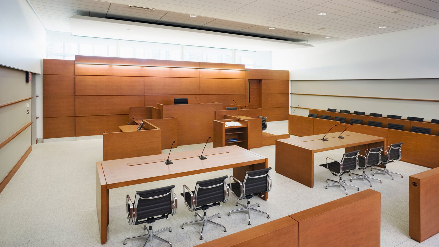 拥有18英尺(5.5米)楼板到楼板的高度,法庭拥有着居高临下但是适宜的空间尺度,可以容纳60 位观众和16位陪审员。所有法院都配备了最先进的视听技术和计算机技术。在大陪审团的房间,单独的平面屏幕允许陪审员从他们的椅子查看证据。定制设计的长凳、橱柜和镶板让人们想起19和20世纪的历史上的法庭。