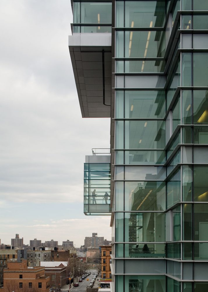 南立面的各种烧结玻璃幕墙屏蔽了私密的流线,同时引导自然光深入到建筑内部。北边来的充足的太阳光穿过透明的立面将公共流线暴露于服务社区的大庭院。