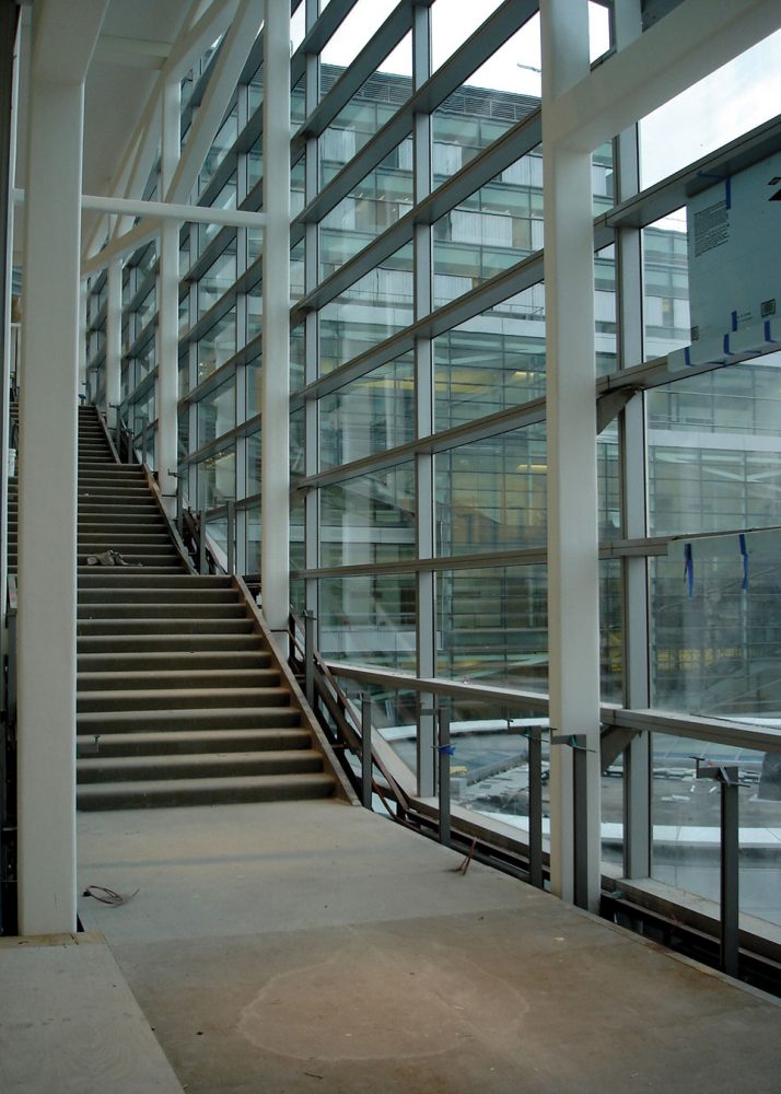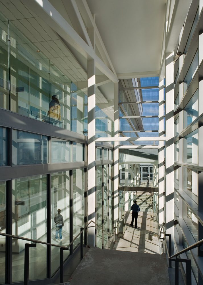 虽然自然光线和景观是必需的,高度的安全性要求也同时需要保护性的设计。司法厅表现了司法系统的开放性和透明性:烧结玻璃组成的半透明幕墙,让日光渗透到建筑物深处的同时又遮蔽了私密的交通走廊。手风琴折叠状的设计包括“光架”,反射日光和减少热量和眩光。漫射玻璃使得从外面看内部的不透明性,同时又提供了从内部看外面的视野。