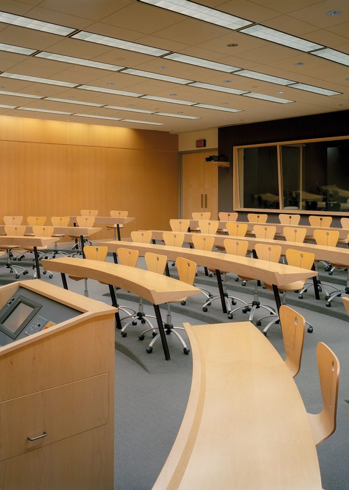 一个三层的几乎贯穿整个街区的中庭组织了为学生,教师,访问学者和政策制定者服务的各种功能,连接所有空间,包括一个藏书丰富的图书馆,教室和会议空间。自然光线通过玻璃沐浴到整个中庭。