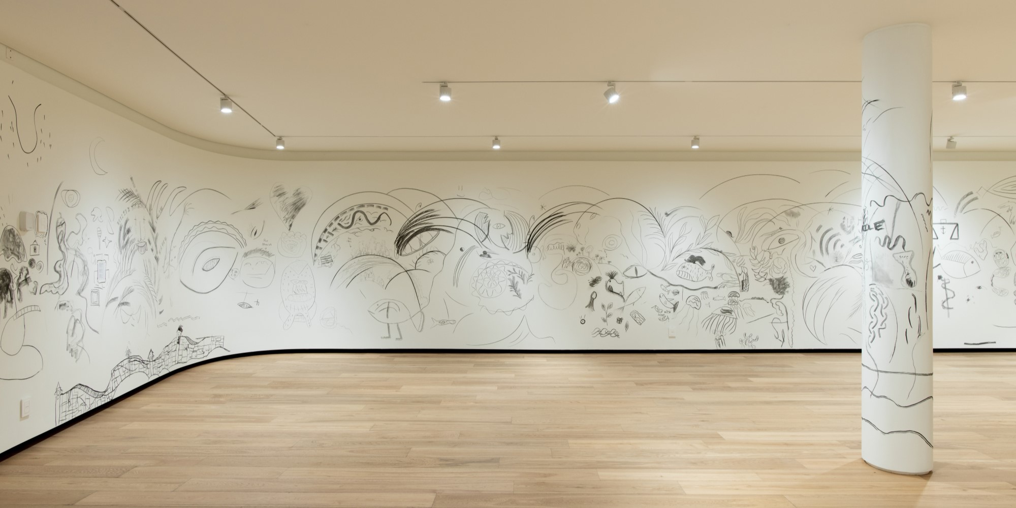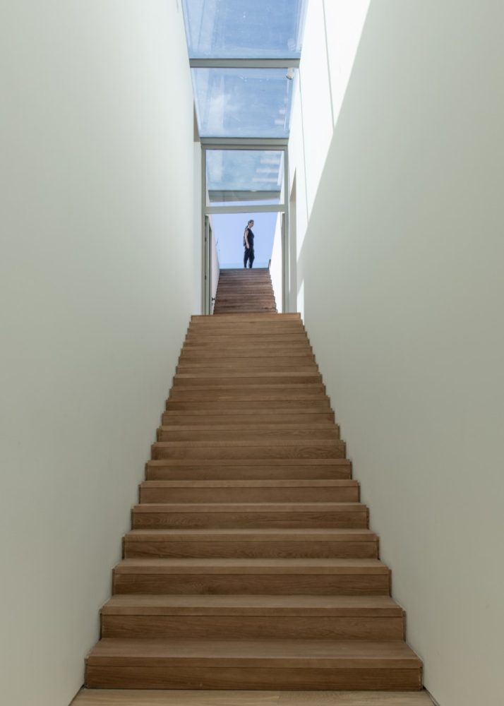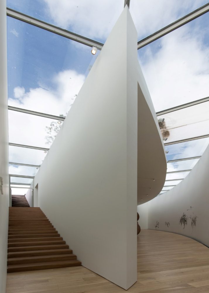 The interior of the building is made up of a large double-height main space under a perimeter skylight that floods the interior with natural light. Ancillary spaces occupy the east of the plan and stairs run along the north connecting the main gallery on the ground floor to a secondary gallery in the basement and an events terrace dominated by views and plantings on the roof. The building’s post-tensioned concrete floor slabs allow enormous spans and highly flexible gallery configurations. White plaster and natural wood finishes provide a neutral backdrop for the artwork displayed within.