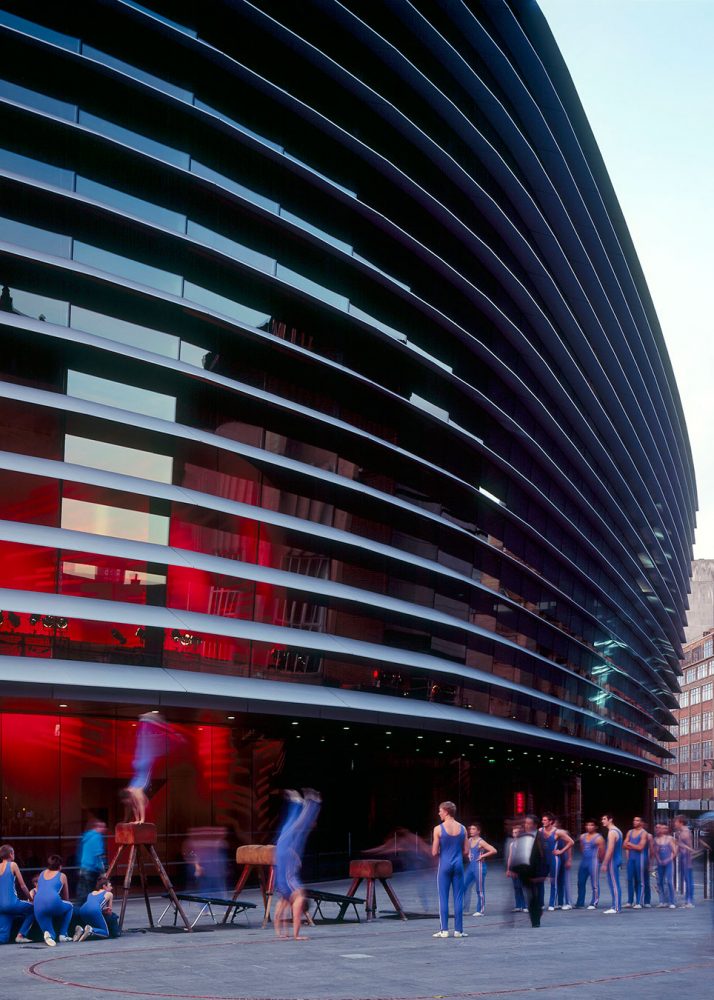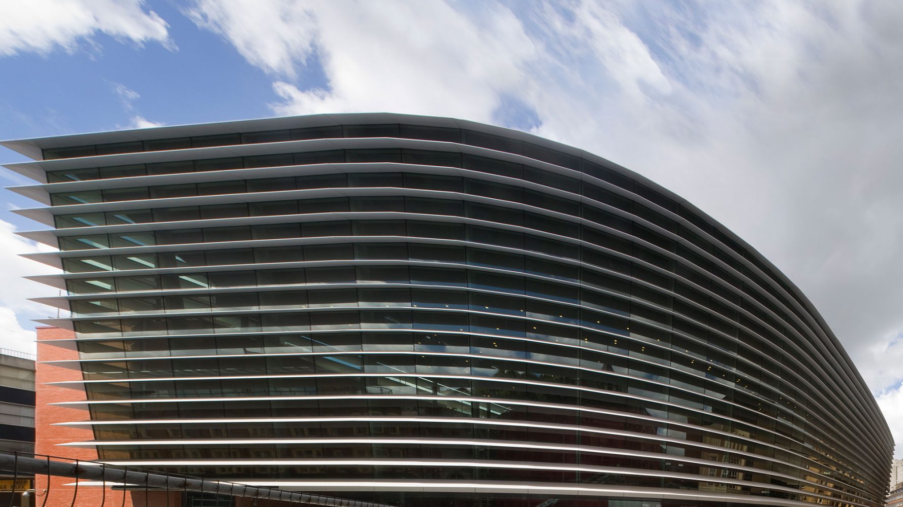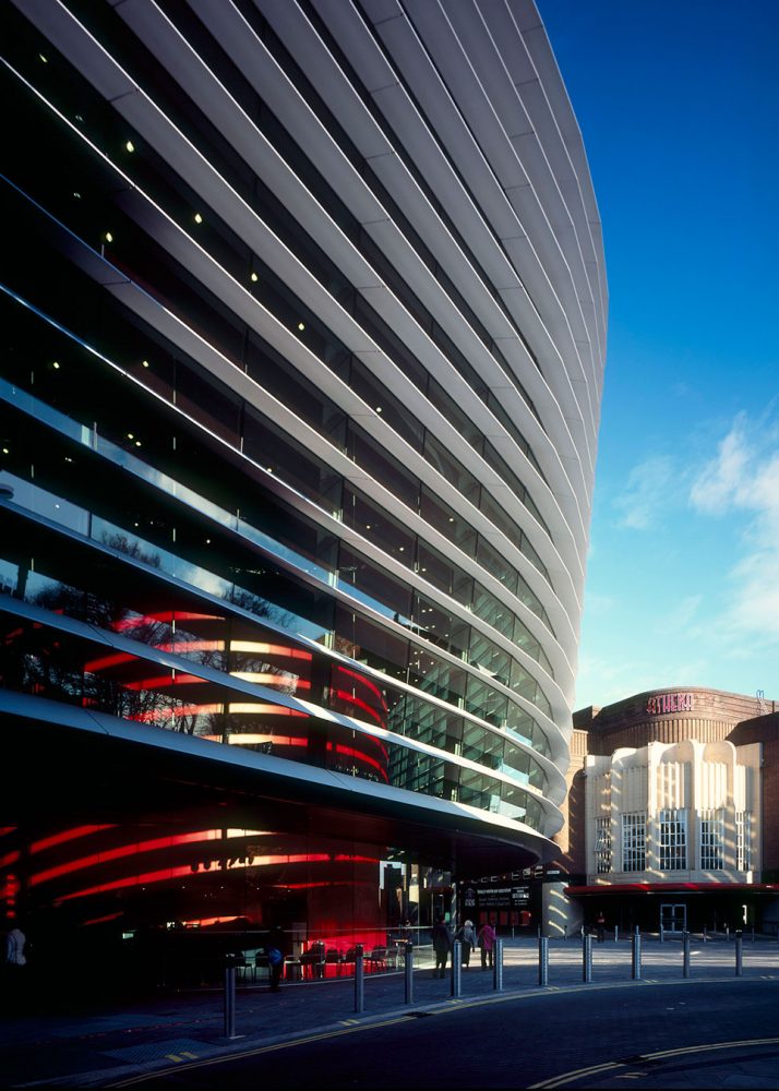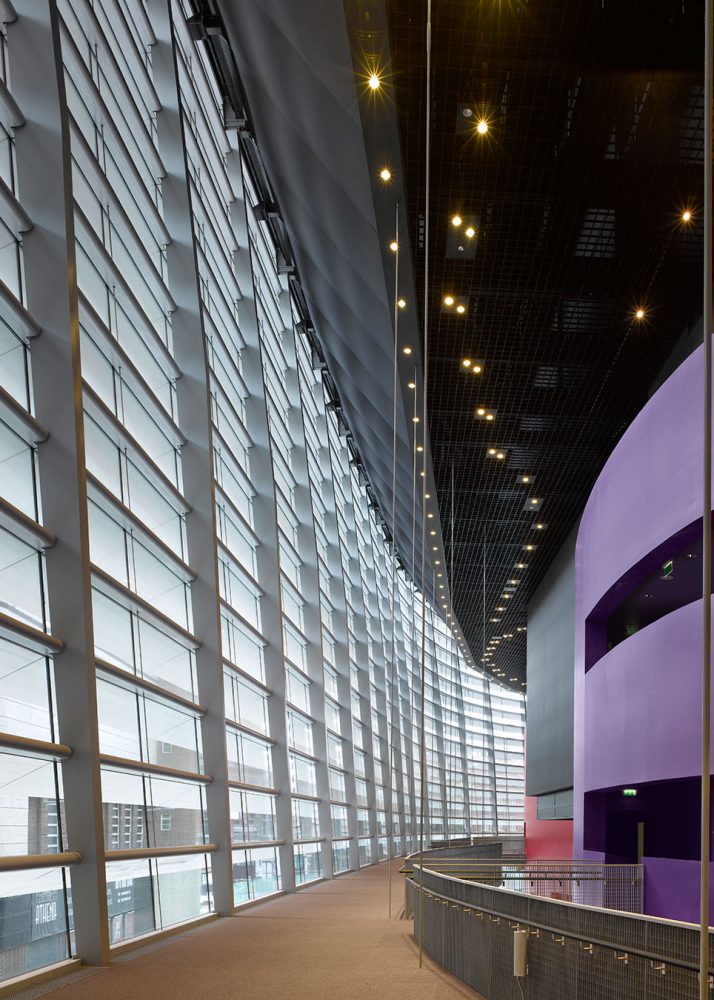 As an anchor for redevelopment of the St. George’s Conservation Area in downtown Leicester, the city’s new theater, Curve, seeks to engage community life. To fulfill this mission, Rafael Viñoly Architects turned the typical theater configuration “inside out,” exposing the production, construction, craft, and technical components of the building to the public, and integrated the performance into the life of the city.