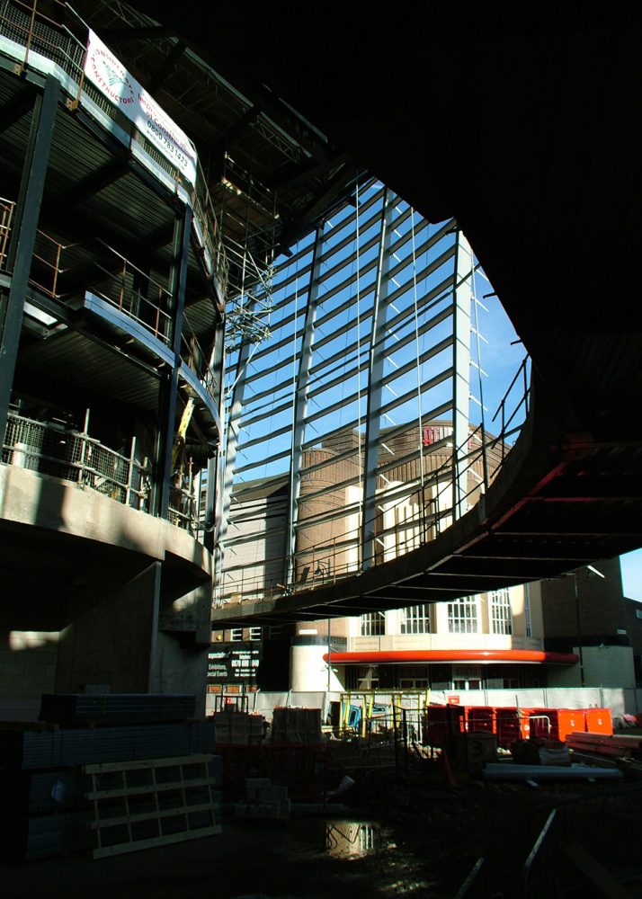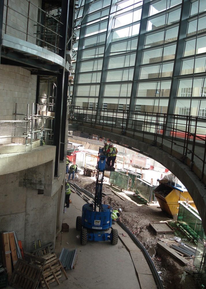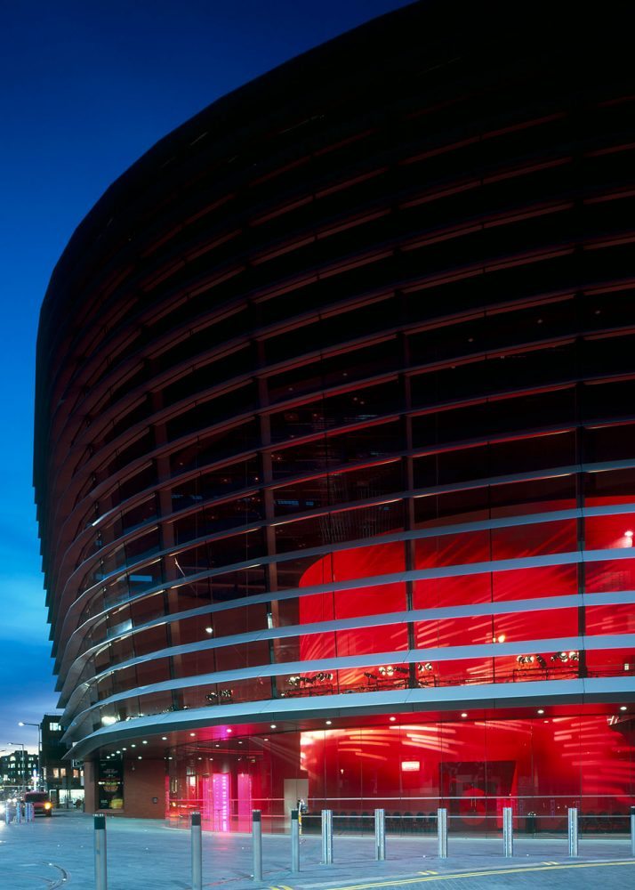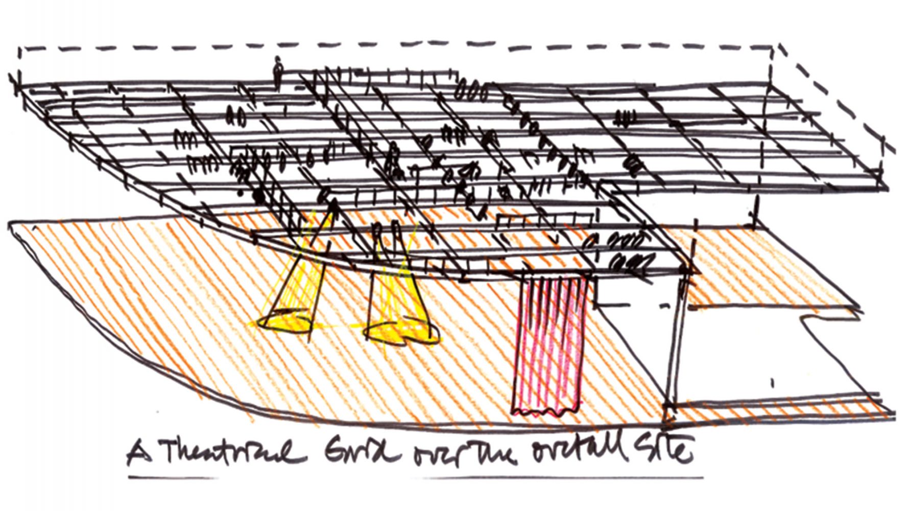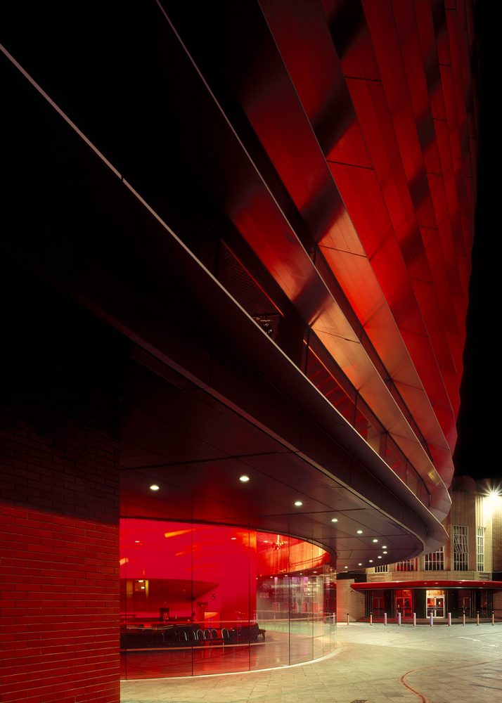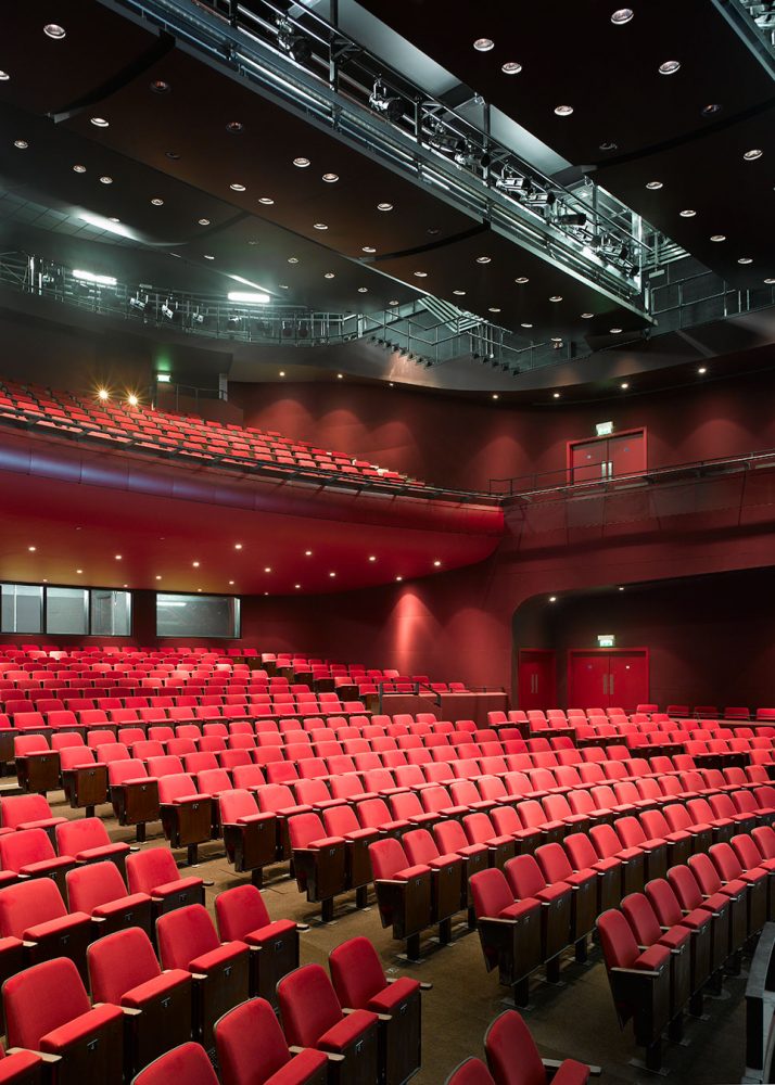 The building’s cantilevered technical roof extends the theatrical infrastructure to the very edge of the site, where a permeable curtain wall allows boundaries to blur between the making and consumption of theater and the life, rhythms, and culture of the city of Leicester.