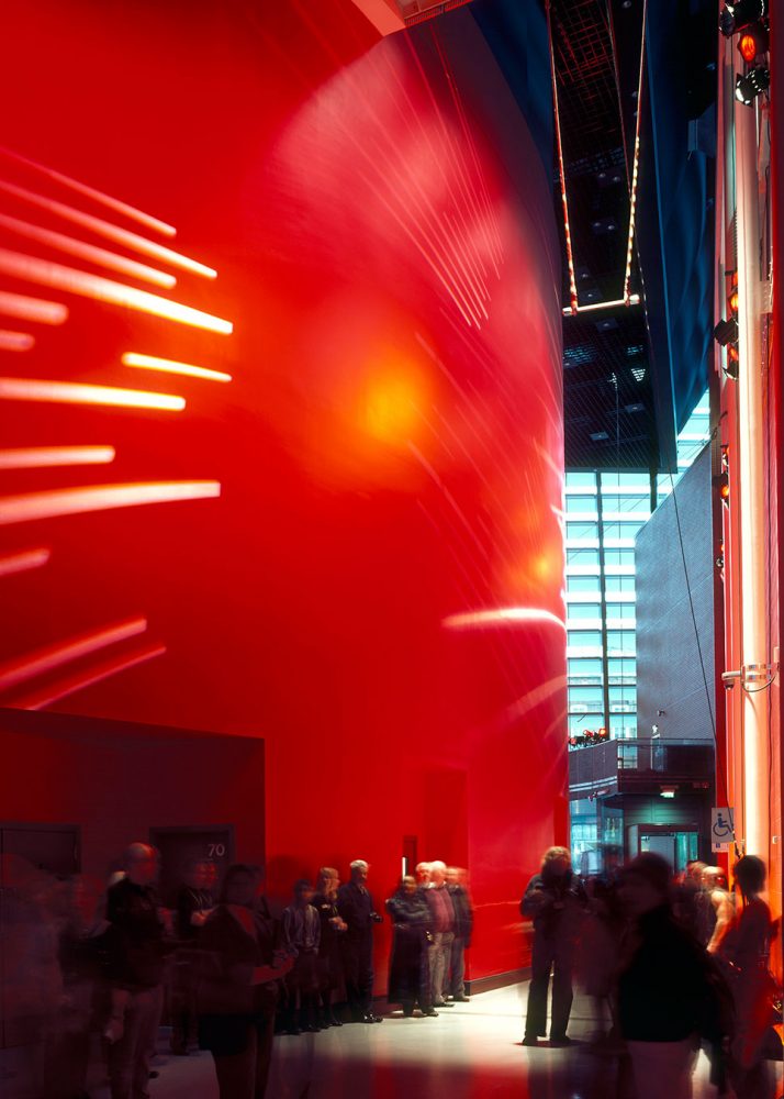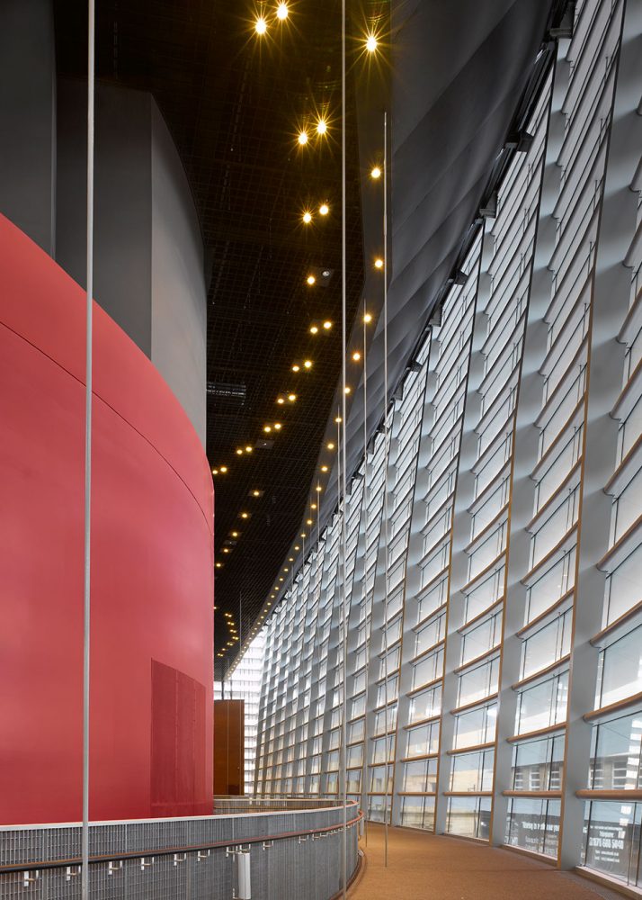 Rectangular building volumes along the north and west elevations contain administrative offices, production facilities, dressing rooms, rehearsal spaces, the box office, a recording studio, a kitchen, and other support functions. Circulation balconies at upper levels overlook the foyer and allow for physical and visual connections among staff, performers, and the audience.