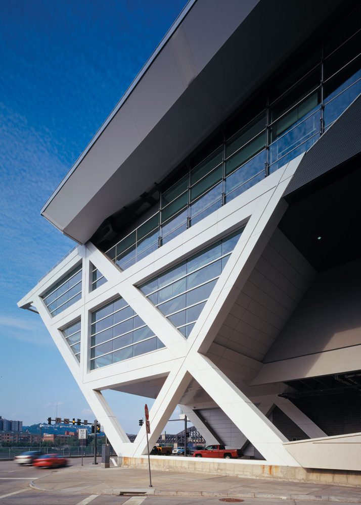 世界上第一个获得绿色建筑白金认证的会议中心,设计的结构灵感汲取于跨越匹兹堡的阿勒格尼河大桥,以一个悬吊的大屋顶支撑建筑整体轮廓,同时大屋顶可以带来被动通风和无柱大空间。