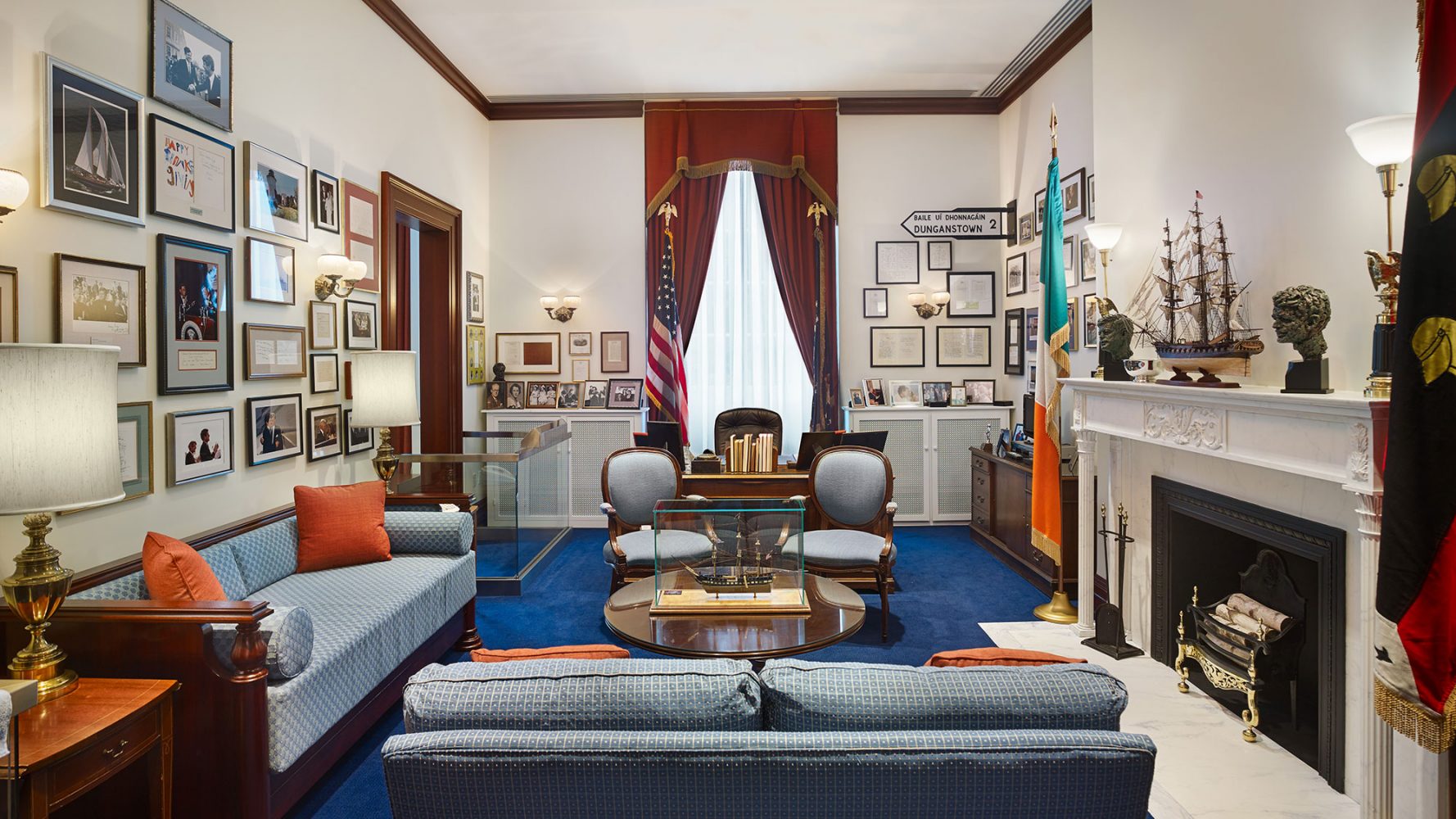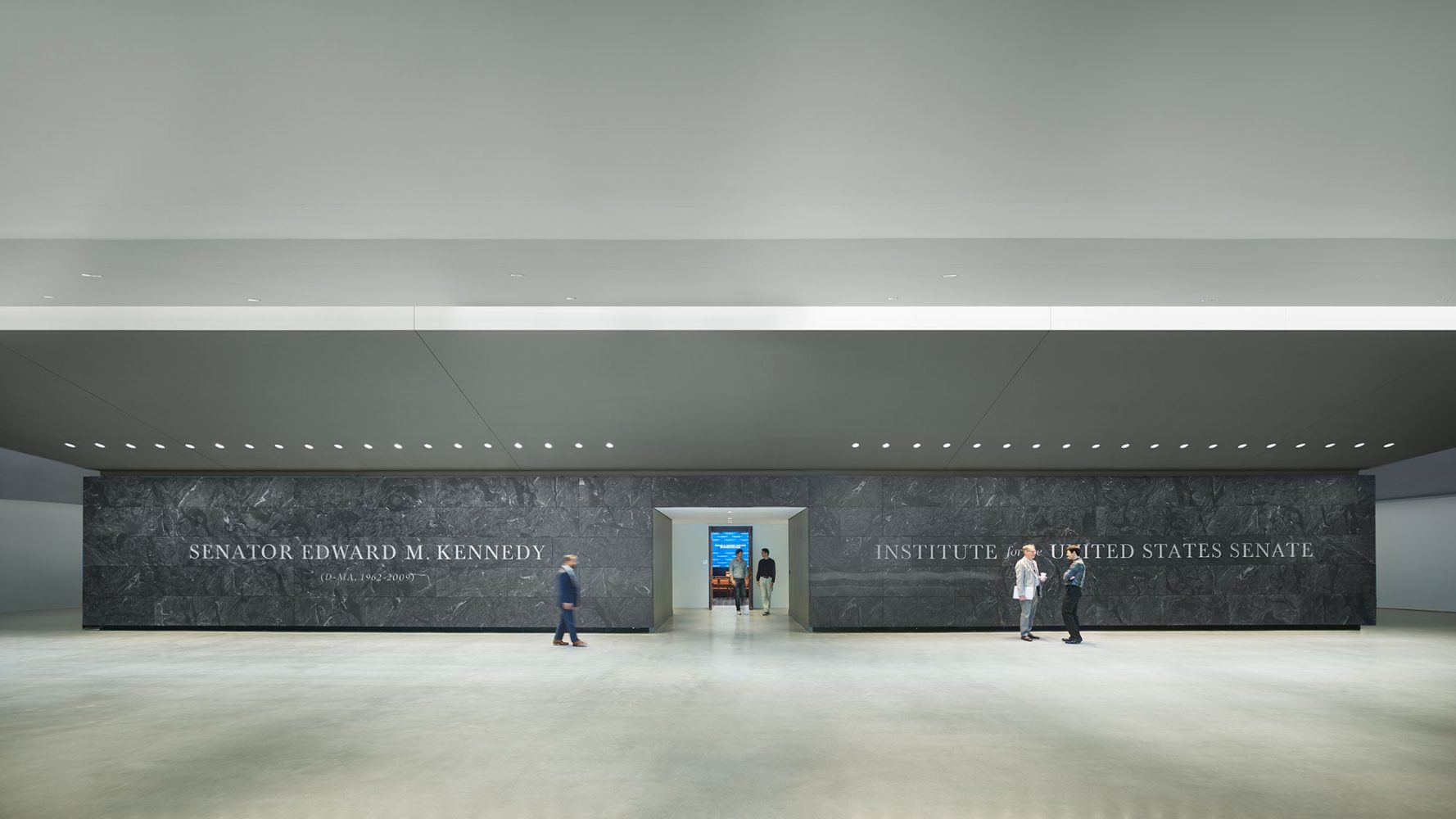 爱德华·肯尼迪美国参议院学院的建筑设计与功能组织促进了交流,鼓励了参与,并通过建筑中心可供模拟议院,演讲,多媒体演示使用的议事厅设计,其上方可容纳300名观众的展廊,以及展览区域的向心设计和教室的学习环境来提升建筑的教育功能。区域共计可容纳300名观众的展廊。建筑内部有一个环绕数字化展示厅。同时展出的是肯尼迪参议员的办公室和会议室的复制品,其中包含参议员使用过的家具,图片和个人物品。