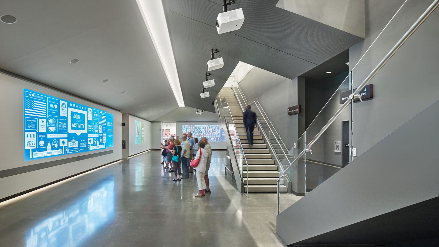建筑提供交互体验功能,通过一个虚拟的角色扮演游戏,让参观者体验参议院中一天的生活体验。通过使用个人无线平板电脑,参观者可以自身或者通过电子设备探索参议院学院,与展示屏和其他游客进行互动,以体验在美国通过一项法律的复杂性。