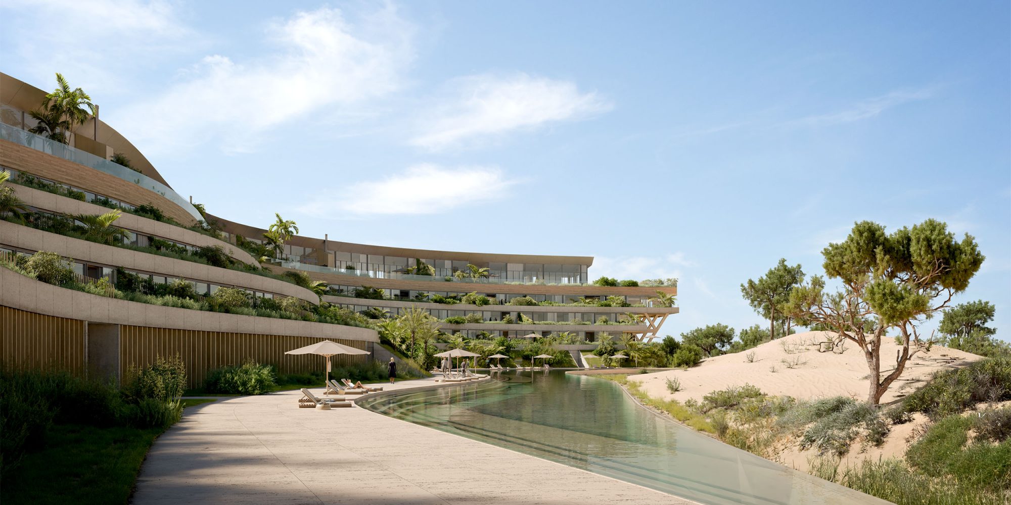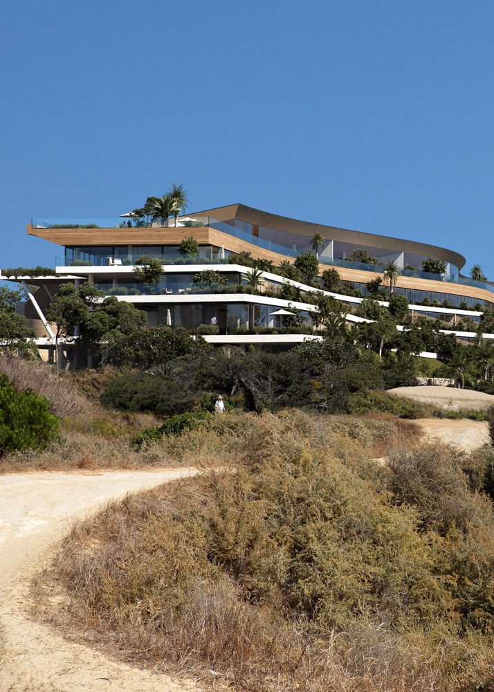 An oceanfront, multi-family residential building features a long, low-slung, and sinewy shape that integrates it with the organic landscape of its pristine setting to minimize its visual impact on the neighborhood and make it completely invisible from the public beach.