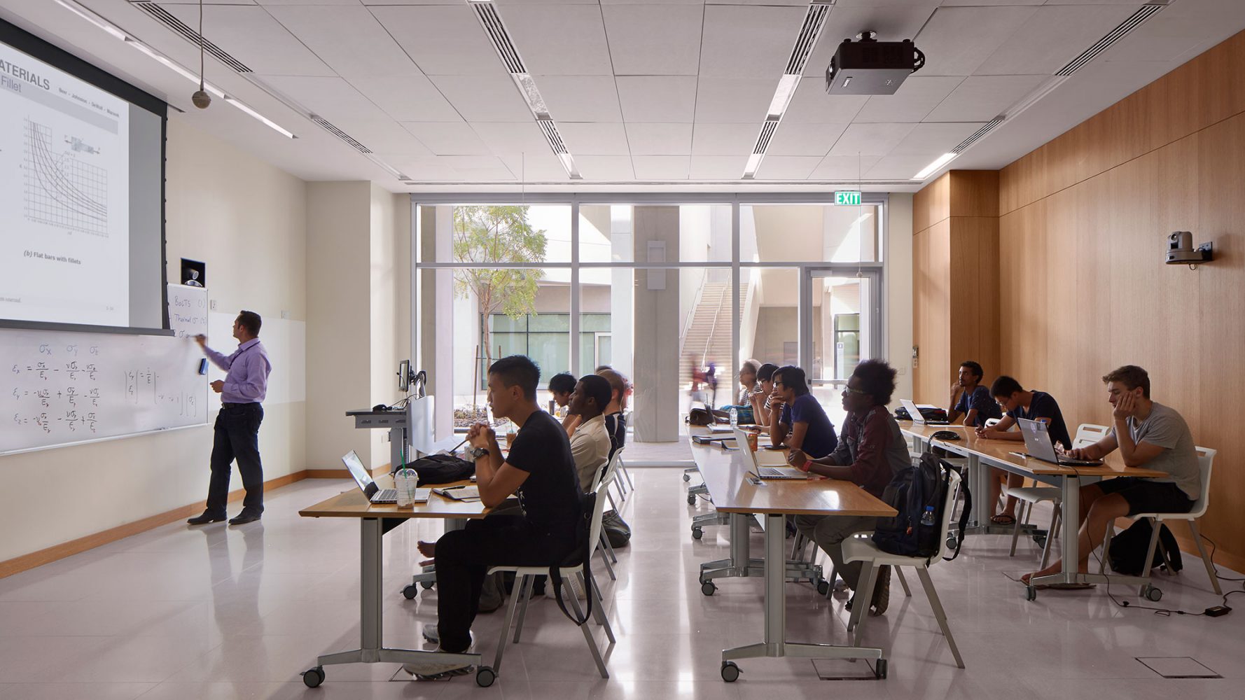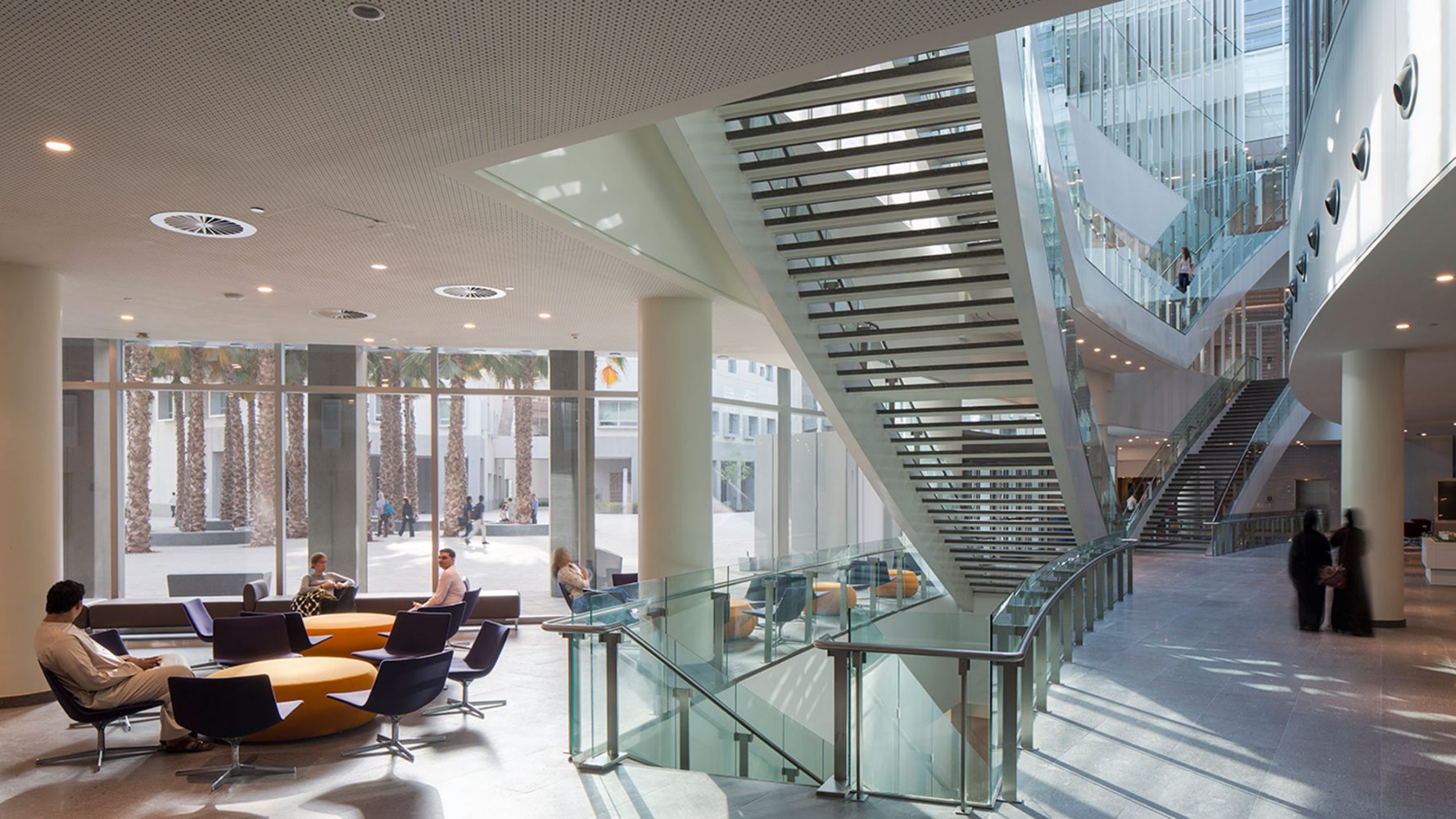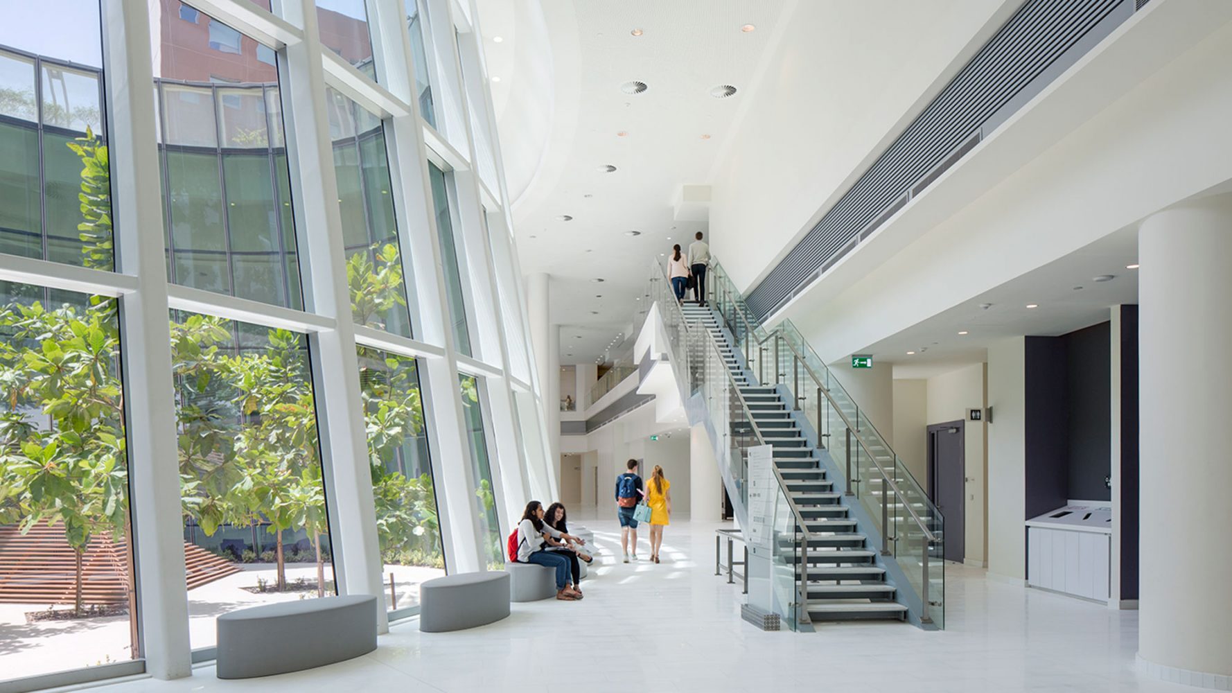 El sistema de circulación dividido en niveles también contribuye a la experiencia del peatón en una zona urbana de gran densidad. Todos los edificios son de uso mixto. A nivel del suelo, la calle principal del campus y tres plazas ofrecen acceso a los espacios académicos, mientras que la Línea Alta ajardinada del Nivel 2 da acceso a las residencias estudiantiles y del personal académico. Estos edificios integrados verticalmente y diseñados alrededor de espacios sociales exteriores a la sombra respaldan el objetivo de la universidad de fomentar la colaboración interdisciplinaria entre investigadores y alumnos.