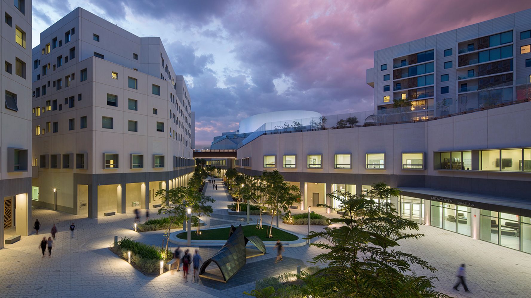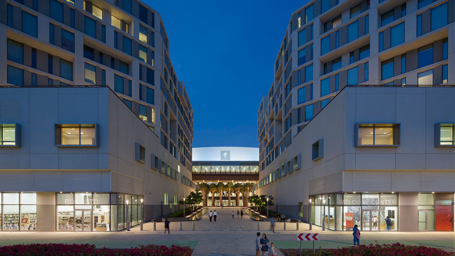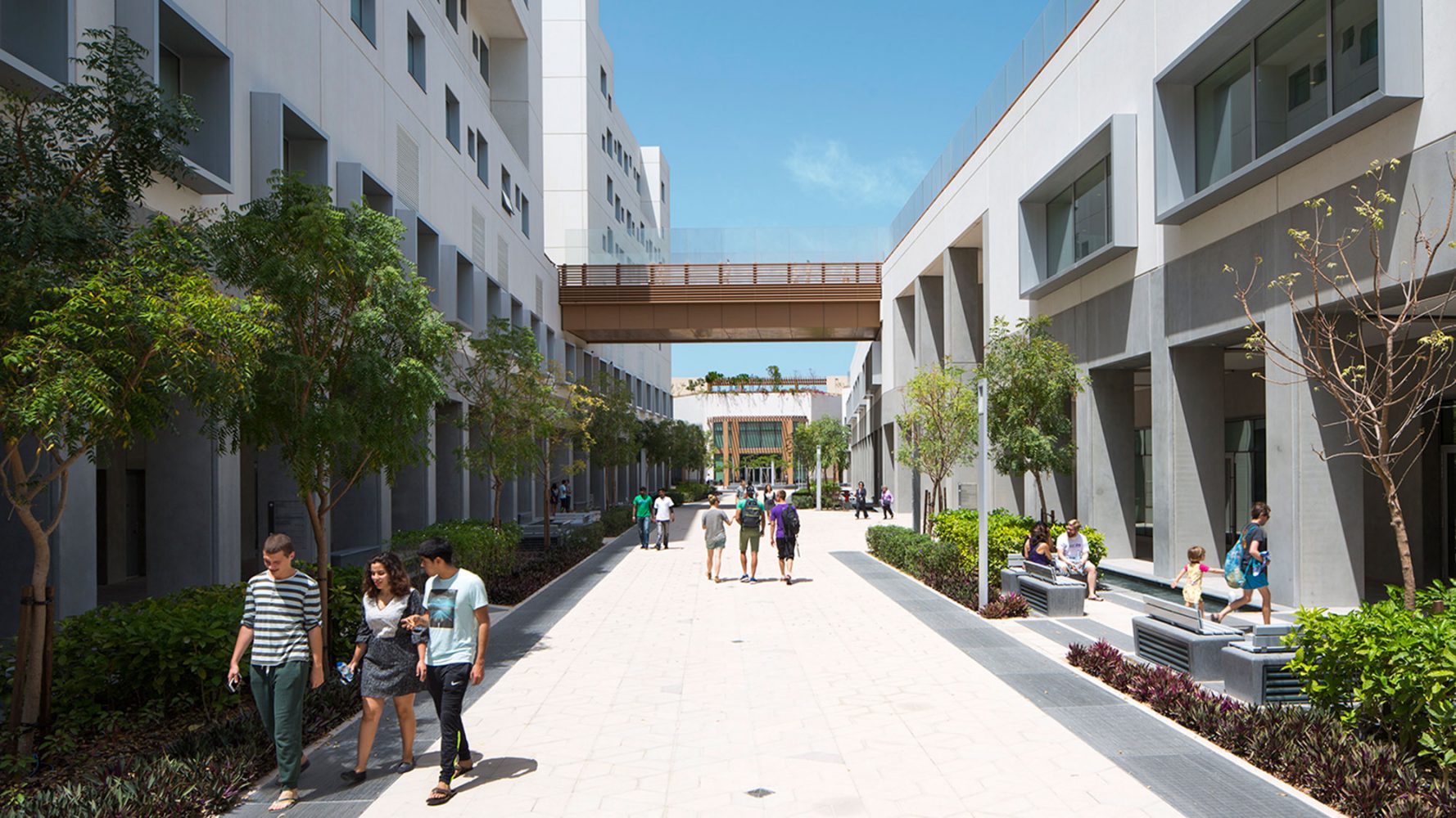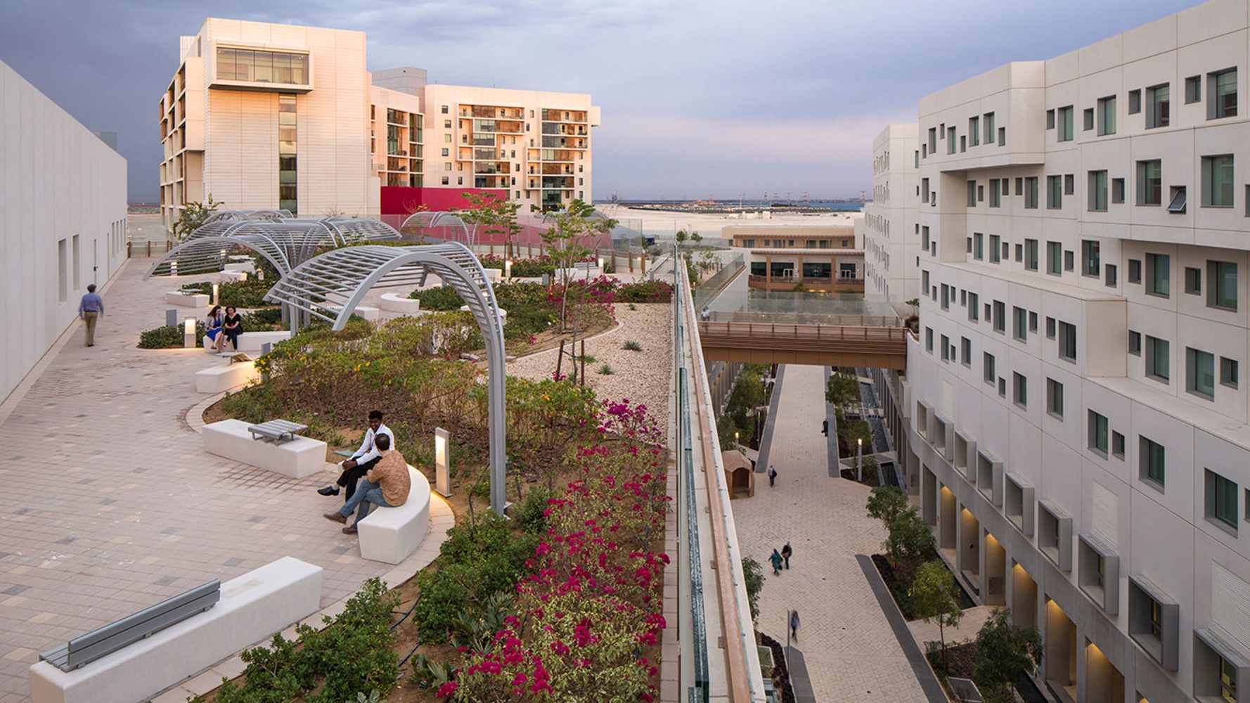 Una red de 29 edificios académicos, residenciales, para el arte, la vida estudiantil y la investigación está dividida en niveles y orientada al peatón e integra las tipologías de planificación regionales y occidentales para crear un microclima confortable que permite que el liberalismo intelectual florezca en el corazón de Oriente Medio.