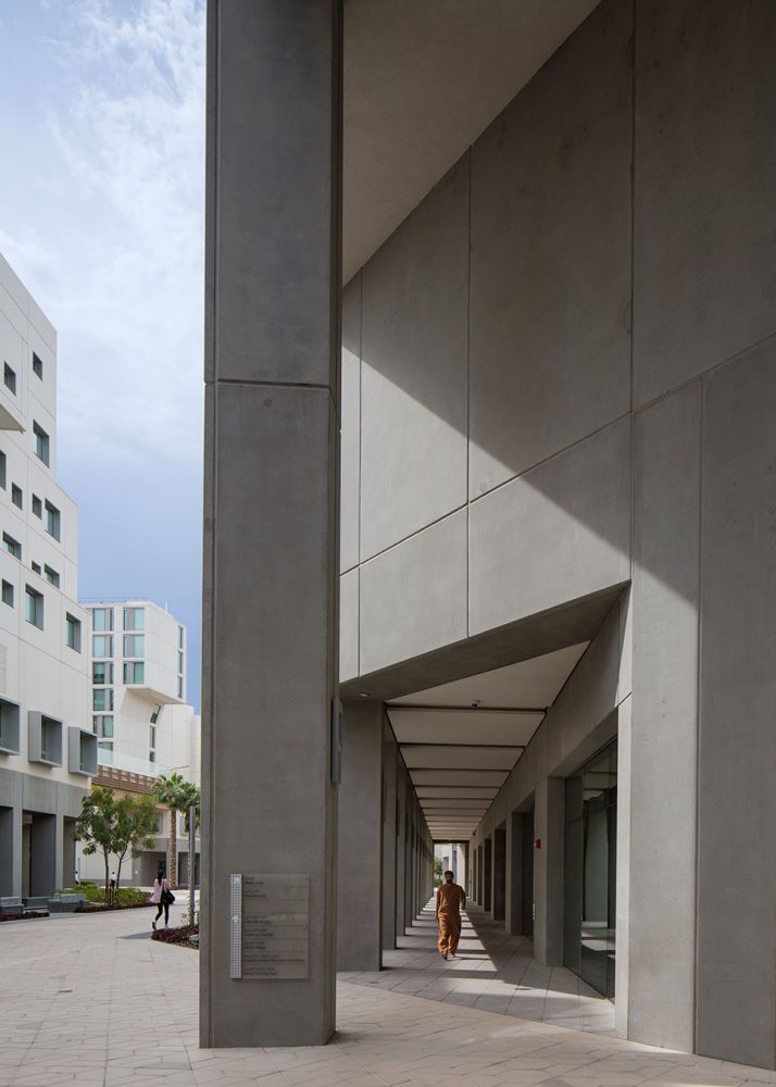 Esta Universidad se planificó desde cero en el contexto de un ambicioso plan urbanístico. Como tal, el proyecto poseía un contexto arquitectónico local limitado con el que dialogar, pero tenía el objetivo de crear un entorno compacto y cómodo para los peatones que estimulara conexiones multidisciplinarias y, al mismo tiempo, se adaptara al clima desértico. El resultado es un campus de dos niveles con calles angostas y una agrupación y volumen de los edificios adaptados para recibir la proporción óptima de sombra y una disposición que aprovecha el viento para facilitar la ventilación natural. El diseño del paisaje urbano se integra en el entorno —con columnatas, vegetación autóctona, celosías y los tradicionales canales de agua— y la morfología urbana para crear un espacio exterior que es cómodo durante todo el año.