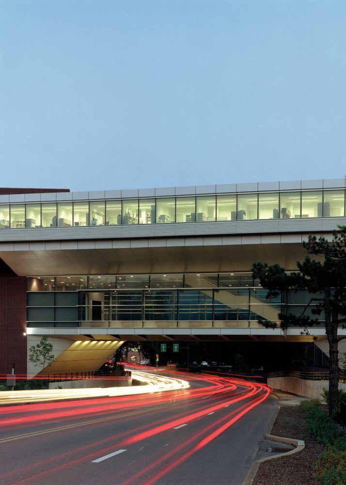 在重新诠释功能的时候,维诺里看到了新的信息科学与技术学院可以成为连接此缺口的桥梁,并统一东部和西部校园的契机。该设计要求占用场地对面与现有场地尺度相近的地块作为额外的基地,从而使一个既是建筑又是桥梁的设施成为可能。设计的目标是使建筑成为桥梁,并通过流动的走道而不是孤立的桥梁元素来连接两侧的宾州州立大学校园。建筑的BIM模型被用于验算建筑下方高速公路上垂直结构安装序列。当这个方案被汇报给宾州州议会主席时,他成为了这个设计方案的积极支持者。