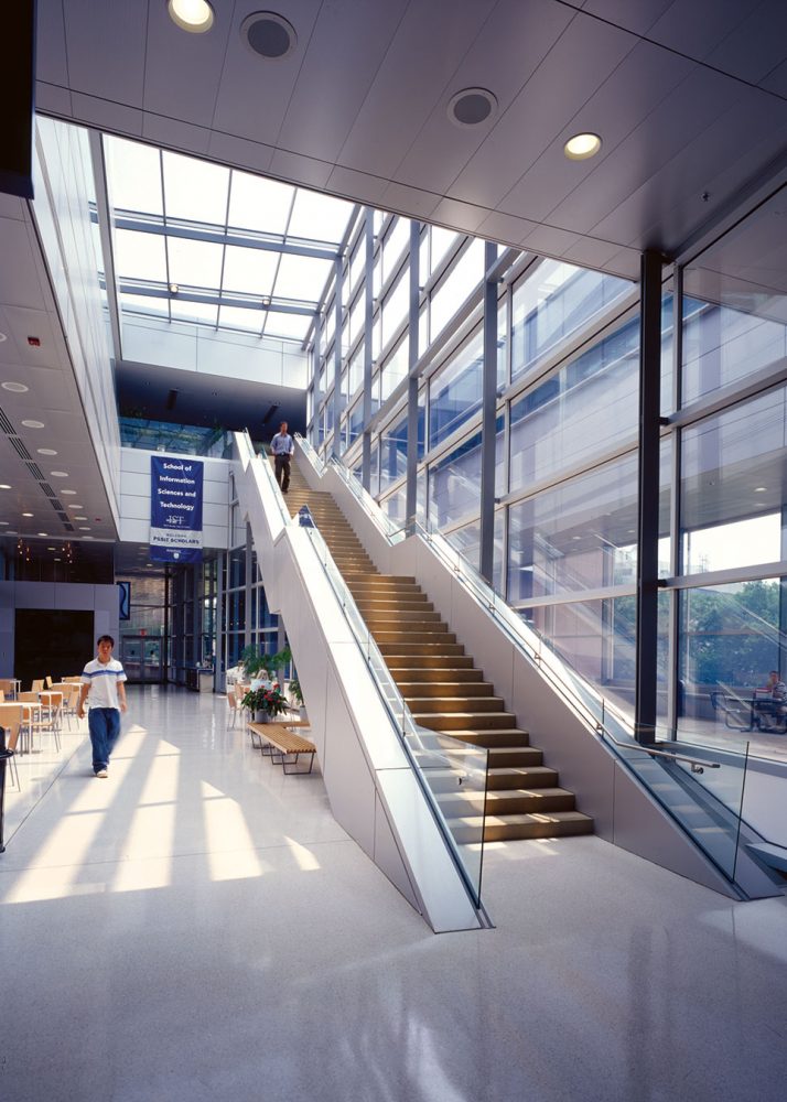 设计延伸了校园中一条重要的流线并将其融入建筑中,成为一个行人步道和自行车道,通道由建筑长边侧一段坡道开始,上升并跨越主要通道,然后通过另一侧的坡道缓缓的降低。沿着这条长廊分布着教室,行政办公室和被称为“Cybertorium”的高科技礼堂。在结构长边的中点,一家咖啡馆提供了一个可以俯瞰校园绿色景观的社交和协作环境。建筑二层悬挂在通道之上,内含研究设施,其中包括计算机实验室和教师办公室。这一层设有灵活的楼板,可以容纳所有的教室和电脑实验室。这些元素汇聚在一起,为800名学生和80名教师和IST的工作人员创造了一个充满活力的新家。