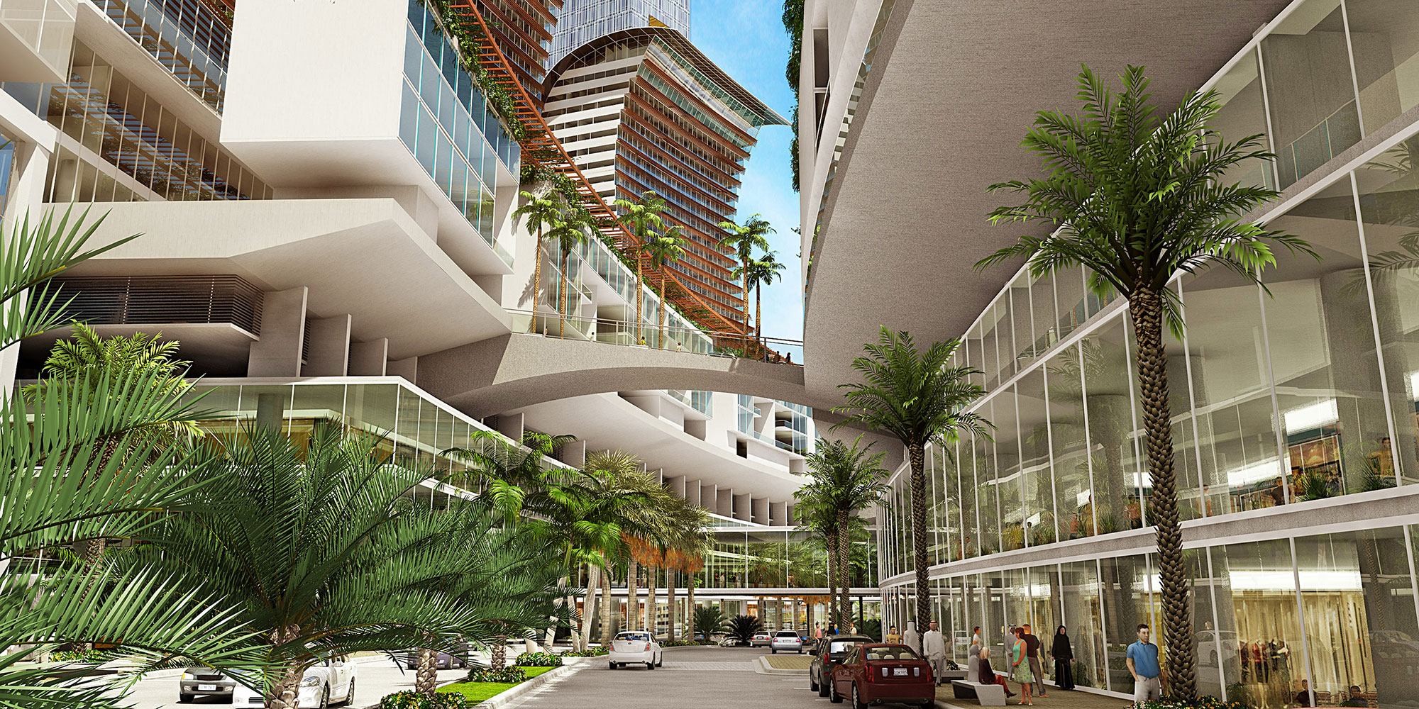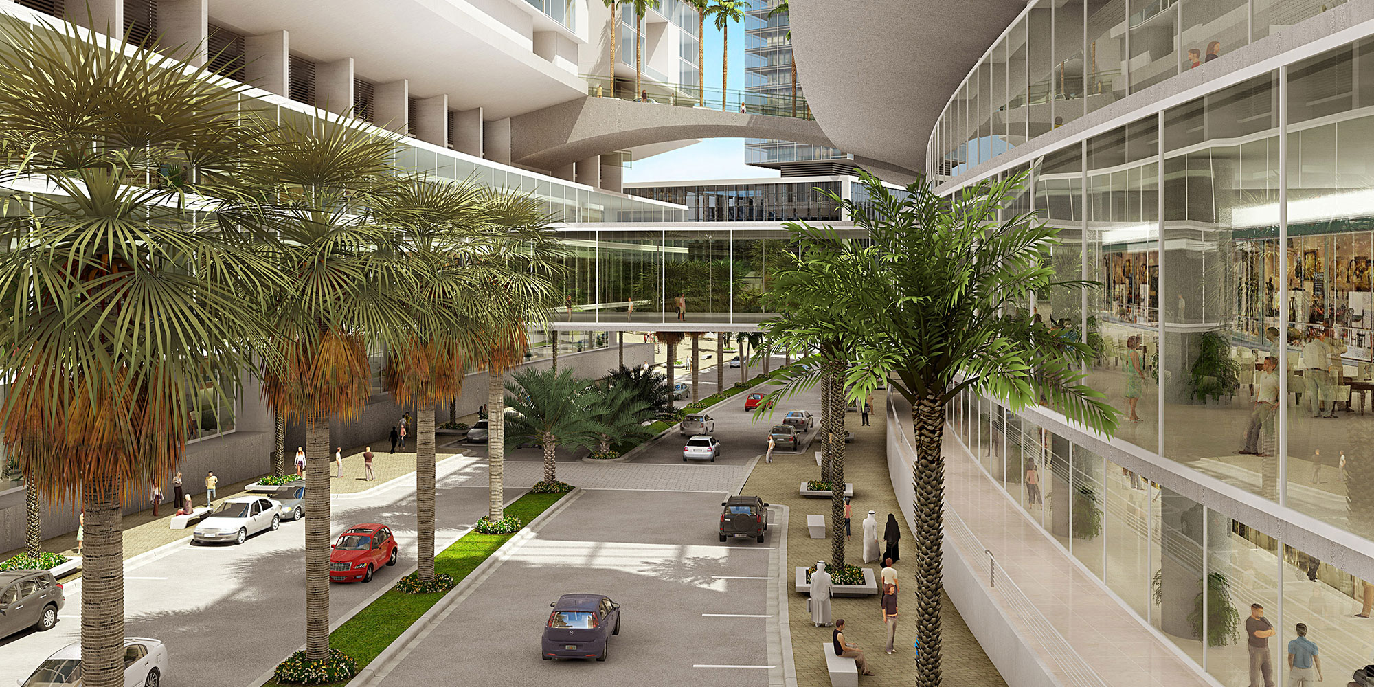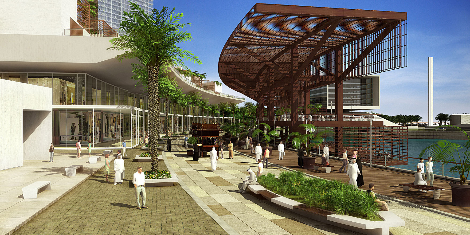 A promenade and a shaded restaurant pavilion define the waterfront, providing dining options, civic space, and visual and pedestrian connections to other districts to reinforce the urban character of the overall development. Inland from the pavilion and promenade lies the island’s primary shopping mall, a four-story complex containing high-end boutiques.