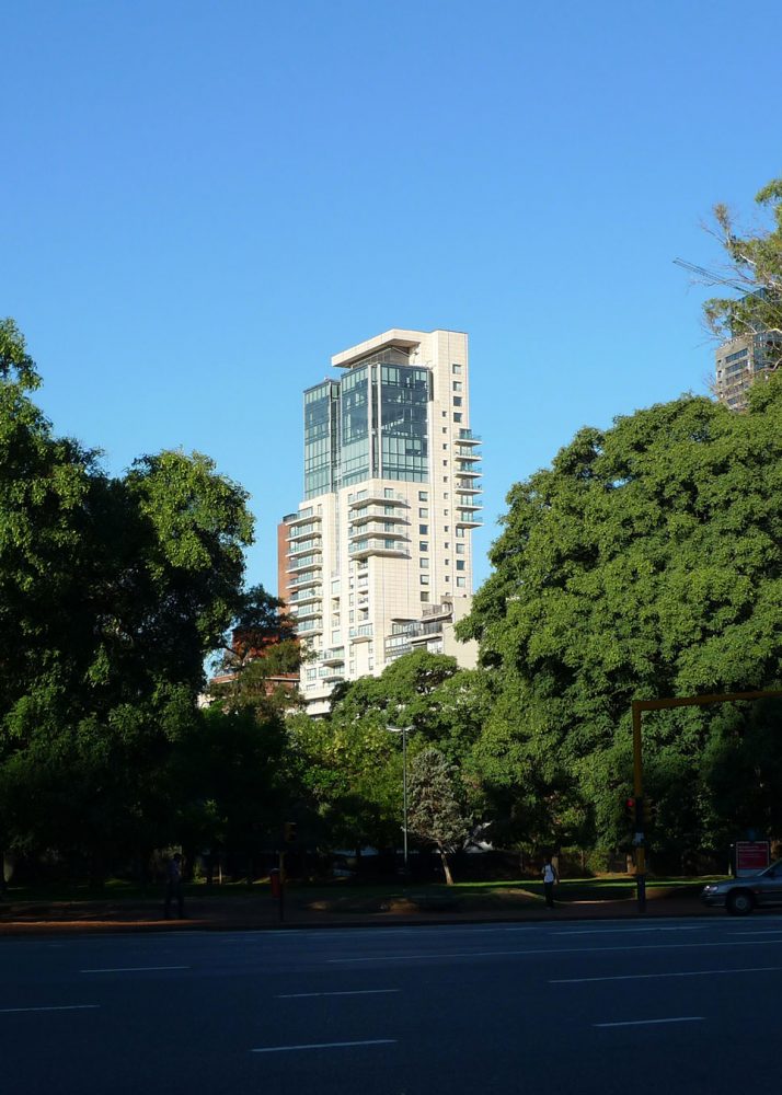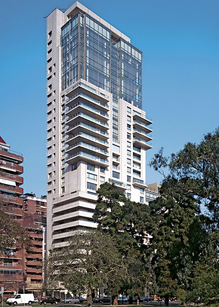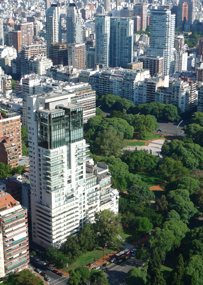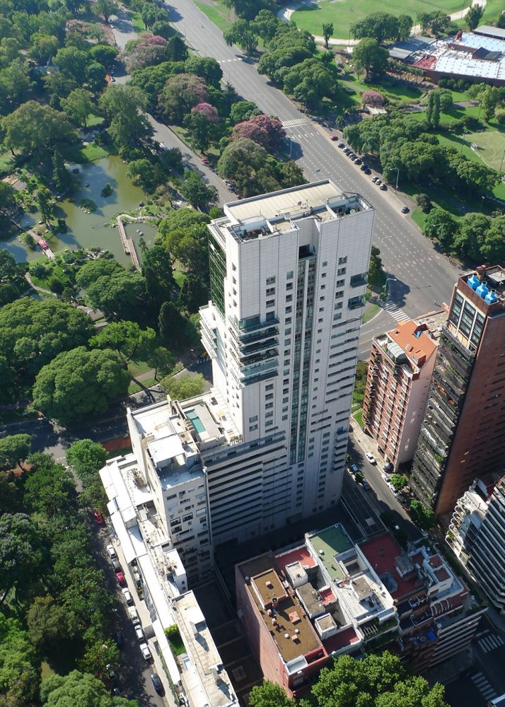 这个33层的豪华住宅由钢筋和混凝土建造,外墙使用灰岩,玻璃和铝合金,位于布宜诺斯艾利斯高档住宅区的传统日本花园的边缘。建筑基地占据了一个居住街区的前沿,延伸向Parque Tres de Febrero,让租户可以在三面俯视公园。