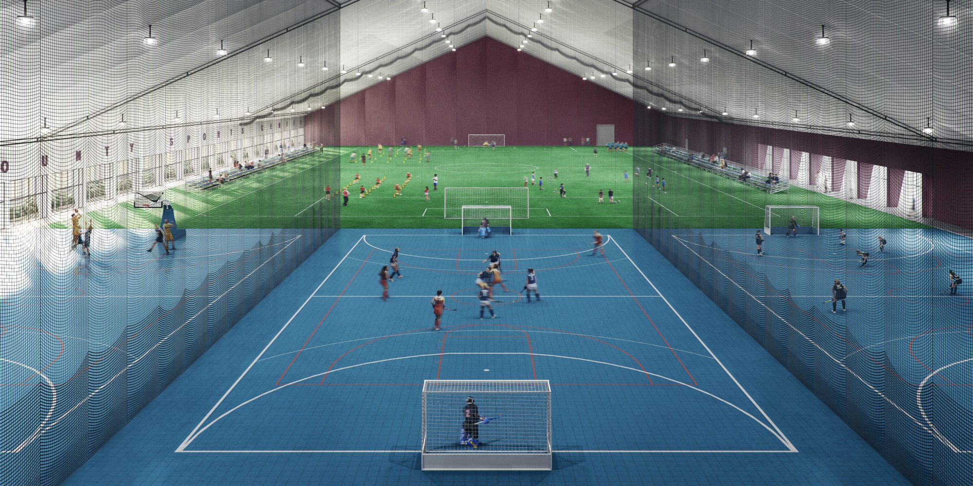 The Sussex Sports Center Foundation (SSCF) Indoor Facility will provide a space for indoor practice and exercise during the winter and inclement weather. The SSCF Indoor Facility has been designed, initially and primarily, to accommodate youth soccer, lacrosse, and indoor field hockey. Secondary uses of the SSCF Indoor Facility will include basketball, volleyball, pickleball, perimeter walking, and local assembly events.