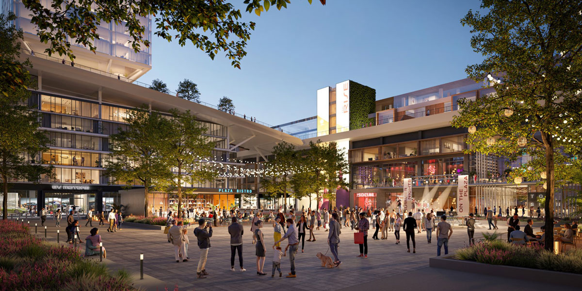 The project was driven by several overarching objectives, including clearing an existing mall, a bridged superblock; integrating the site by breaking it down into pedestrian-friendly blocks; creating a civic icon, and introducing a dynamic mixed-use environment for neighbors and visitors. The ground level blocks contain a variety of retail, restaurant, and entertainment amenities that face the street and surround multi-story integrated parking garages at the centers of the blocks. An undulating roof above reduces the apparent massing of the development.