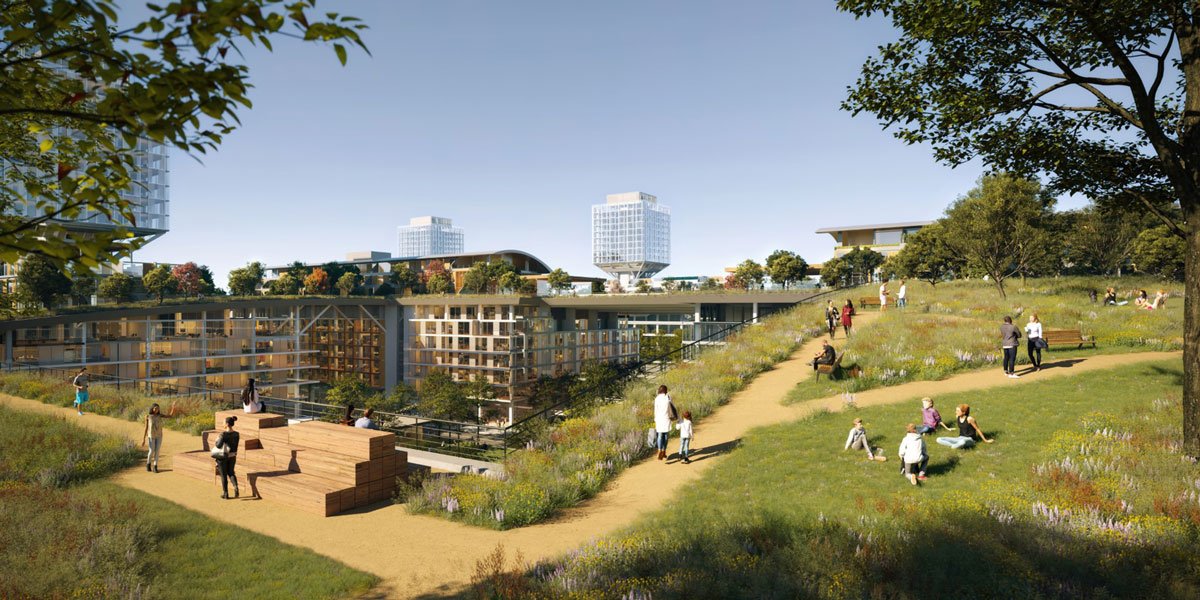 The largest green roof in the world will shelter a 769,140-square-meter mixed-use complex under a 30-acre, fully accessible public park that restores the pre-development character of the Cupertino landscape.