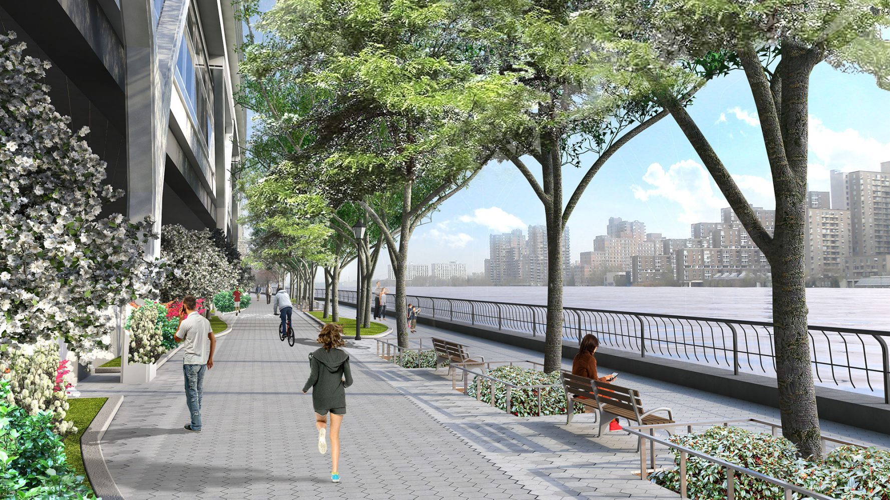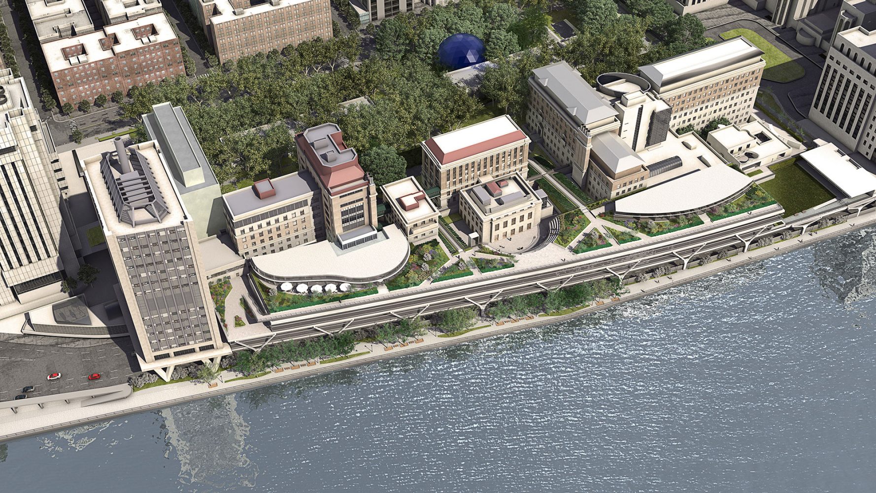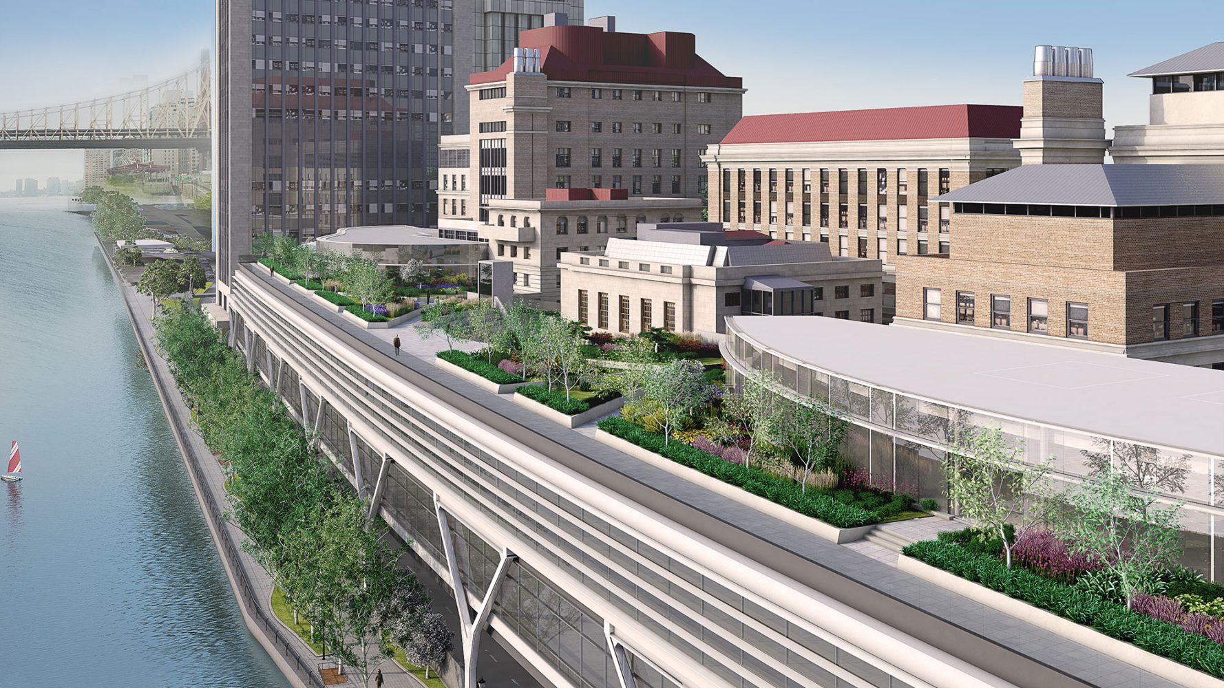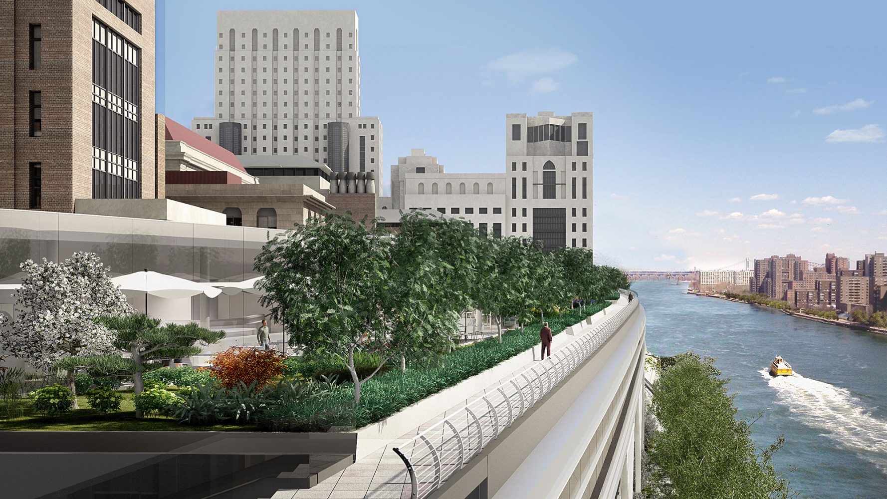 Los nuevos laboratorios, las instalaciones educativas y servicios del campus se disponen en un edificio horizontal que se extiende a modo de puente sobre la autovía FDR adyacente y amplía generosamente los emblemáticos jardines de la Universidad hasta la orilla del East River.