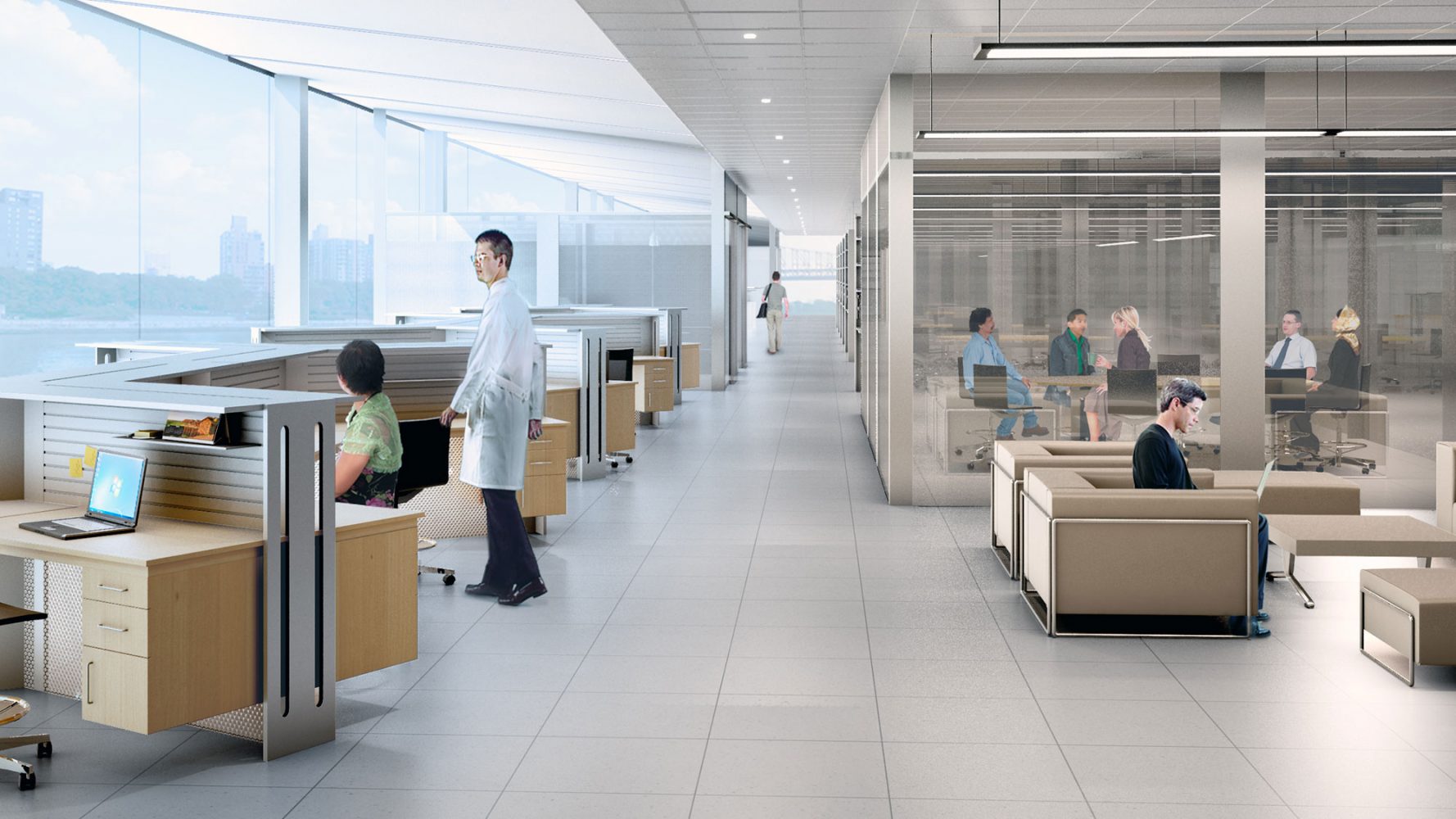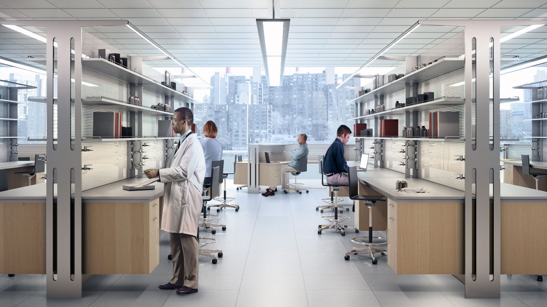 El diseño de Viñoly para el laboratorio refleja la necesidad de la Universidad de contar con un espacio flexible que facilite la ampliación y reducción de los equipos de investigación, permita futuras modificaciones de las prácticas científicas y la evolución de programas de investigación individuales, así como la provisión de componentes estandarizados de equipamiento de laboratorio costo eficientes que cada usuario pueda personalizar razonablemente. El núcleo y la envoltura del edificio se diseñaron para que los laboratorios abarcaran la máxima superficie posible dentro del área construida en el limitado campus urbano y así satisfacer la necesidad de más espacios auxiliares para los laboratorios. Para el equipamiento de los laboratorios, Viñoly elaboró un sistema de puntos de acceso a suministros y redes que ofrece a la Universidad la mayor flexibilidad posible para reconfigurar las mesas del laboratorio y espacios de redacción, oficina y apoyo.