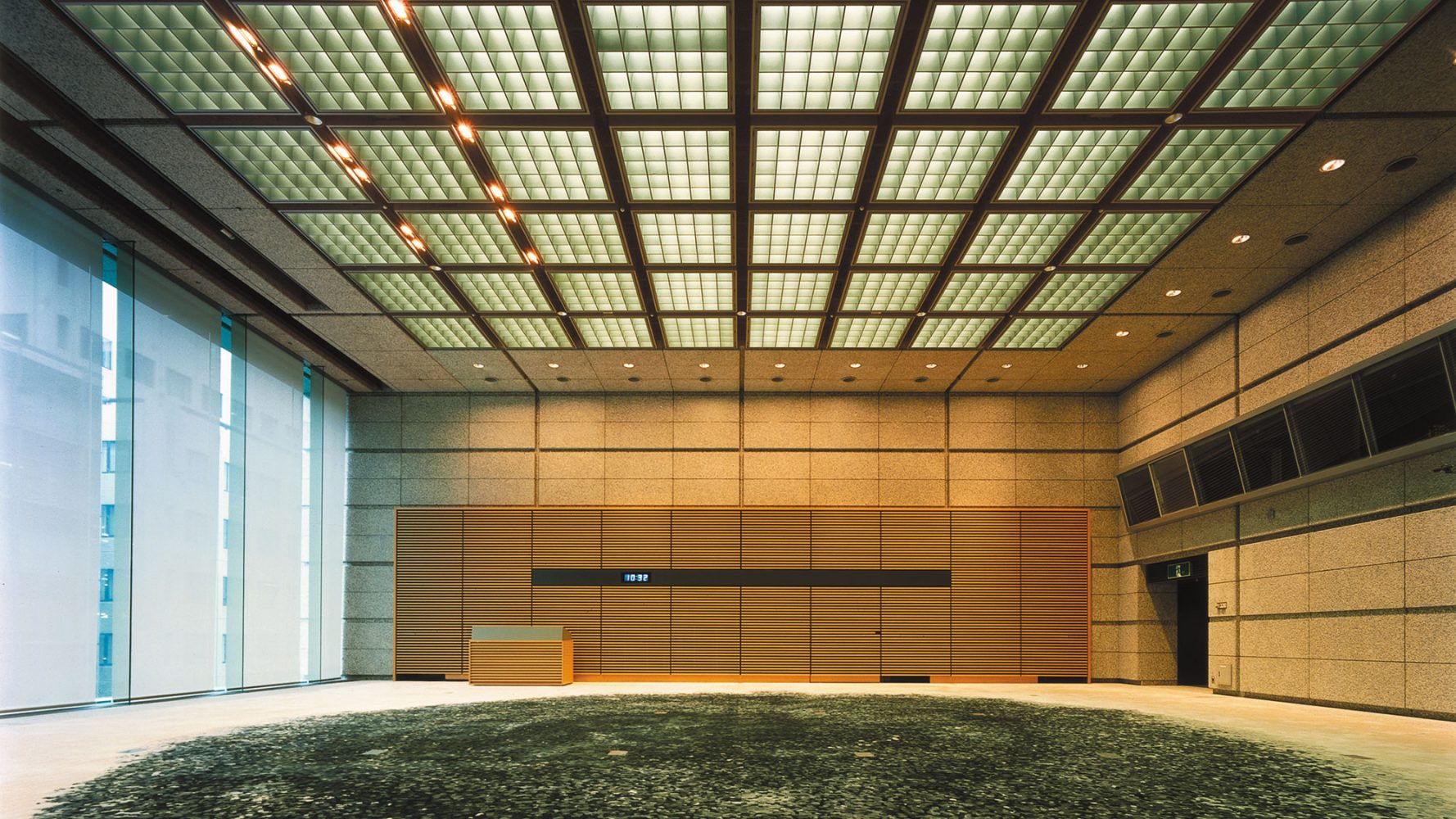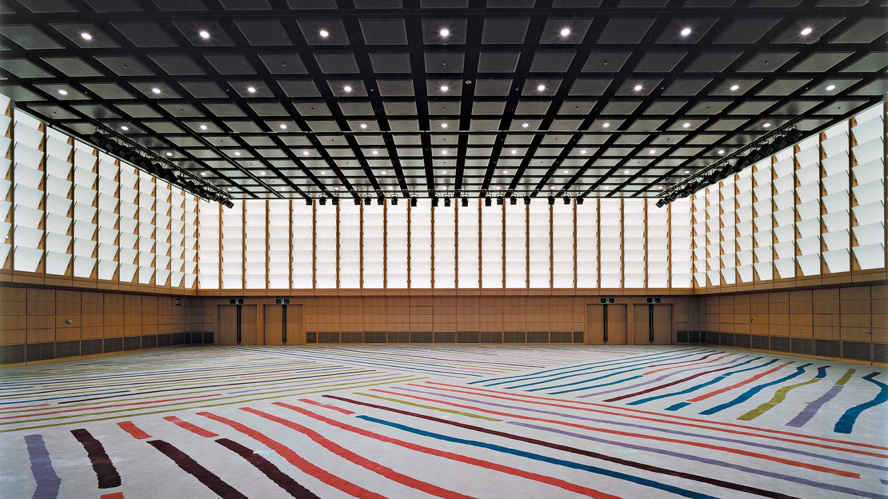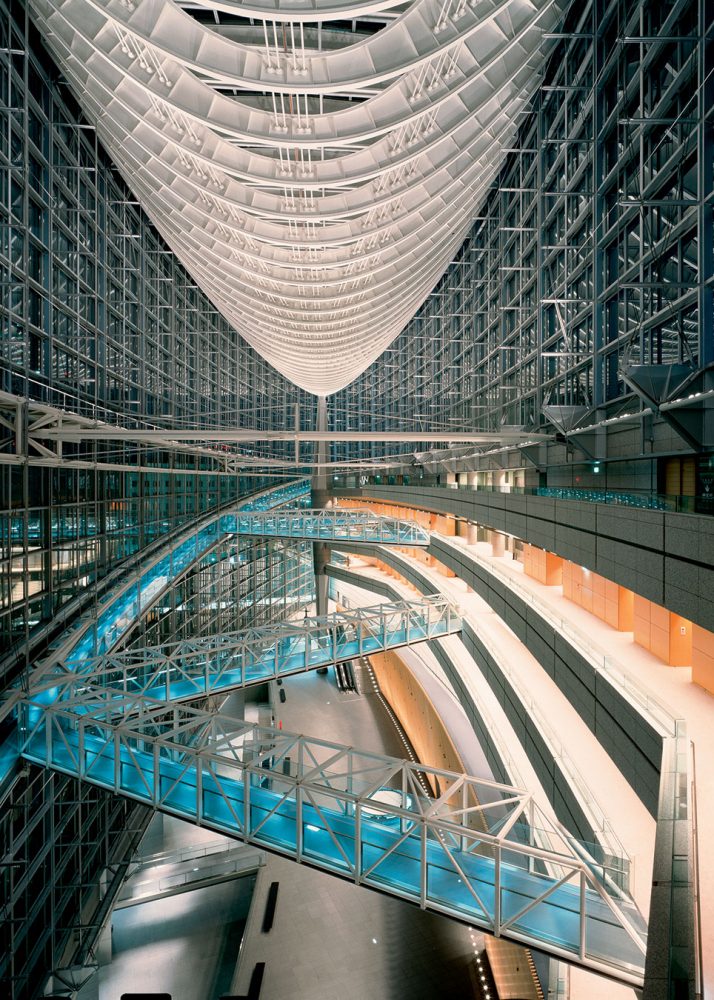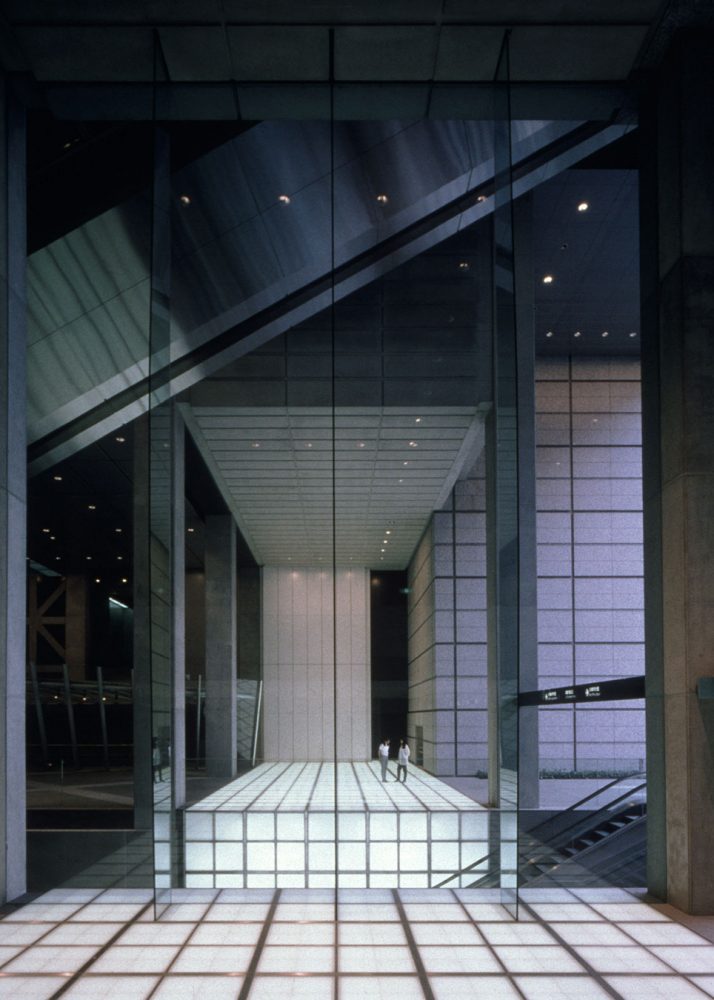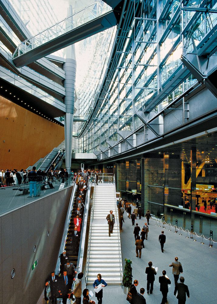 这个玻璃大厅,是有史以来日本最大胆和富有想象力的建筑之一,包含两个相交的玻璃和钢的椭圆,围合成一个巨大的中央大堂,汇聚了建筑的元素。这种夸张的结构包含了地上七层和地下三层。大厅的玻璃幕墙60米(197英尺)高,用像薄纱一样的热增强夹层玻璃,从屋顶悬挂而下。尽可的透明的玻璃幕前,实现了剧场和广场到承载着会议中心的弧形花岗岩墙面的视觉连接。