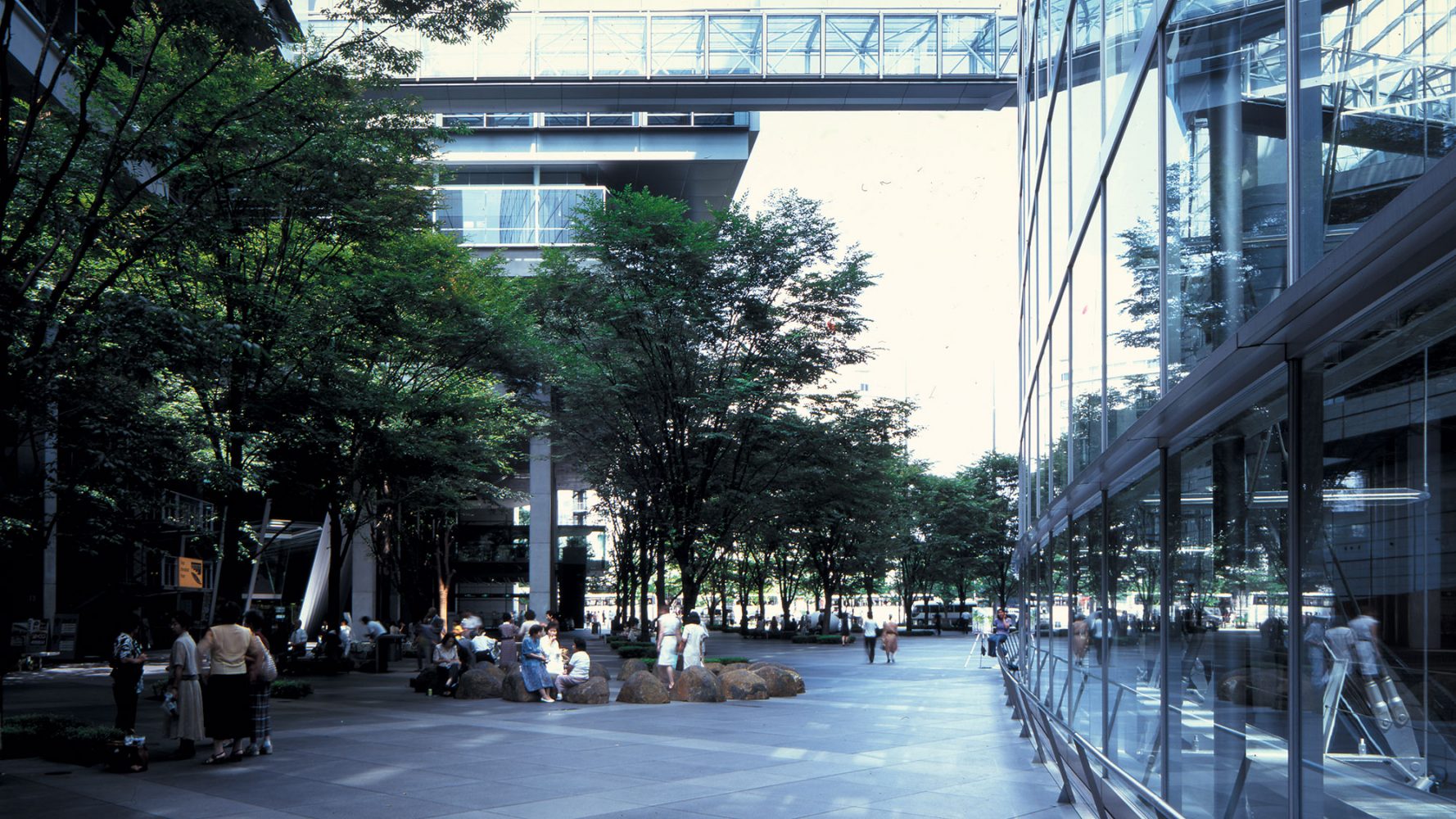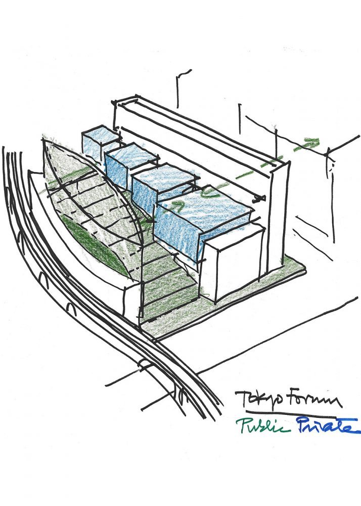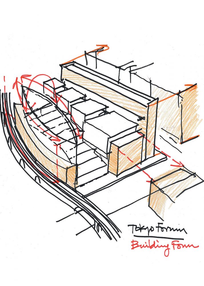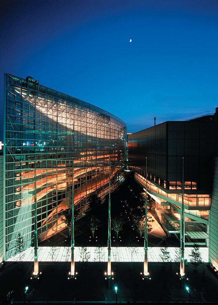 设计的目的是要建立一个既能允许大量公众进入又可隔绝周围环境的影响的区域。周边的花岗岩墙体围合成一个延伸到四个主要的表演艺术空间地下的景观城市广场,在场地西边和逐渐减小的体量对应。剧院大厅为公共用途的市民广场提供了连续的视野。沿着基地的东部边缘,广场从视觉过滤到玻璃大厅;大厅是一个巨大的玻璃体量,上方有228米(750英尺)长的巨大桁架组成。到了晚上,灯光反射出屋架肋骨表面,使得结构变化成一个整体浮动光源,照亮了玻璃大厅,融入了东京的天际线。