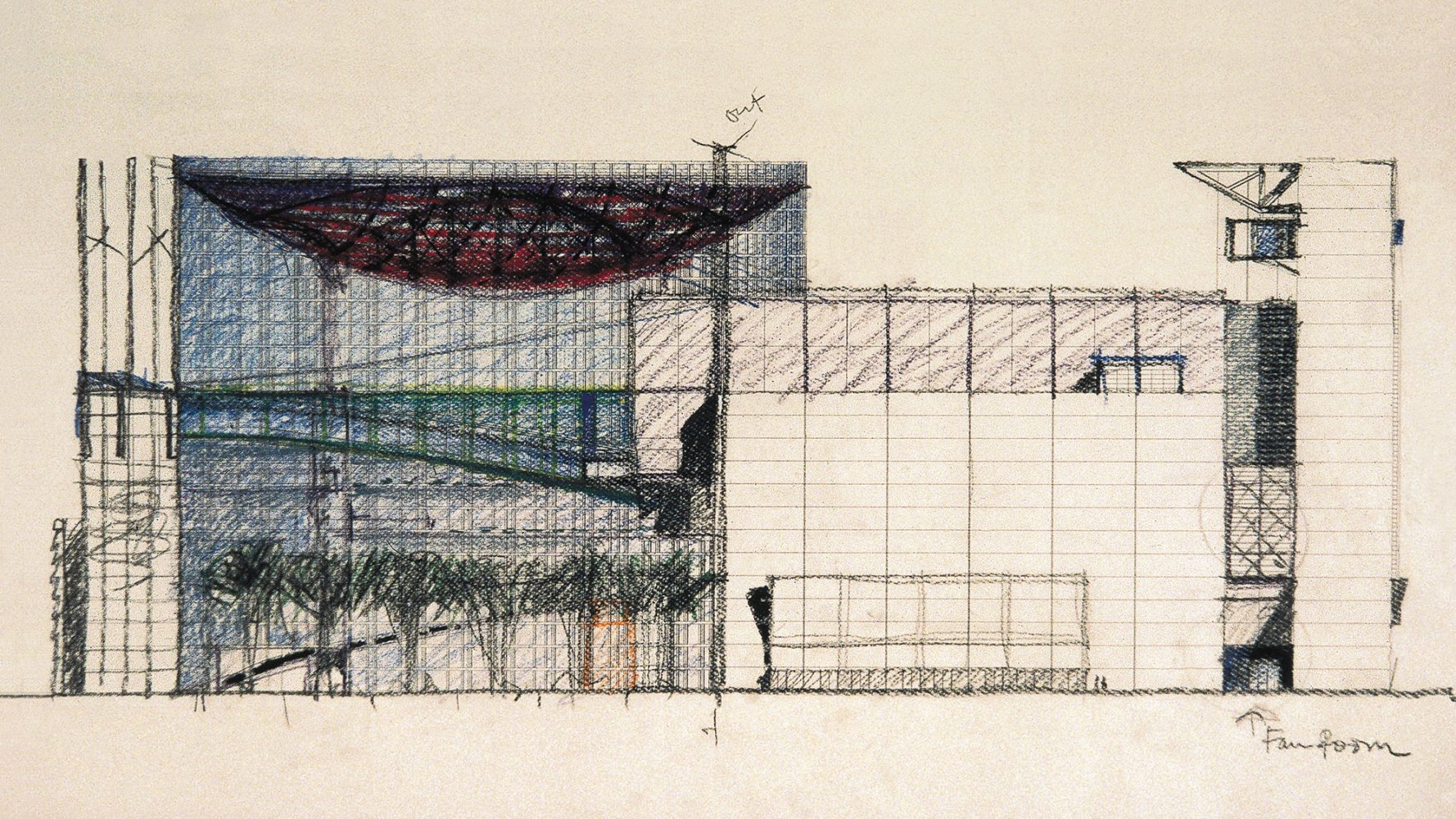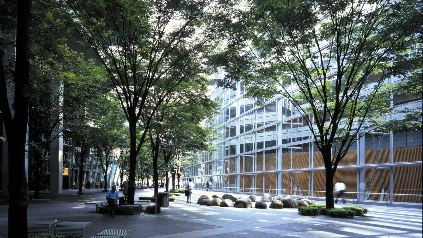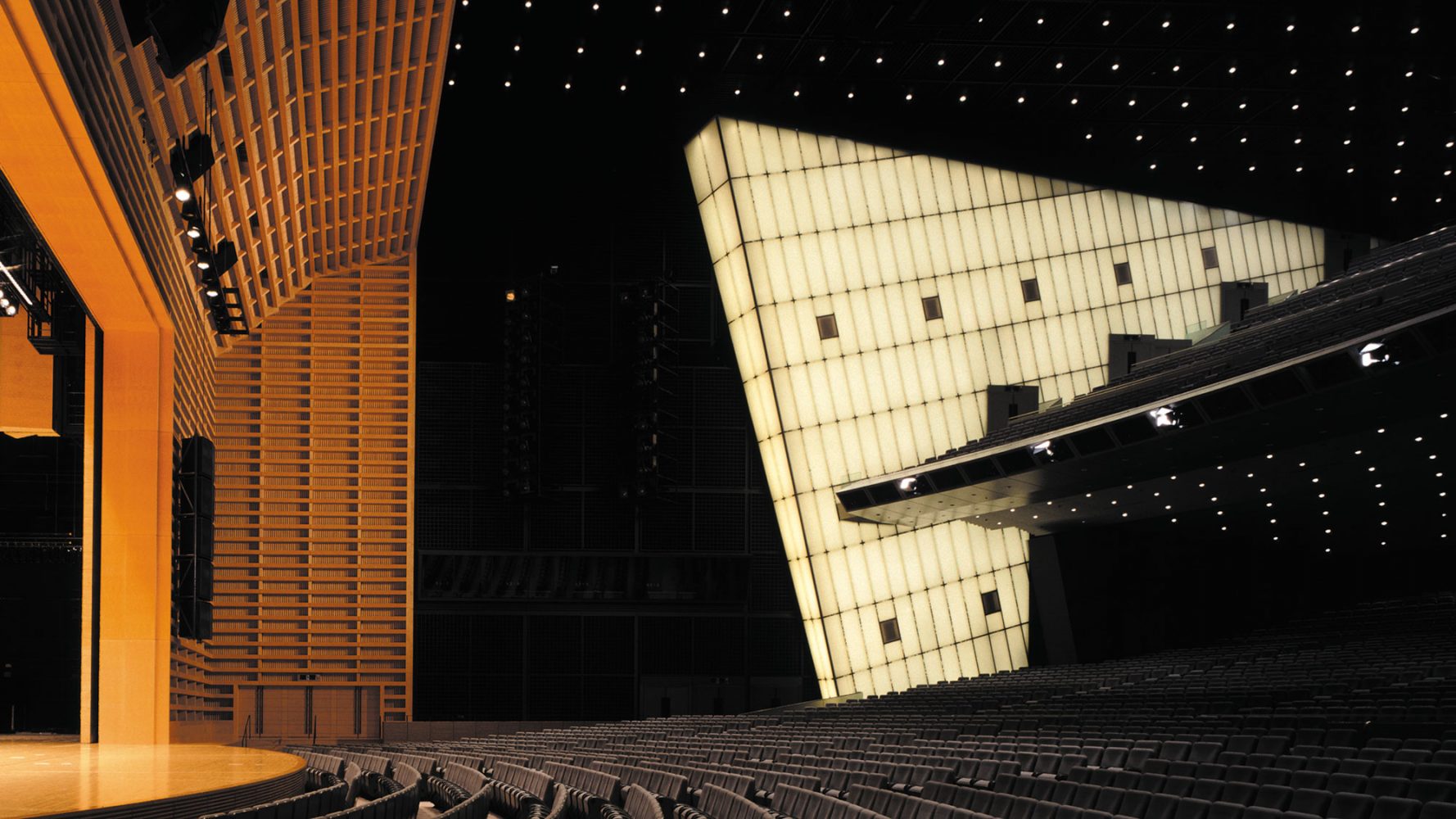 设计的目的是要建立一个既能允许大量公众进入又可隔绝周围环境的影响的区域。周边的花岗岩墙体围合成一个延伸到四个主要的表演艺术空间地下的景观城市广场,在场地西边和逐渐减小的体量对应。剧院大厅为公共用途的市民广场提供了连续的视野。沿着基地的东部边缘,广场从视觉过滤到玻璃大厅;大厅是一个巨大的玻璃体量,上方有228米(750英尺)长的巨大桁架组成。到了晚上,灯光反射出屋架肋骨表面,使得结构变化成一个整体浮动光源,照亮了玻璃大厅,融入了东京的天际线。